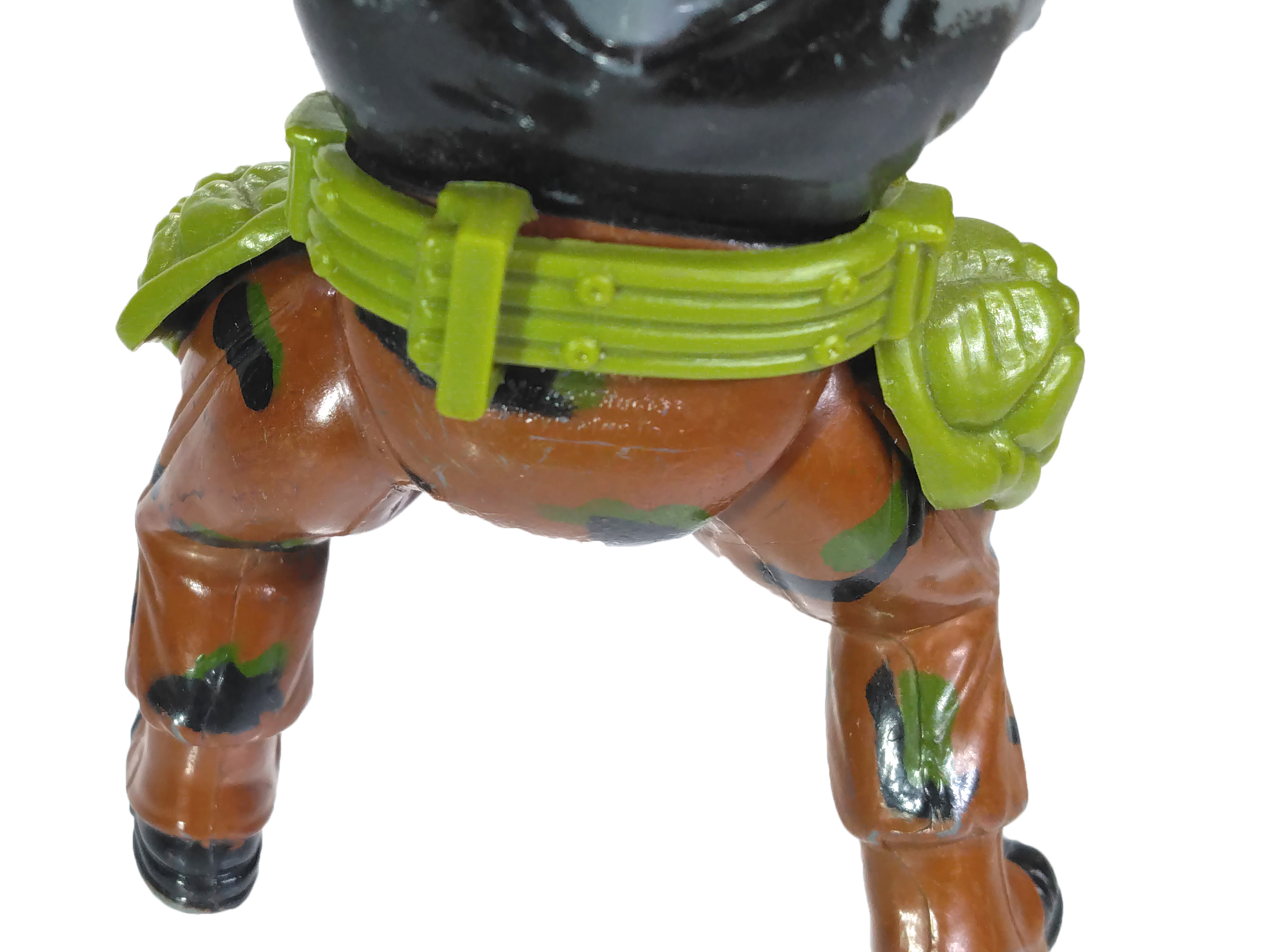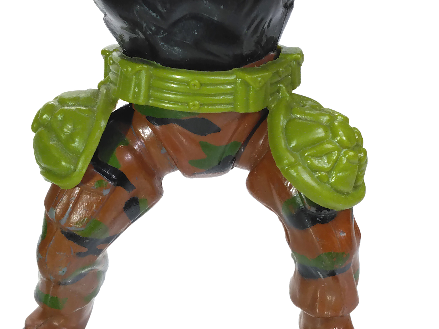 Rocksteady’s fieldglasses survey the area for anything that looks like a Turtle. (He’s mistakenly blasted six soccer balls). This G.I. rockhead blatantly displays his victory kills with the Turtle scalps he wears around his blet.