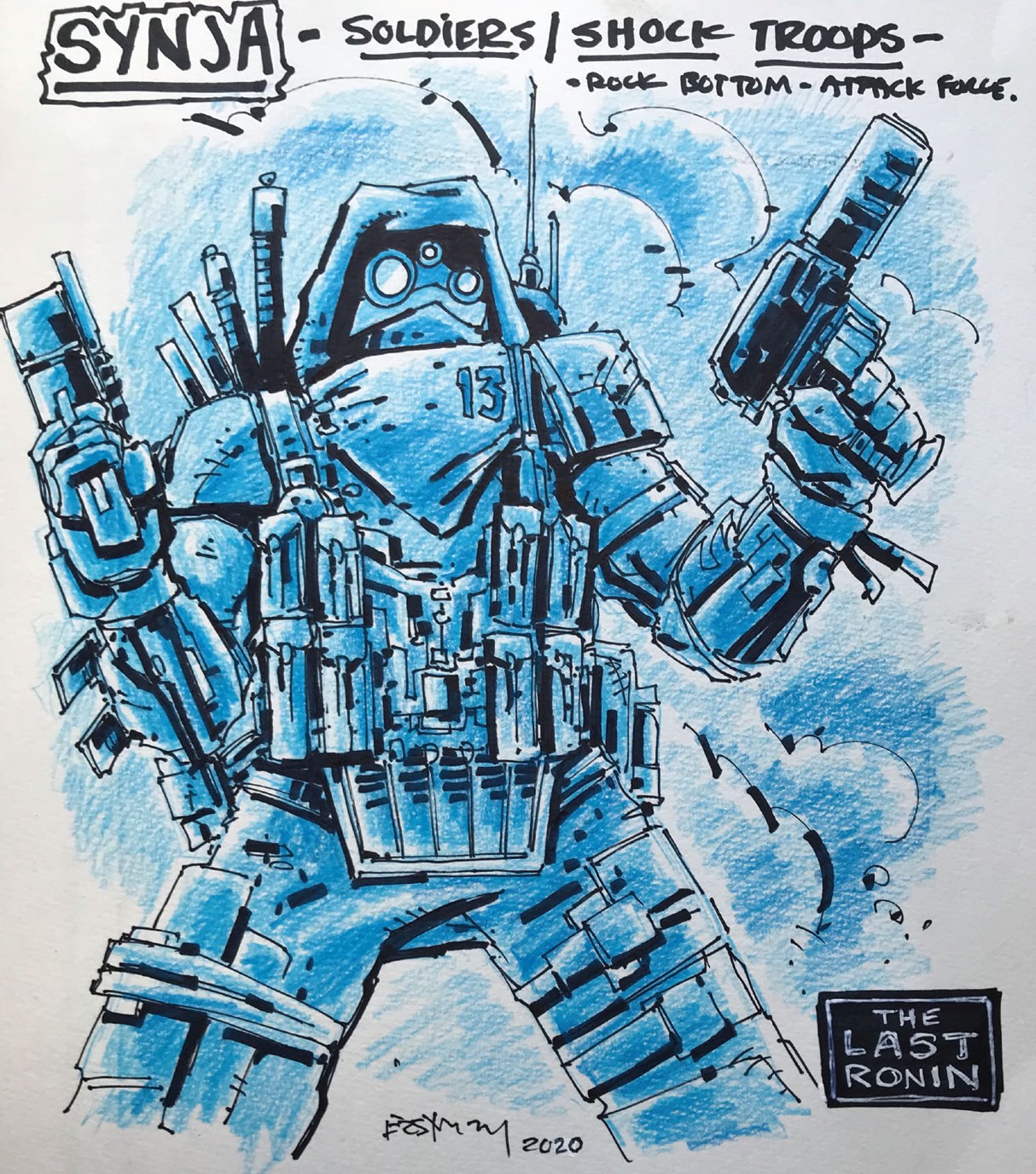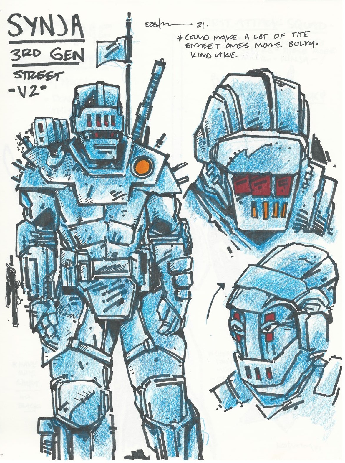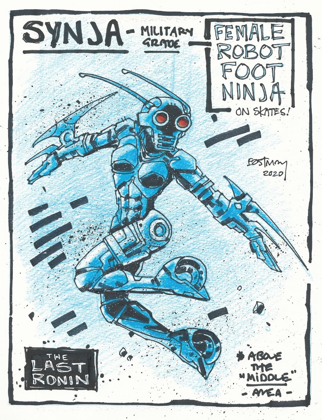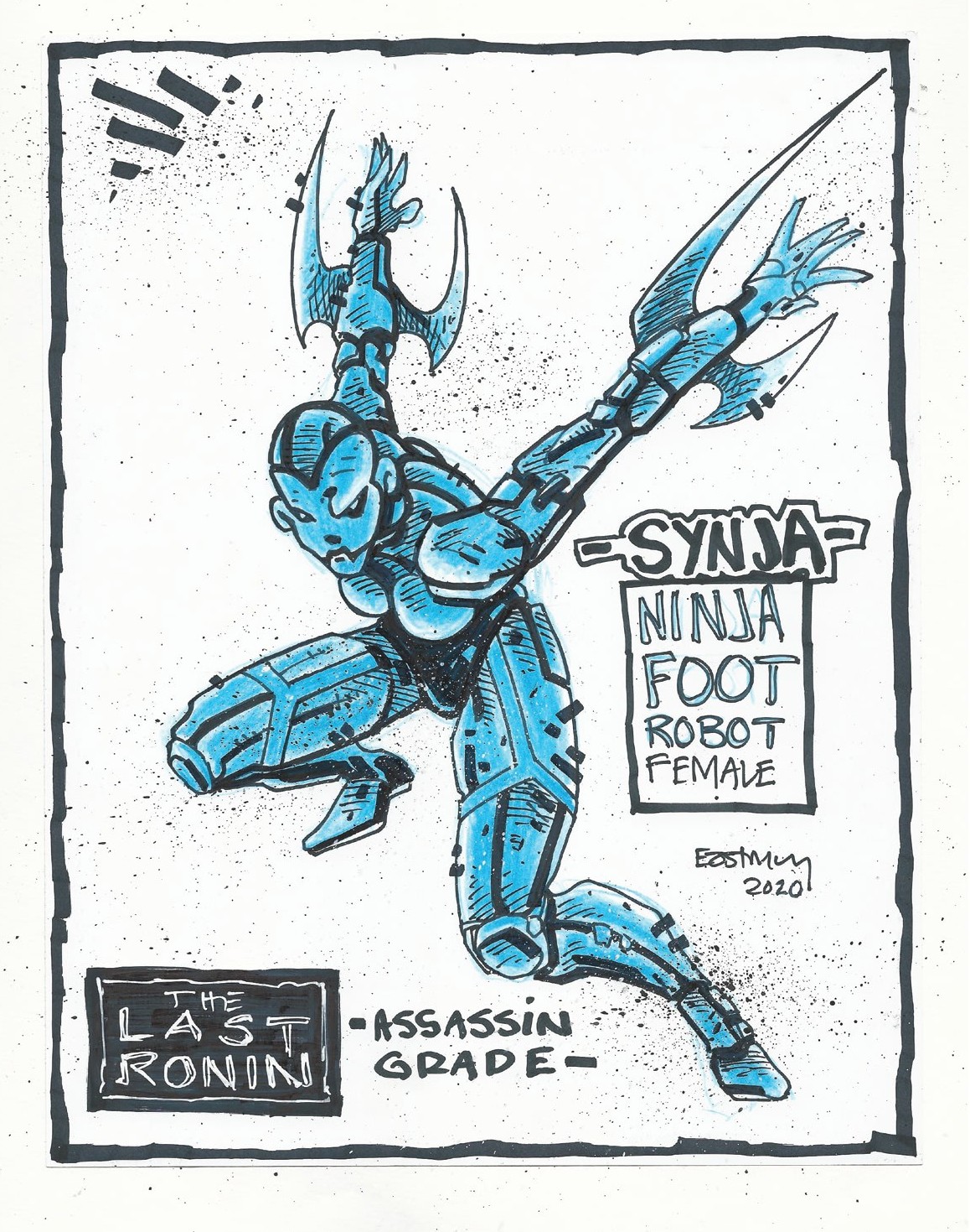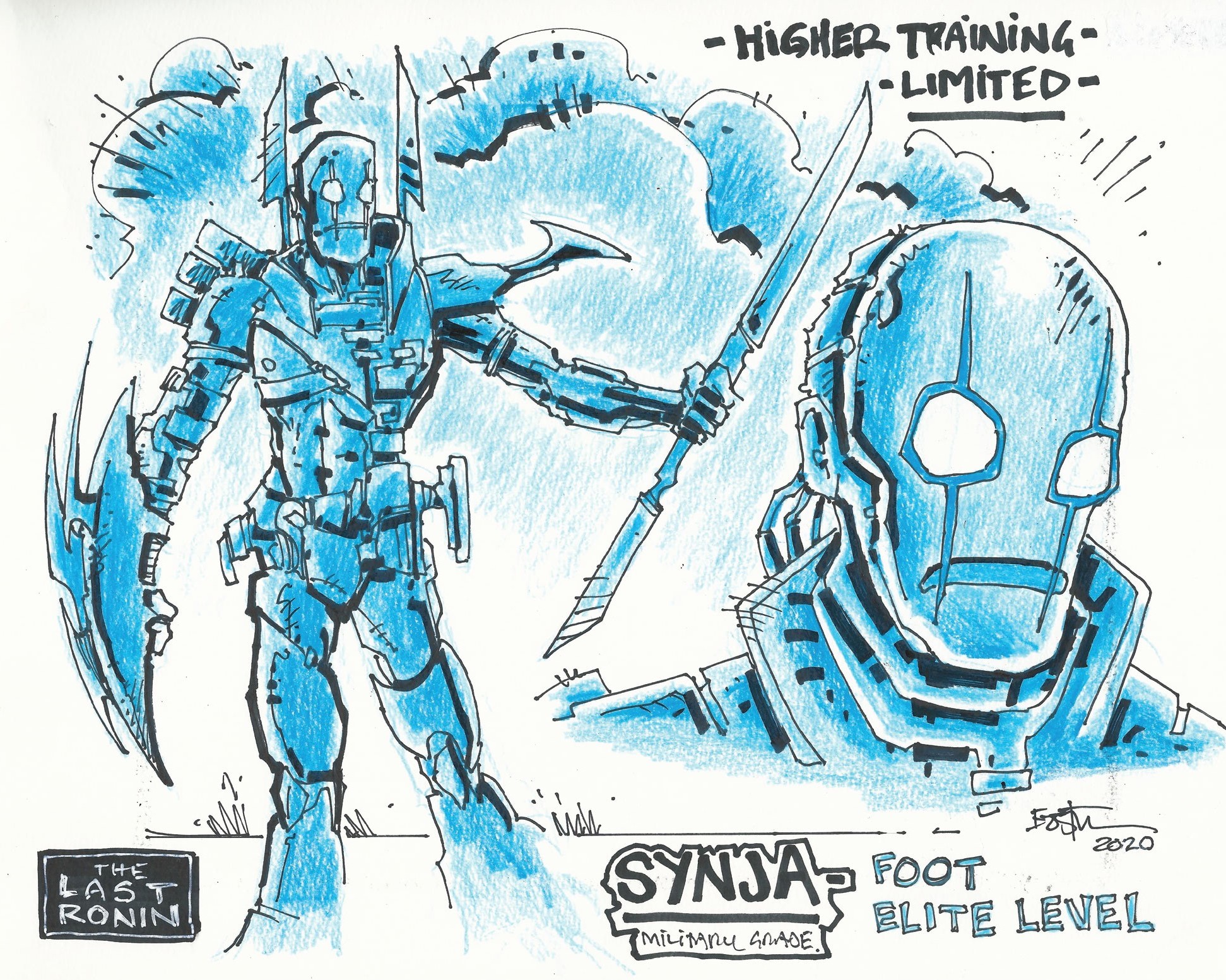 - Plusieurs versions des synjas ne sont pas montrées dans The last ronin, mais ont bien été créées par Kevin Eastman : les synjas assassins. Ces robots, à l’apparence féminine, semblaient très rapides et surtout agiles. Leurs bras étaient munis de lames (The last ronin – design archives #1). Mais aussi des synjas pour des combats de rue (troupes de shock) ou encore une version de troisième génération (voir les concept arts ci-dessous).