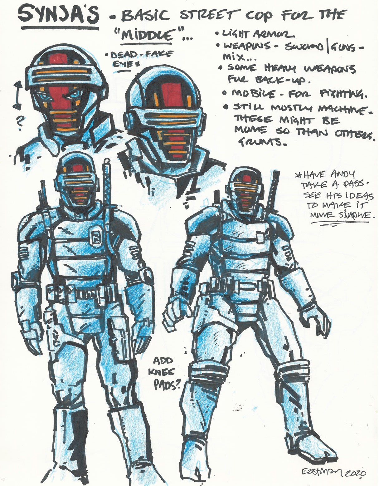 Ces robots revêtaient une armure similaire aux synjas patrouillant dans les rues, toutefois ils étaient plus perfectionnés et destinés réellement au corps à corps. Certains portaient une tenue en kevlar noire, d’autres non et maniaient aussi bien le sabre que les armes à feu (The last ronin #1).