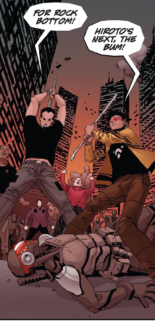 Lorsque Michelangelo revint à New York, autour de 2045, il s’attaqua en premier lieu à ces machines, craignant d’avoir à faire à des policiers en armures à ses trousses. Comprenant qui elle affrontait, la tortue se montra bien moins clémente. Hiroto, pour s’assurer du massacre de la tortue, ordonna à ses synjas de fouiller la ville (The last ronin #1) puis y instaura la loi martiale afin de retrouver la tortue vengeresse (The last ronin #3).