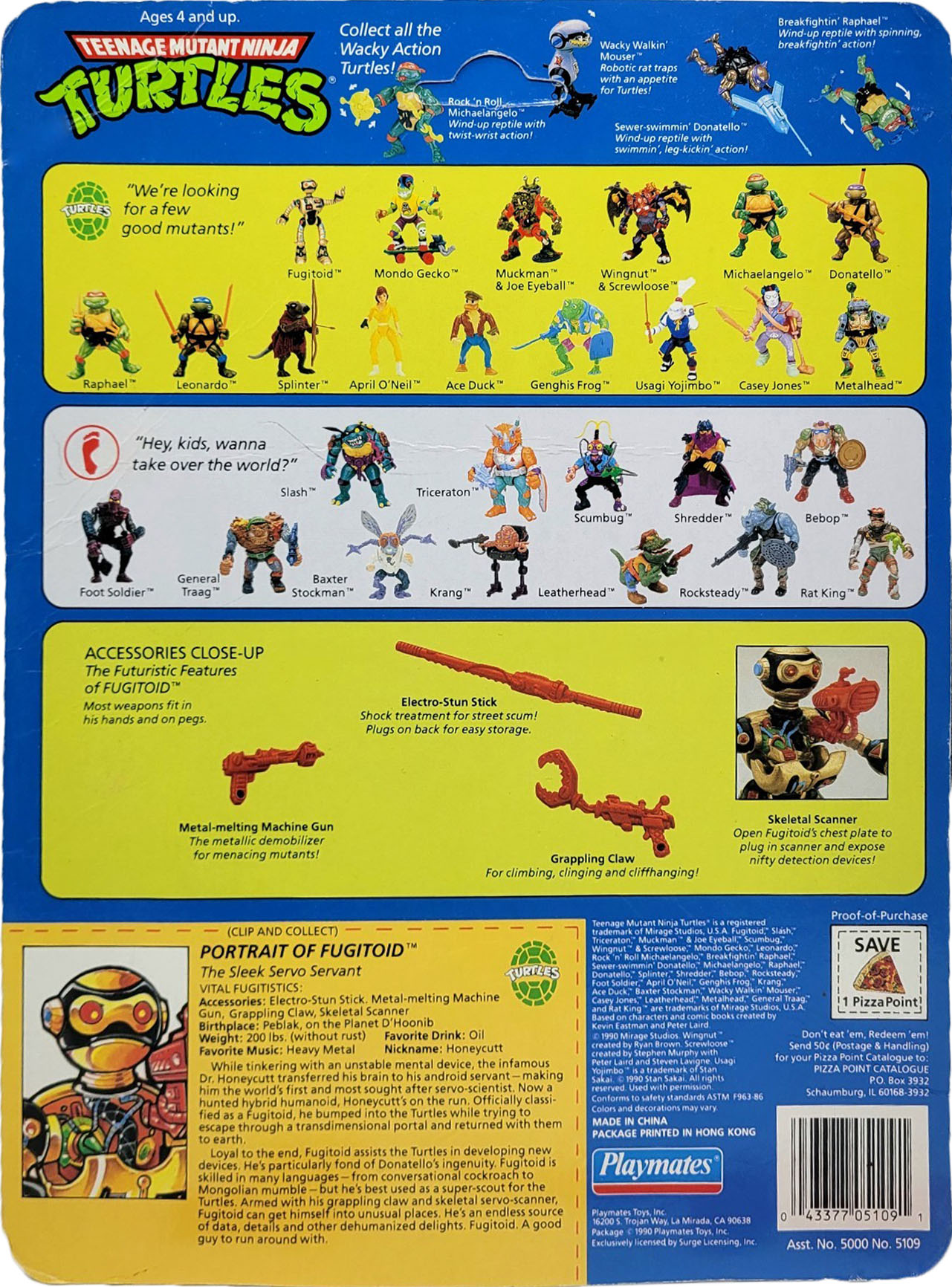Dorénavant, Playmates Toys se focalise uniquement sur les figurines, avec la disparition de la promotion du Retromutagen ooze. La frise qui revenait sur l’origine des tortues et de Splinter a également disparu. À la place, nous retrouvons quatre frises présentant les personnages et les possibilités du Fugitoid.