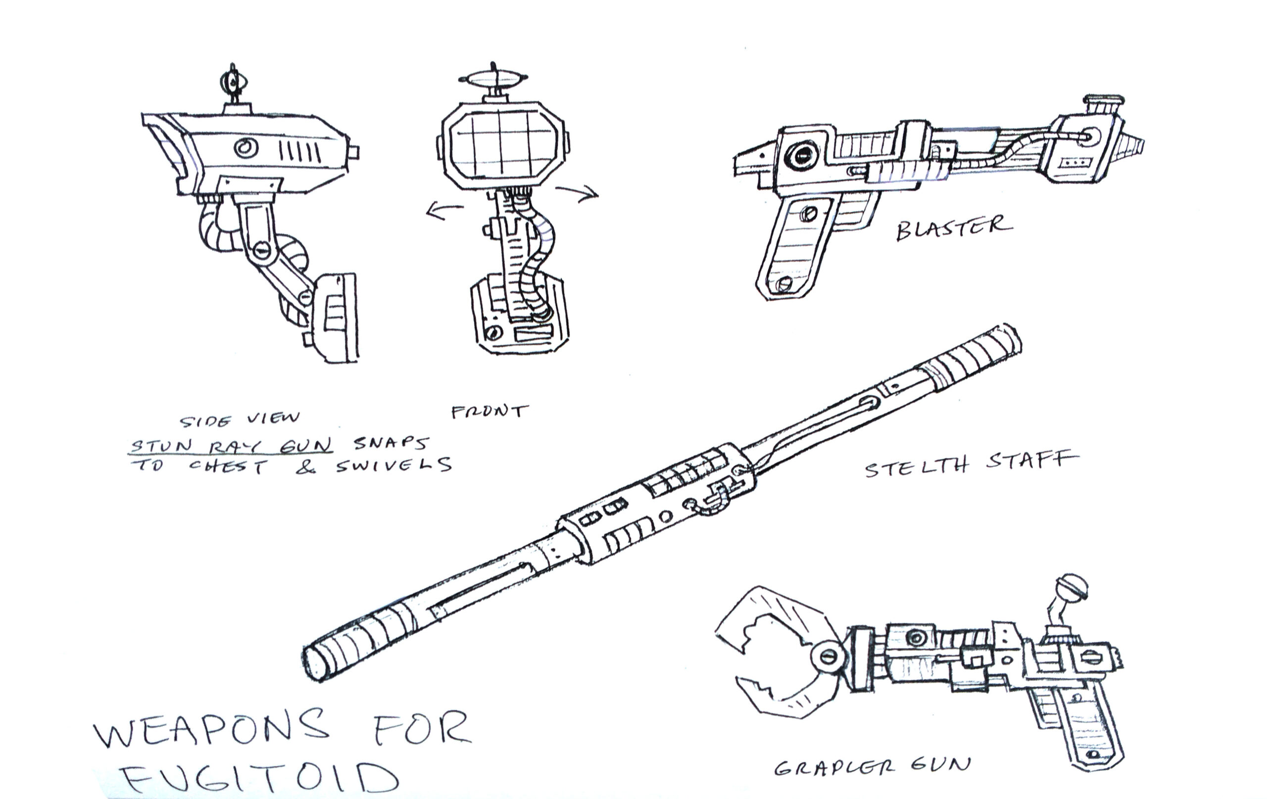 Le Fugitoid est accompagné de quater accessoires, un bâton, un pistolet laser, une pince et un scanner.