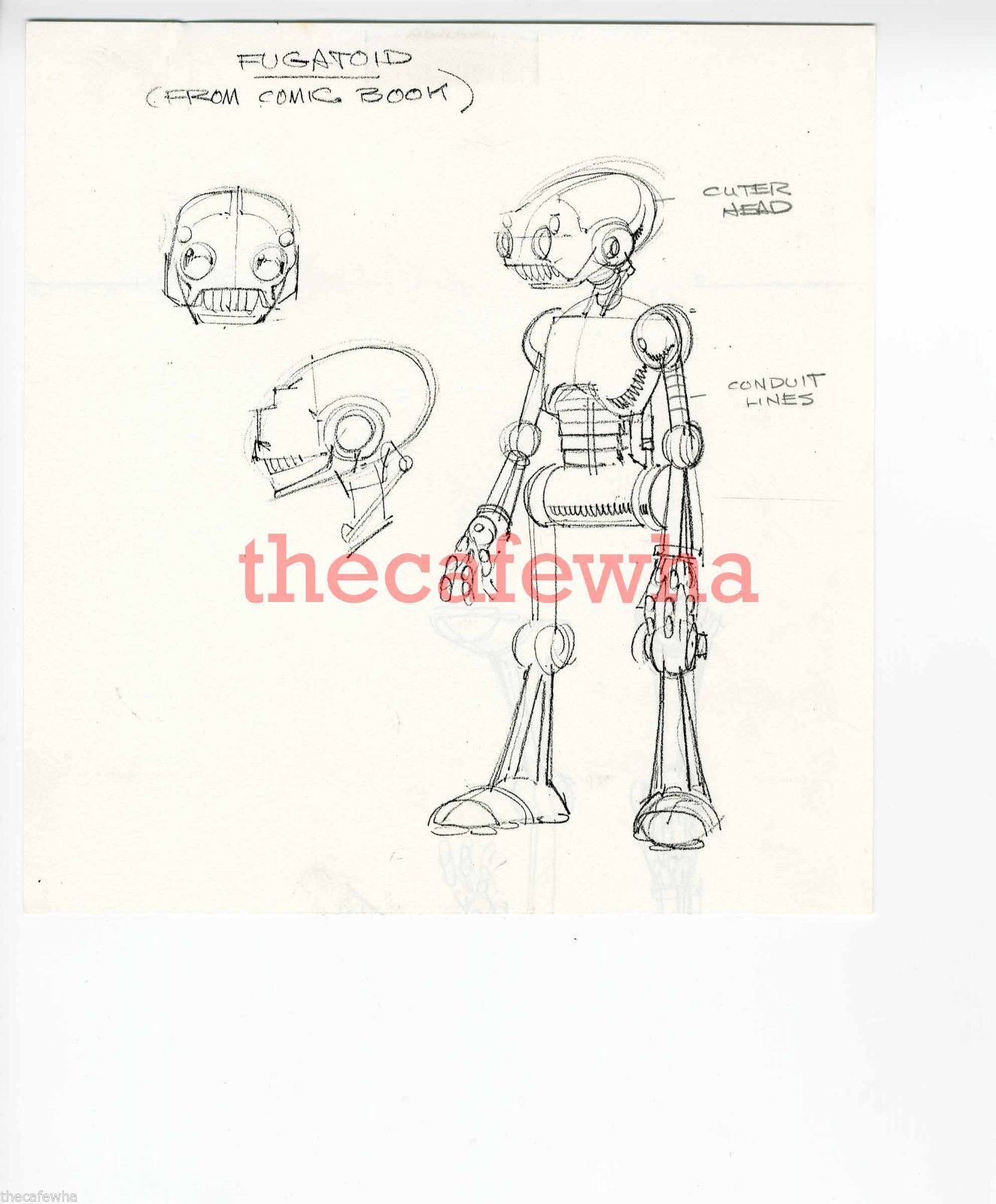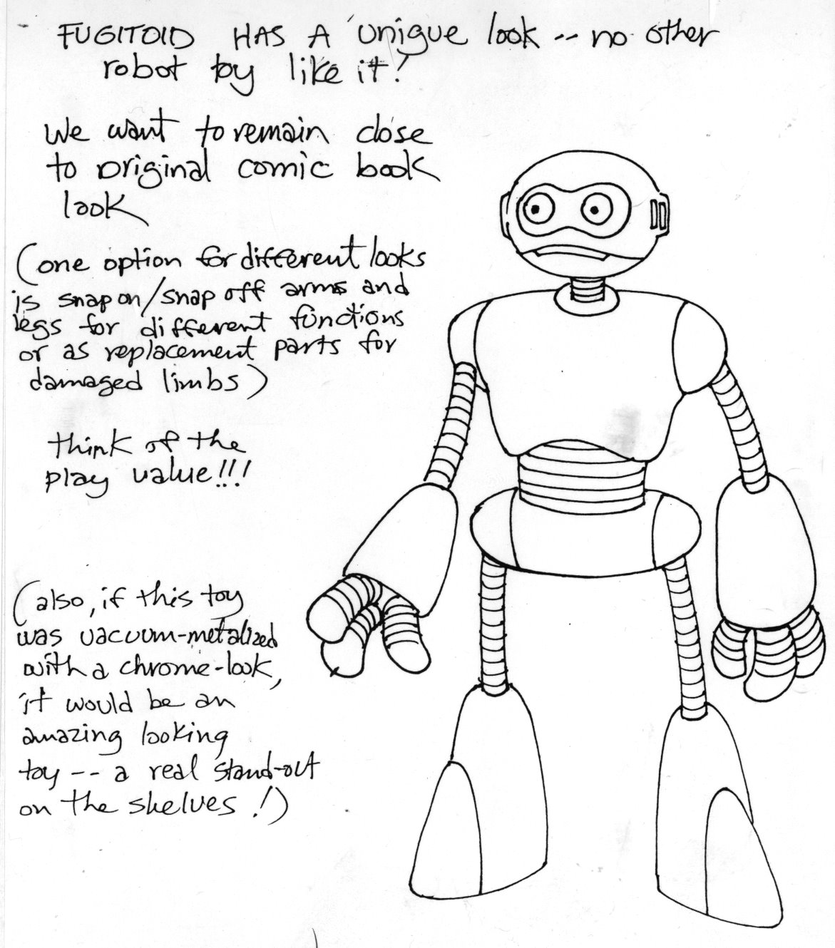 De premiers dessins du Fugitoid ont été proposés par Errol McCarthy, qui signe là un de ses derniers travaux avec la licence des Tortues Ninja. Nommé par erreur « Fugatoid », le robot est sensiblement différent de celui conçu par Eastman et Laird en 1983. Si le corps dans son ensemble rappelle le robot fugitif, son visage rond et amical disparaît, au détriment d’une tête plus allongée et de dents apparentes (Fig. 1 et 2).