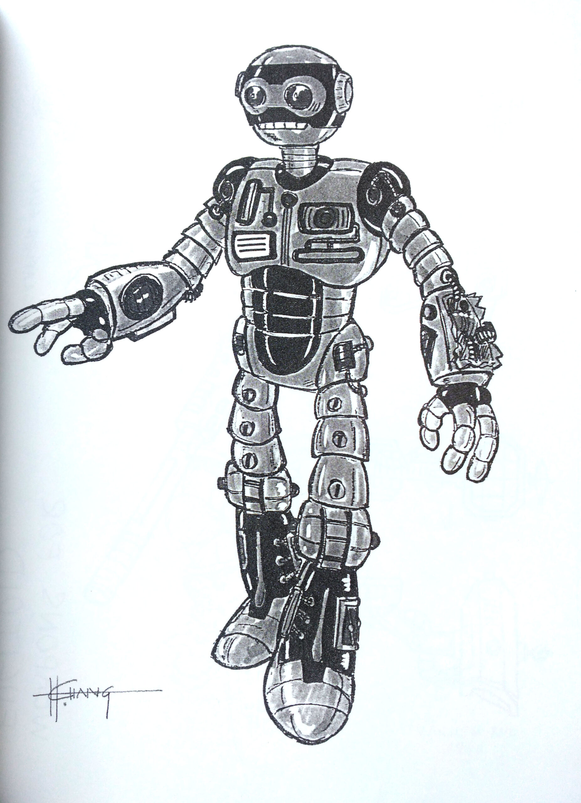 Les figures 1 et 2 sont des dessins préparatoires d’Errol McCarthy. Les figures 3 et 4 sont des dessins de Peter Laird au moment de proposer quelques possibilités pour son robot fétiche. Les figures 5 et 6 sont les dessins avancés pour la production de la figurine chez Varner Studios. La figurine est dessinée par Howard Chang. Le dessinateur des accessoires est inconnu. La figure 7 est une hard copy non peinte et non terminée. Les deux figures suivantes sont les versions peintes. Enfin, les figures 10 à 17 sont la hard copy au stade final, avant d’apposer les peintures.