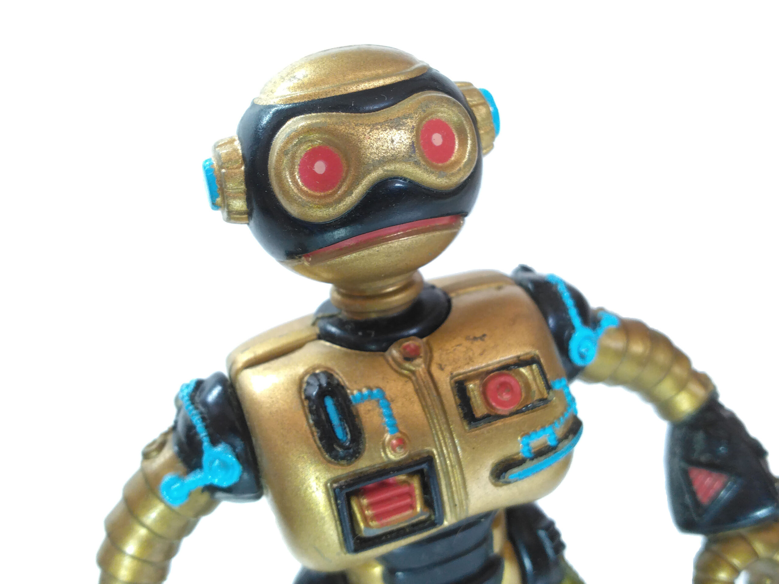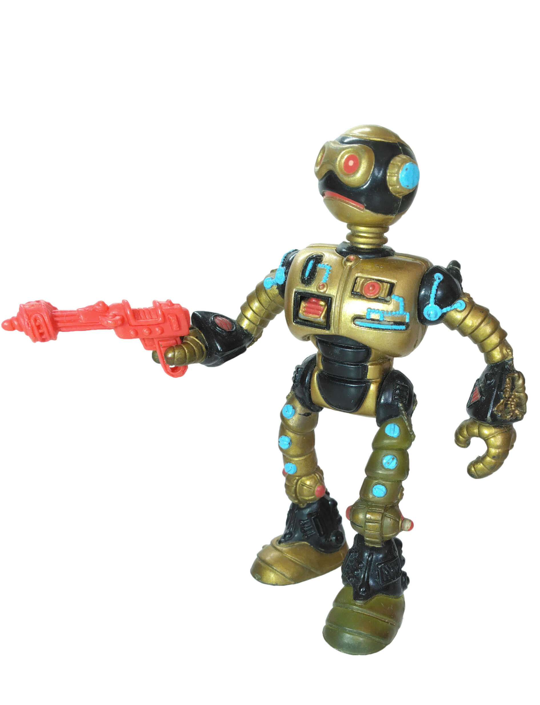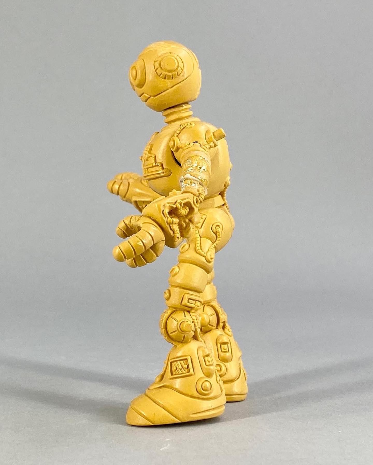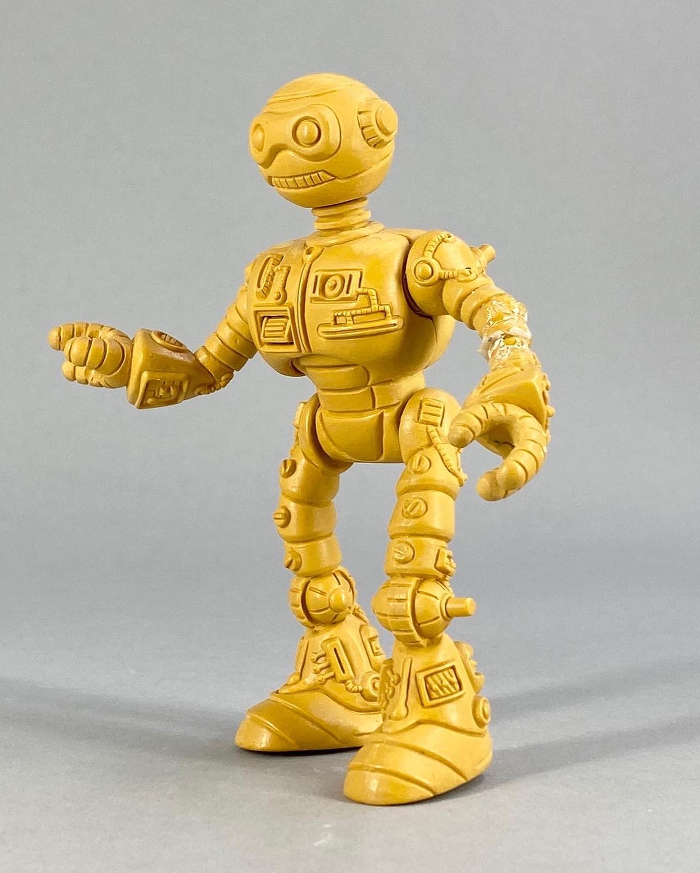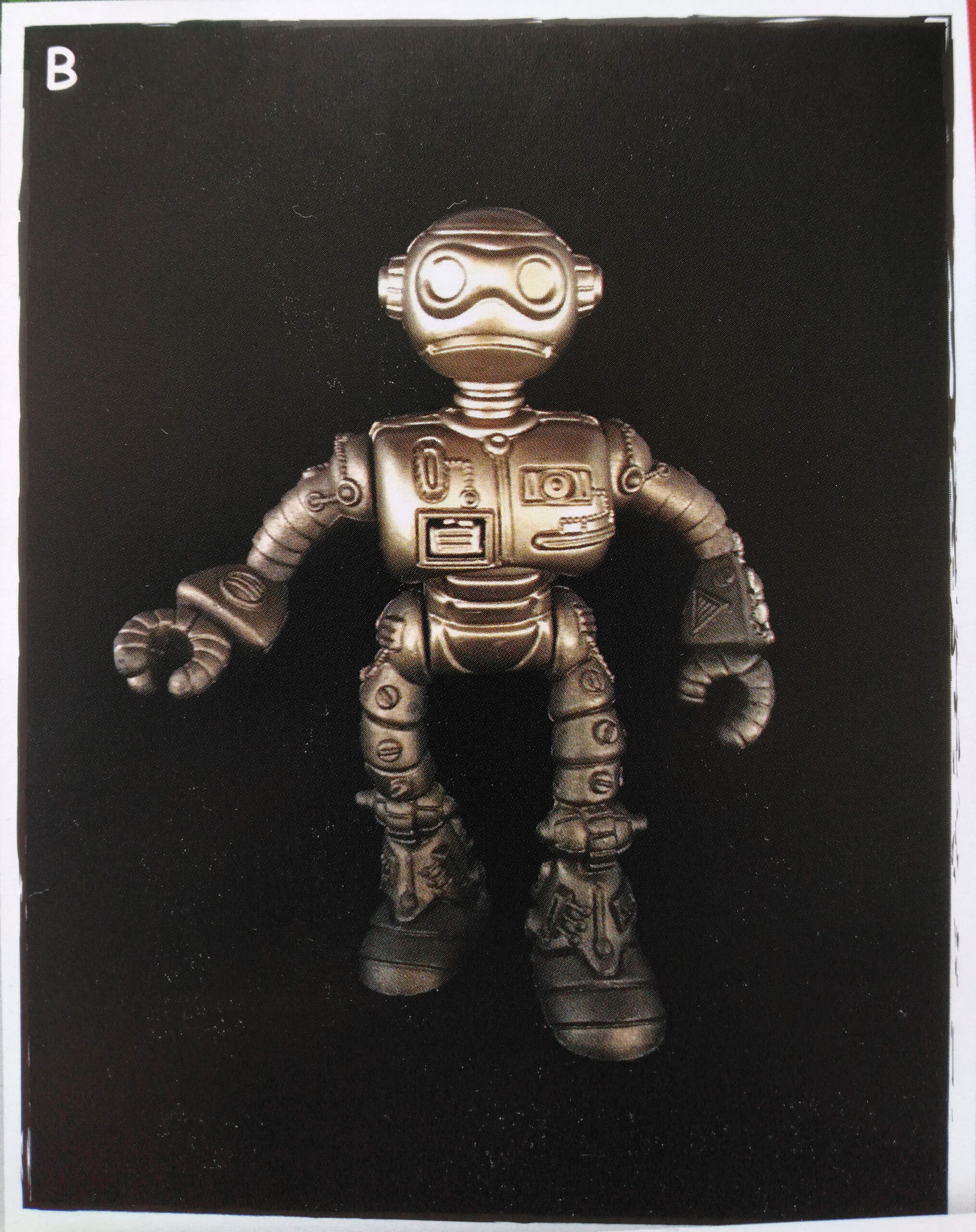Le travail sur les couleurs a, semble-t-il, posé de nombreuses questions. Si jusqu’à la production de la figurine, les équipes travaillaient sur des modèles en noir et blanc, s’intéressant notamment à la sculpture, la question de la peinture n’avait pas été abordée. Ainsi, nous avons une première version peinte en argenté (Fig. 8). C’est finalement vers une couleur dorée que l’équipe s’est tournée, avec des rehauts de noir pour valoriser certains détails (Fig. 9). Si Peter Laird s’est probablement senti trahi, ces choix ont probablement été influencés par la crainte d’une mauvaise réception des enfants vers un robot entièrement argenté et sans grand relief.