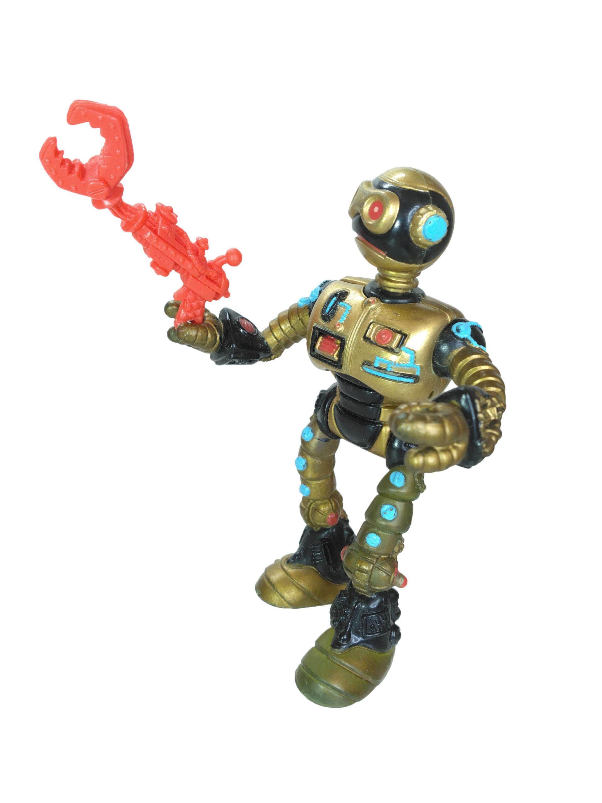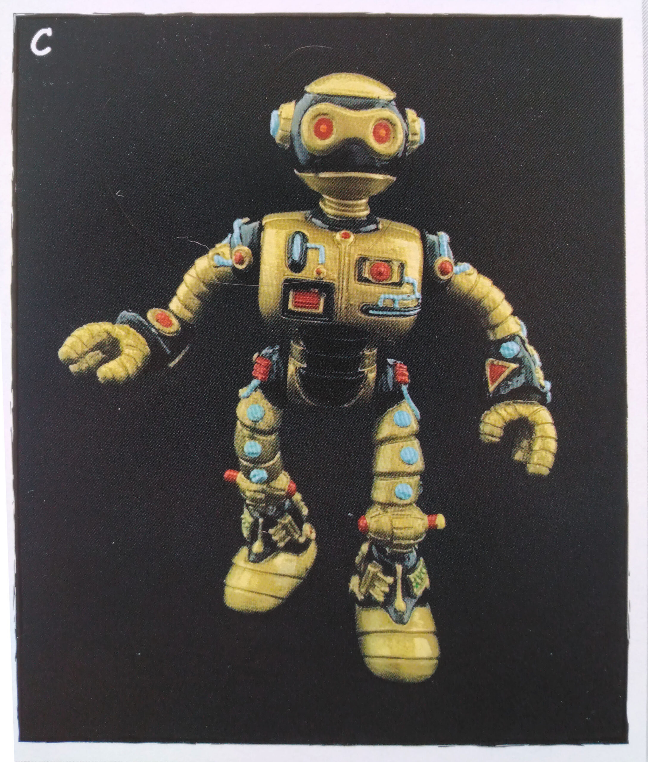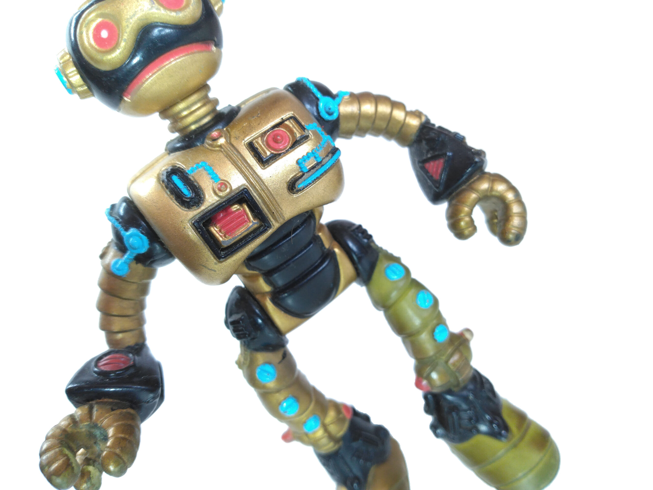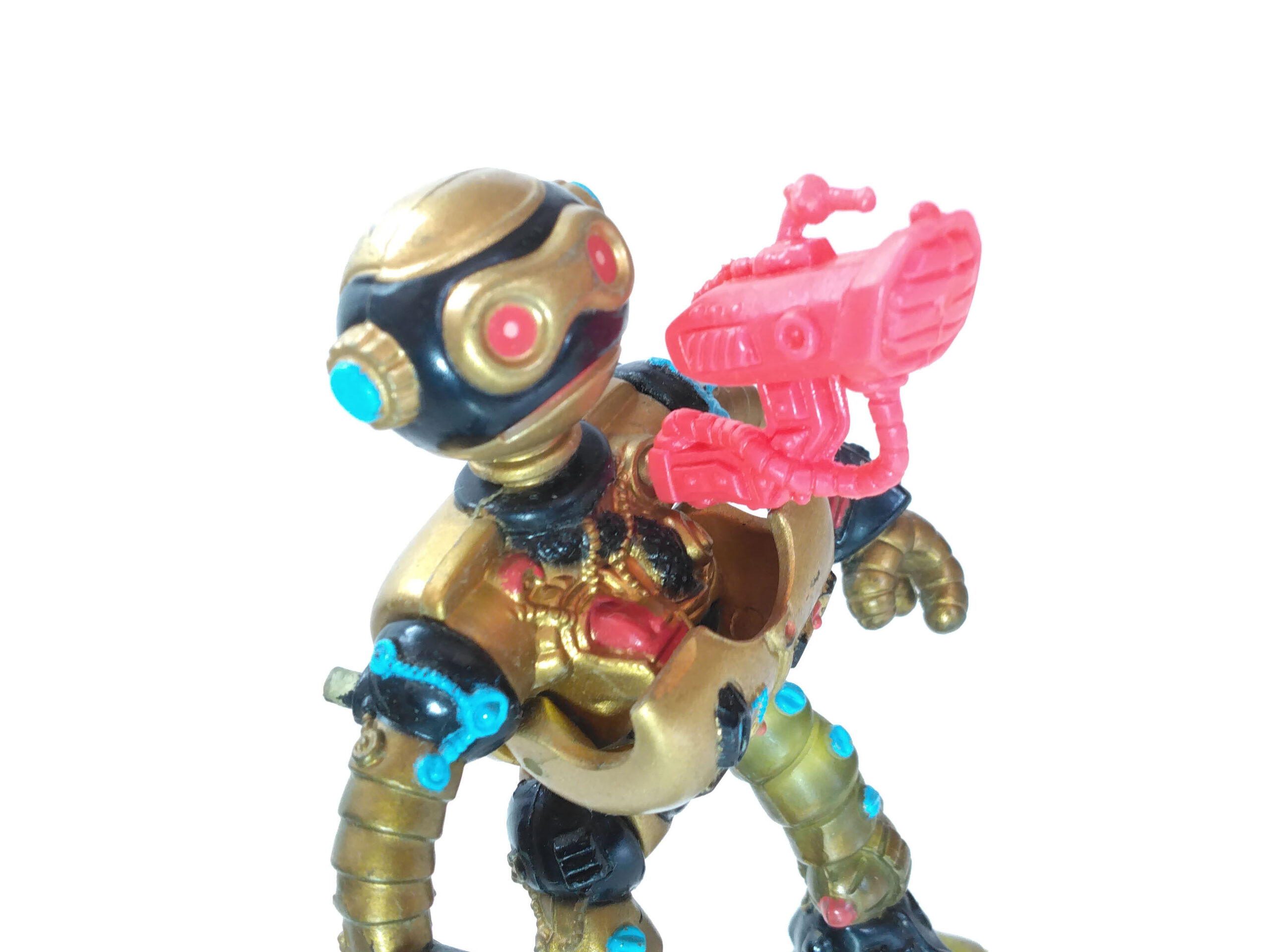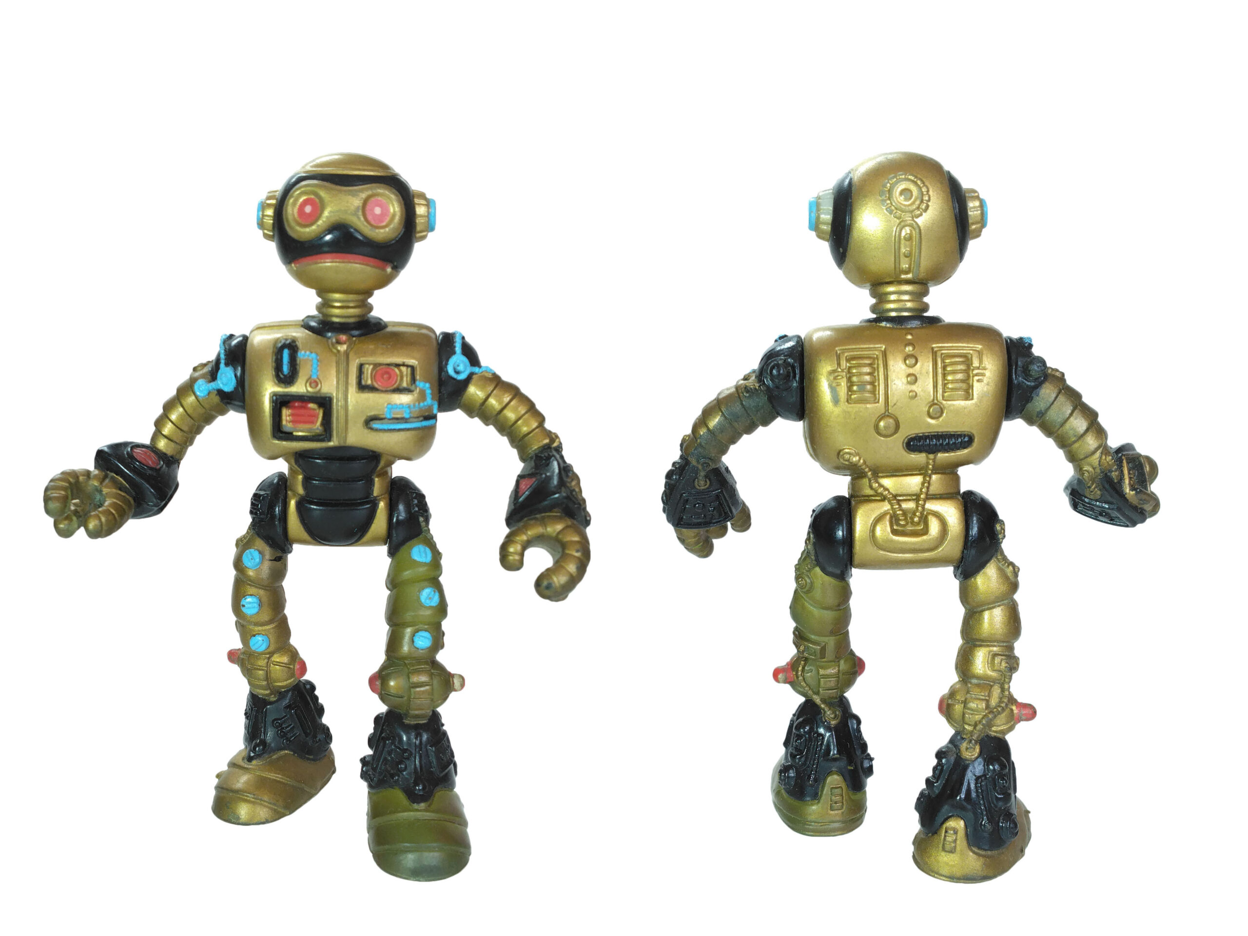 Le travail sur les couleurs a, semble-t-il, posé de nombreuses questions. Si jusqu’à la production de la figurine, les équipes travaillaient sur des modèles en noir et blanc, s’intéressant notamment à la sculpture, la question de la peinture n’avait pas été abordée. Ainsi, nous avons une première version peinte en argenté (Fig. 8). C’est finalement vers une couleur dorée que l’équipe s’est tournée, avec des rehauts de noir pour valoriser certains détails (Fig. 9). Si Peter Laird s’est probablement senti trahi, ces choix ont probablement été influencés par la crainte d’une mauvaise réception des enfants vers un robot entièrement argenté et sans grand relief.