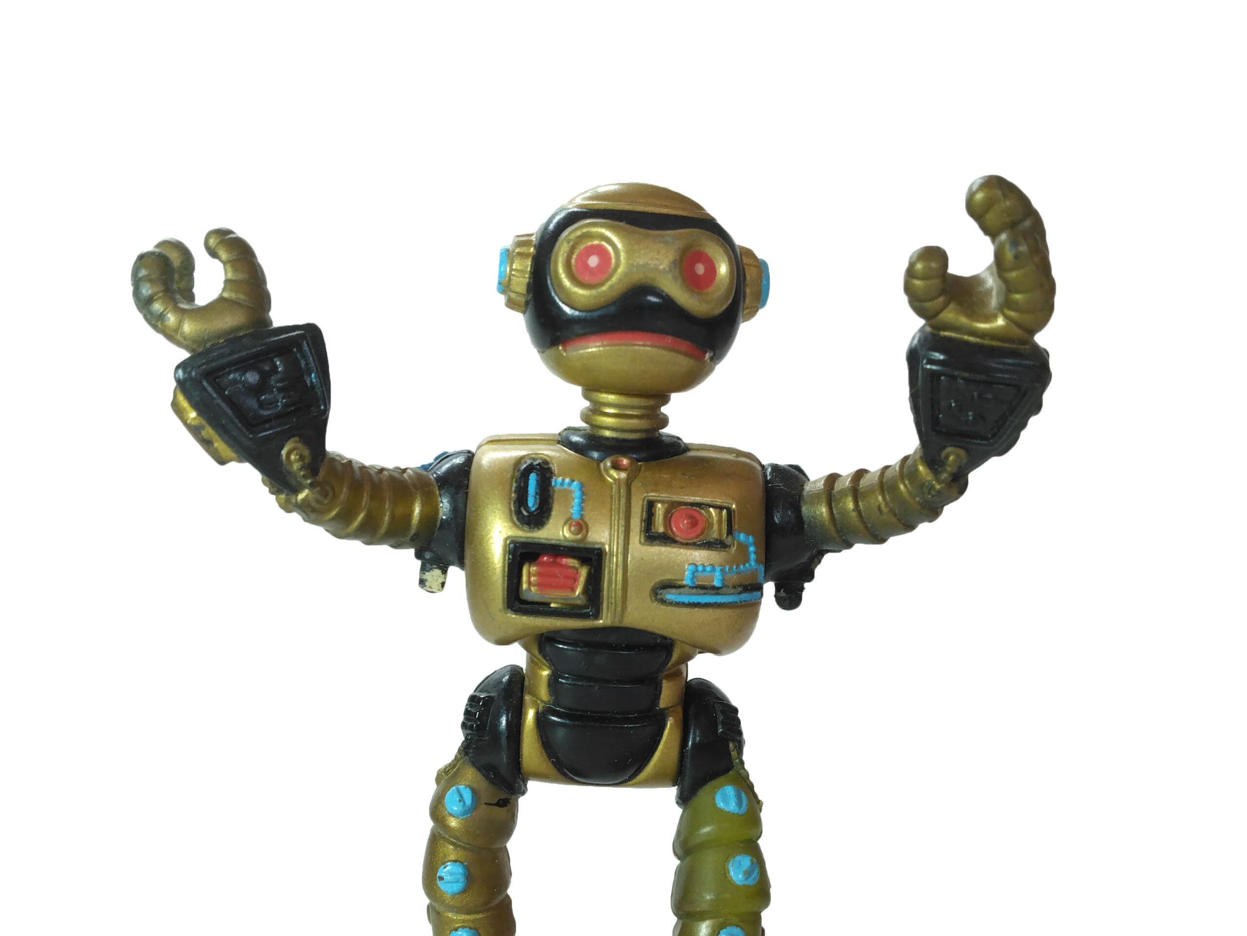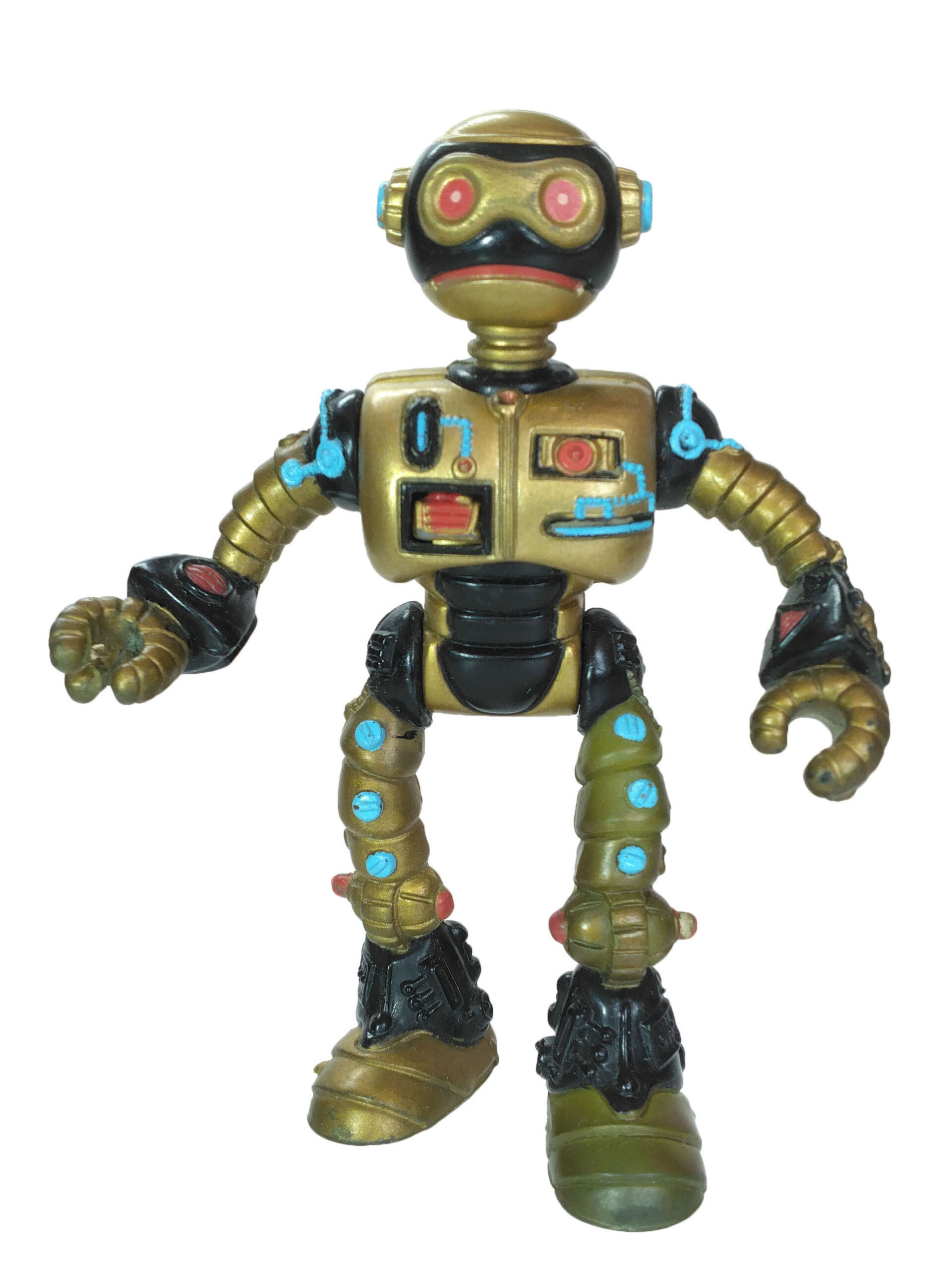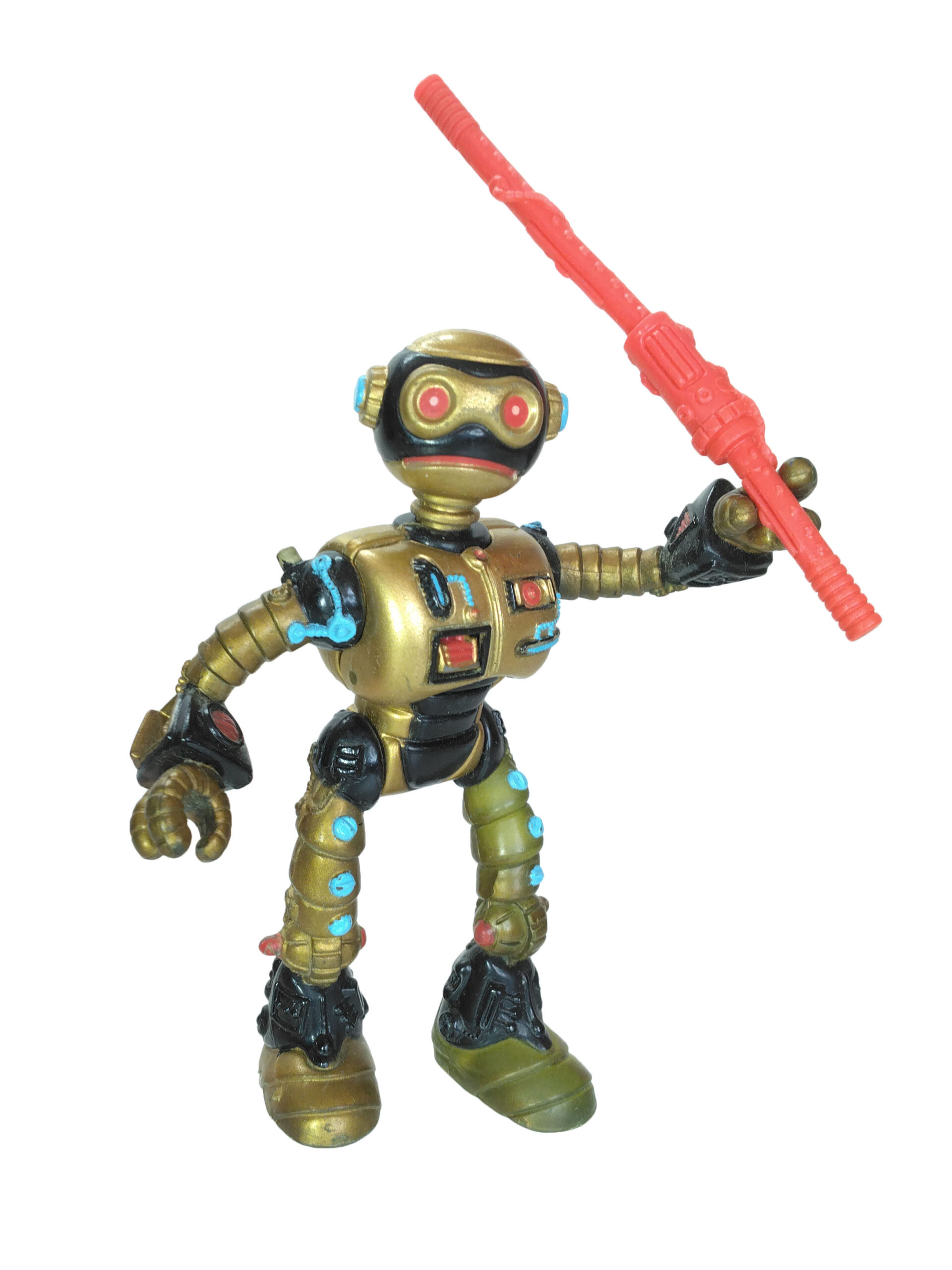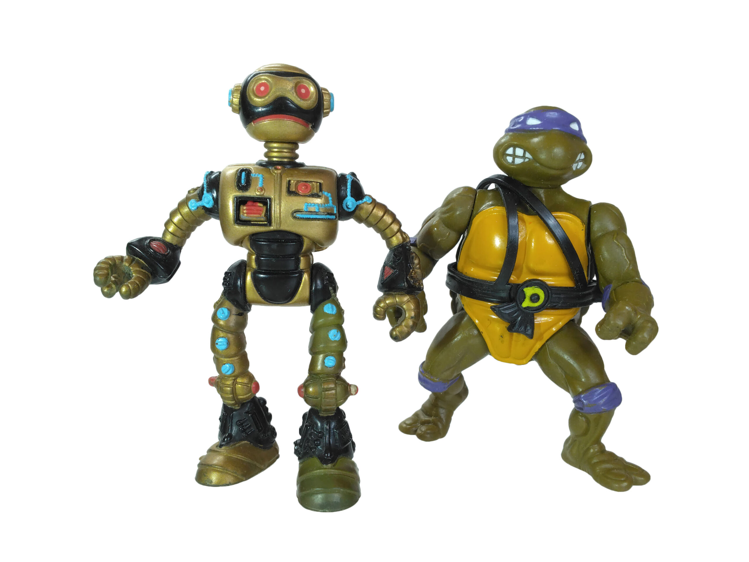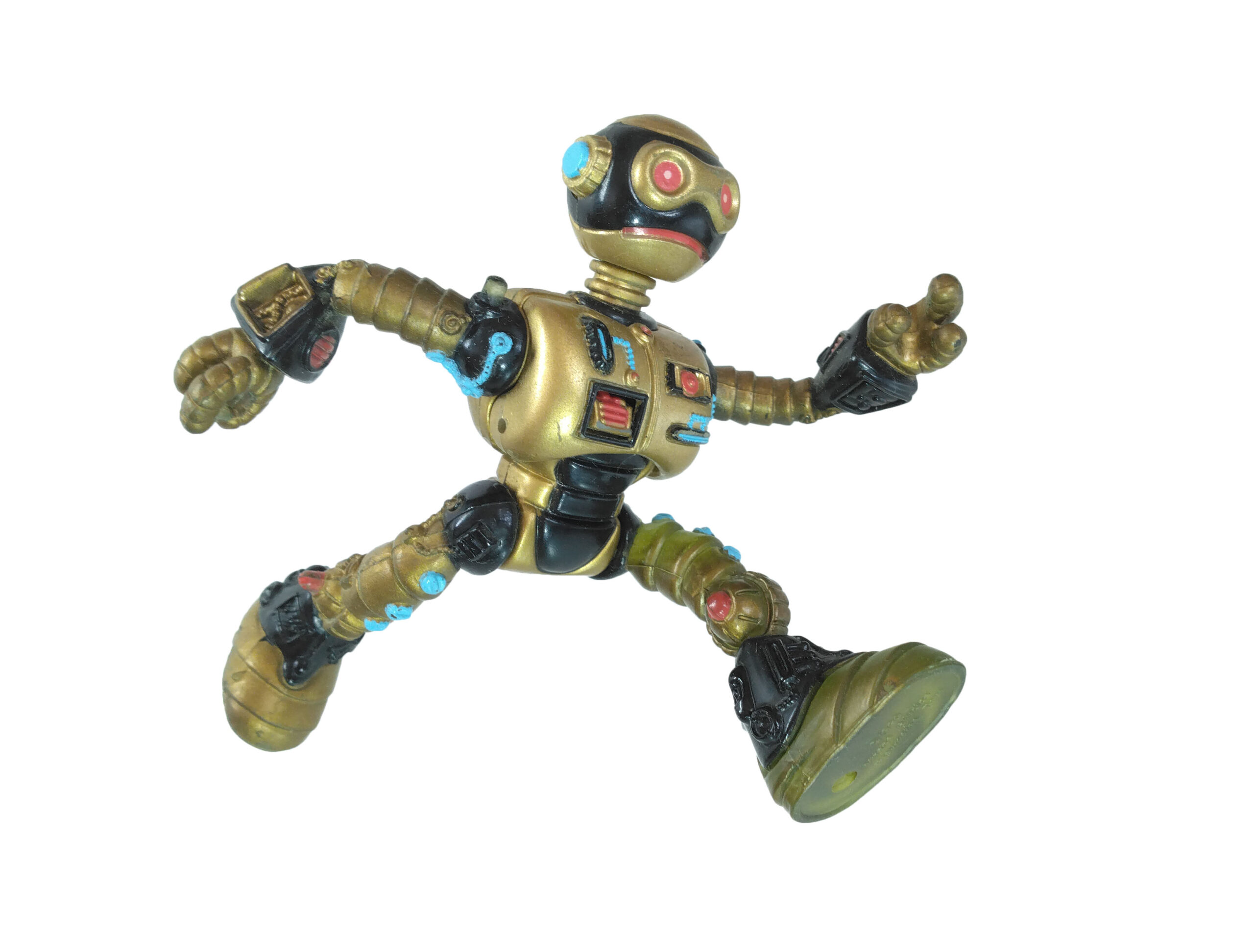 Le travail sur les couleurs a, semble-t-il, posé de nombreuses questions. Si jusqu’à la production de la figurine, les équipes travaillaient sur des modèles en noir et blanc, s’intéressant notamment à la sculpture, la question de la peinture n’avait pas été abordée. Ainsi, nous avons une première version peinte en argenté (Fig. 8). C’est finalement vers une couleur dorée que l’équipe s’est tournée, avec des rehauts de noir pour valoriser certains détails (Fig. 9). Si Peter Laird s’est probablement senti trahi, ces choix ont probablement été influencés par la crainte d’une mauvaise réception des enfants vers un robot entièrement argenté et sans grand relief.
