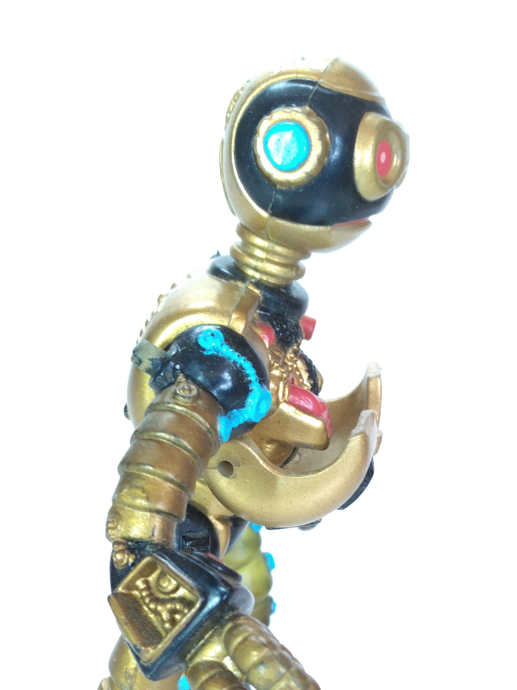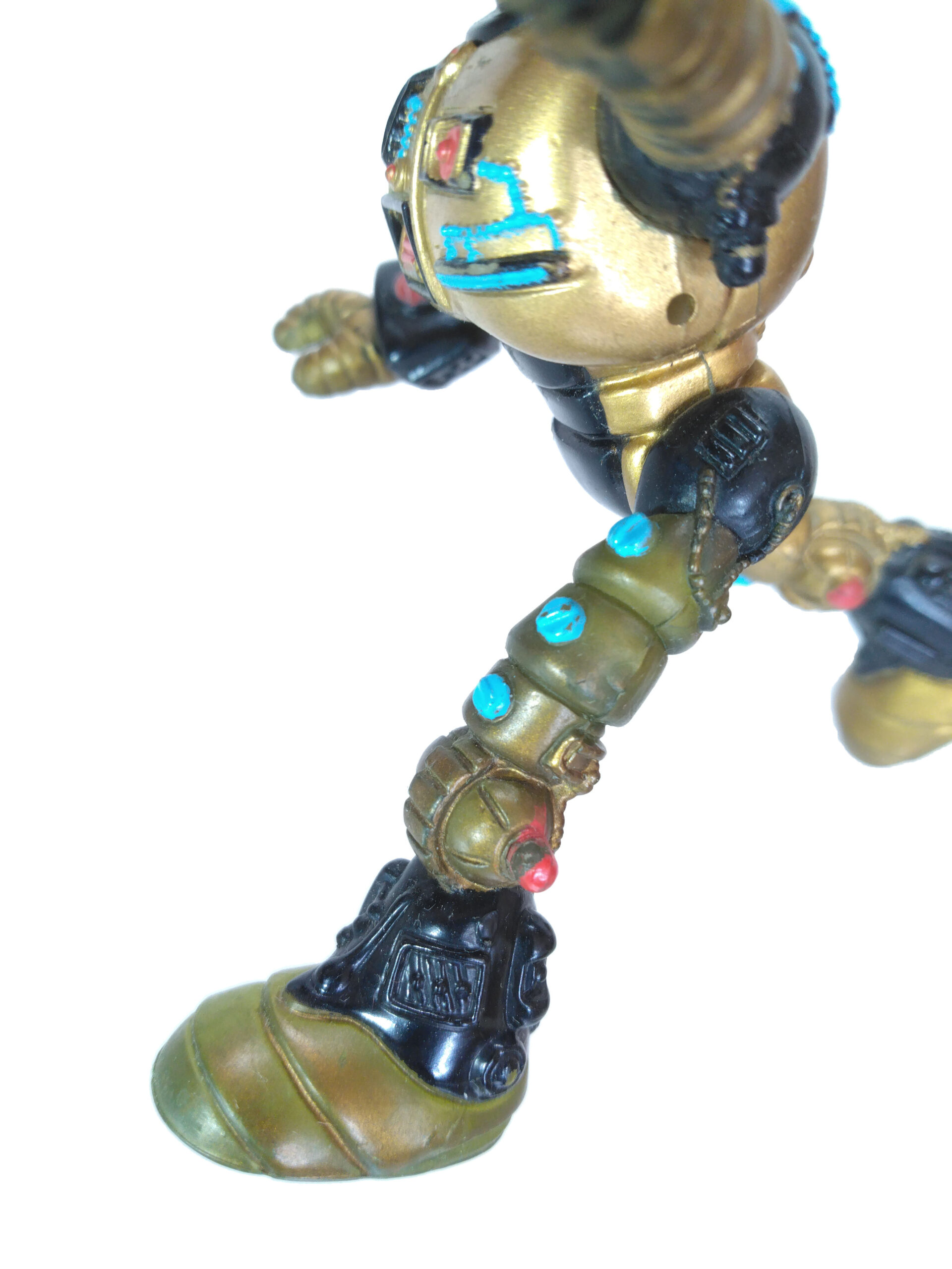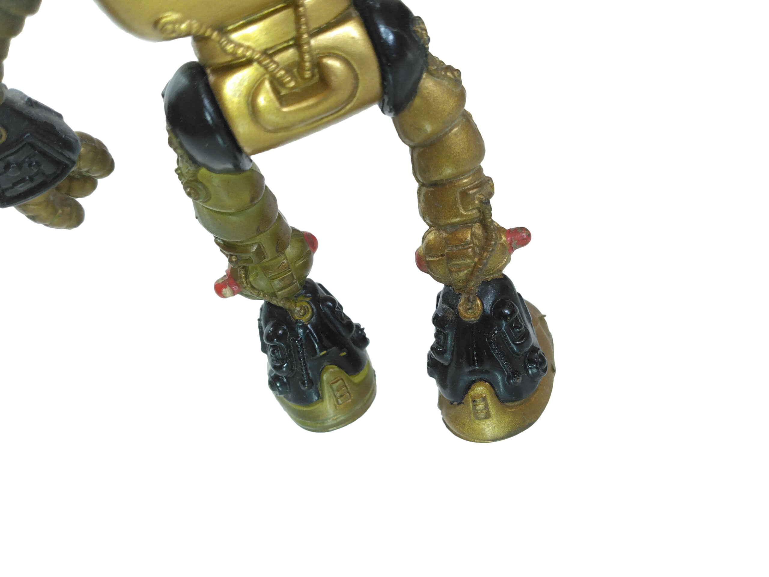 Le plastique utilisé pour réaliser les membres du Fugitoid est transparent et tend vers le jaune, peut-être du fait d’un mélange avec la peinture dorée apposée dessus. Sans doute moins coûteux à produire, il a tendance à apparaître facilement. Sur la figurine de cette review, il est possible de voir ce plastique sur la totalité de la jambe gauche. Notons également que les autres peintures sont intactes sur sa jambe. La couleur est donc instable, il ne s’agit pas d’une usure de manipulation. Si l’on regarde les figurines sous blister, il arrive souvent que les membres apparaissent plus foncés, à cause de cette altération.