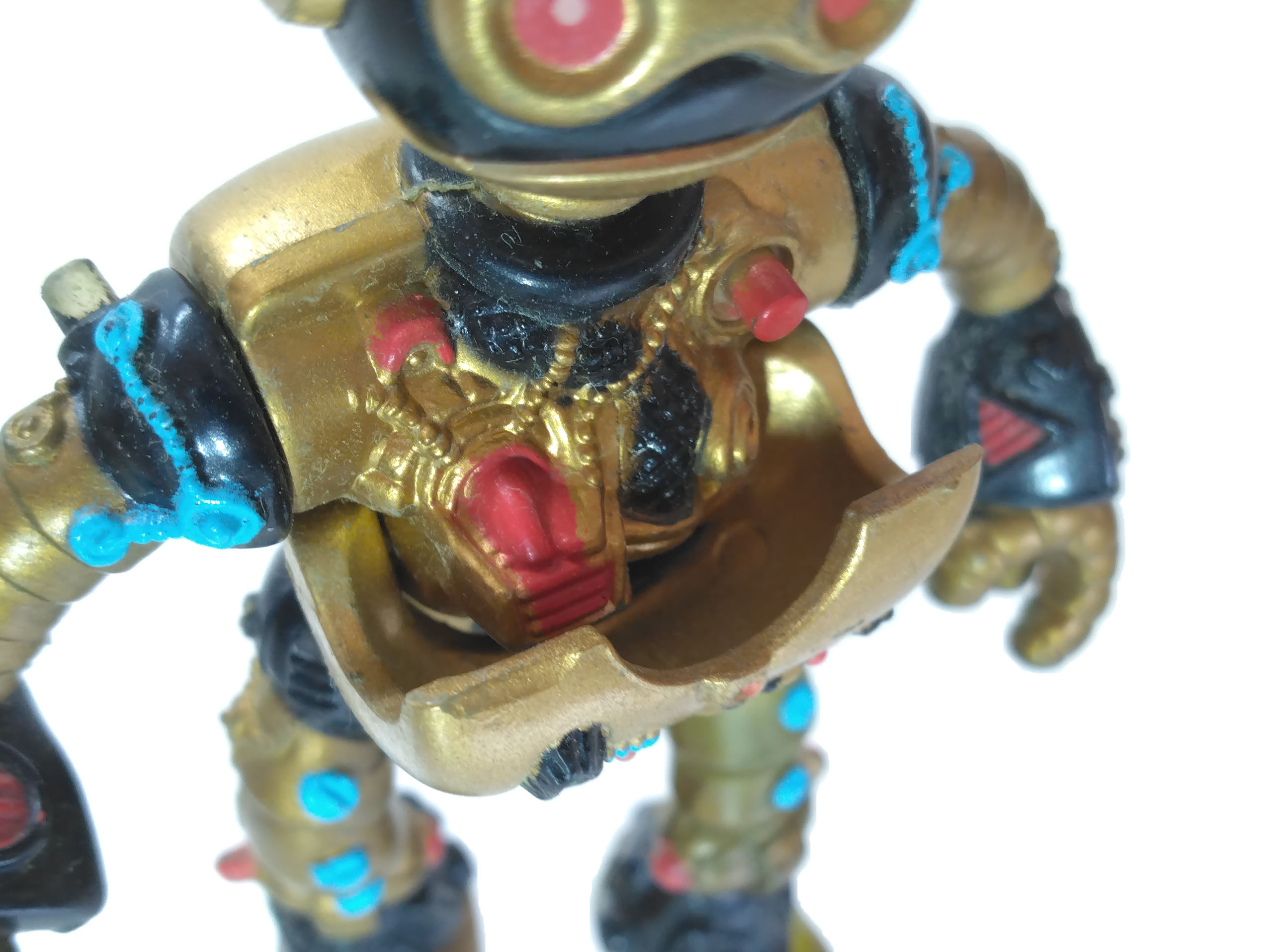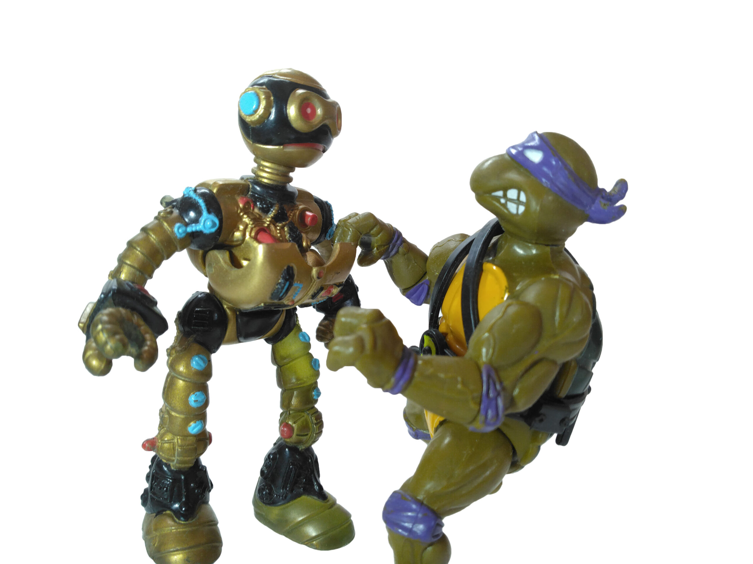 La peinture du Fugitoid est certainement ce qui le distingue le plus du design originellement conçu par Eastman et Laird. Ce dernier tenait à ce que le robot soit recouvert d’une peinture chromée pour rendre hommage à son personnage. Si finalement il est l’un des premiers de Playmates à recevoir une peinture métallisée, c’est vers le doré que le fabricant s’est orienté. L’attrait des enfants pour l’or plutôt que pour l’argent ?