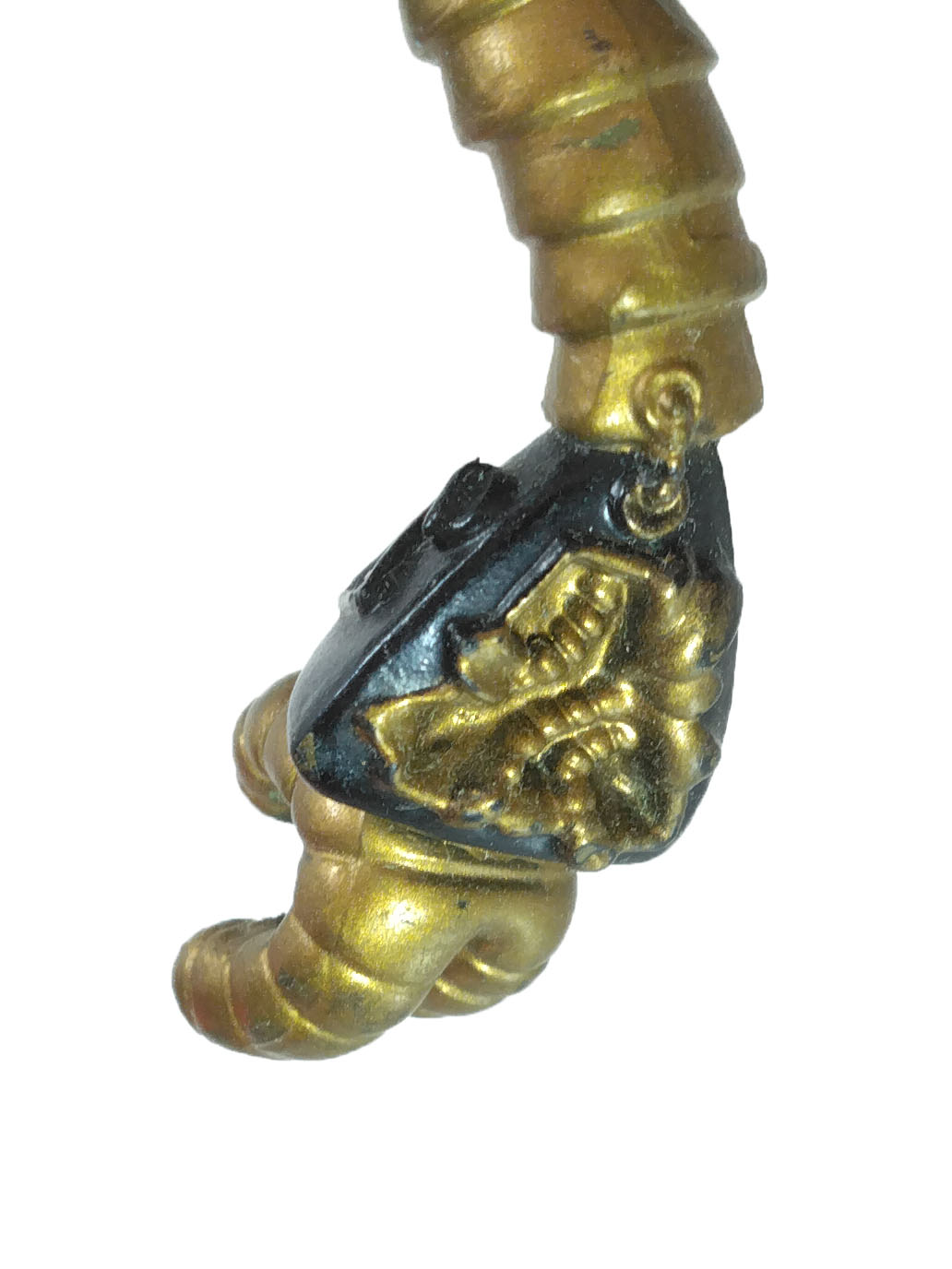 même pour les avant-bras, avec des bracelets creux. Celui du bras gauche est endommagé. Enfin, les pieds ne sont pas en reste avec des détails similaires.