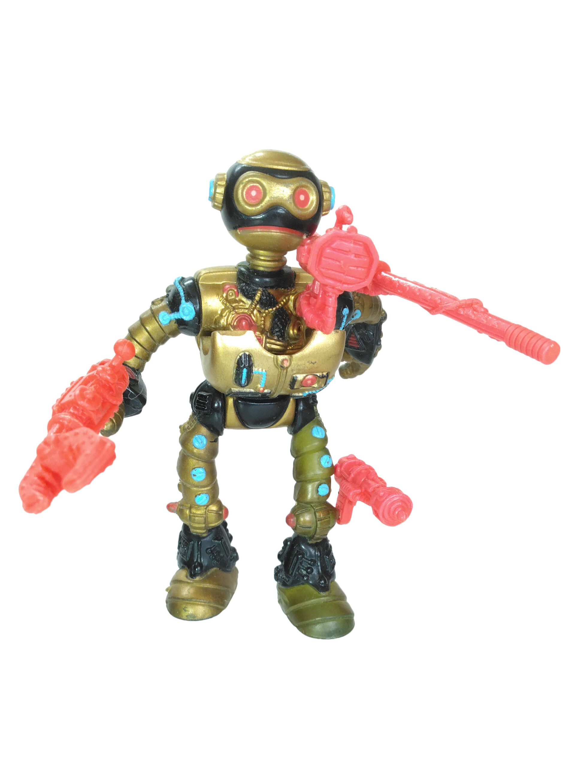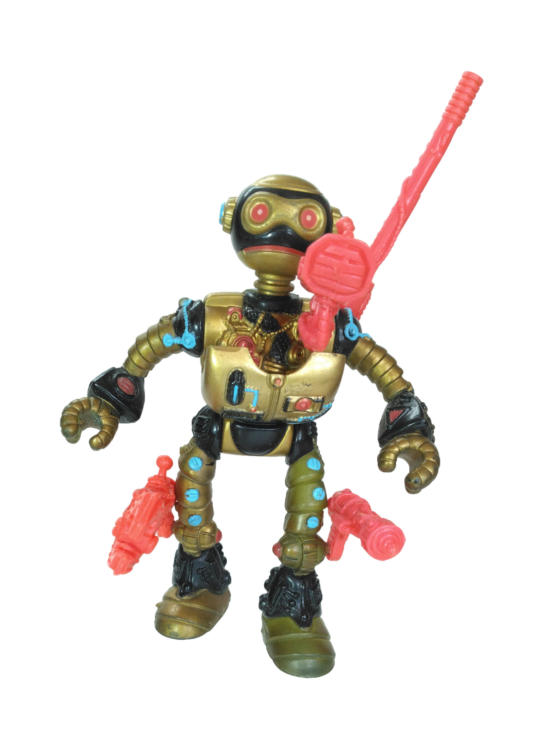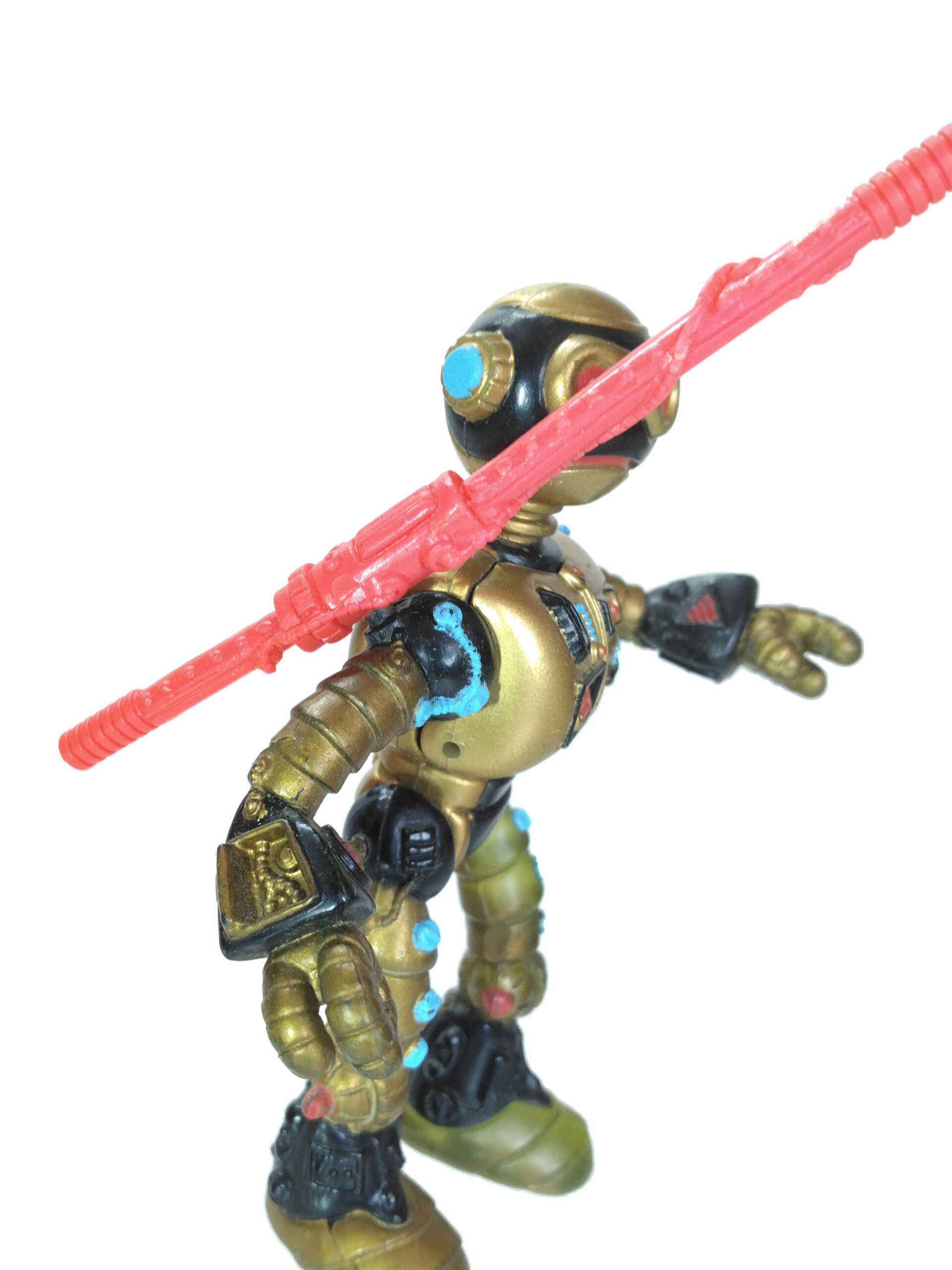 De même, les accessoires du robot fugitif ont été peints en doré pour le spot publicitaire (voir en fin de dossier). Finalement, Playmates Toys s’est orienté vers des accessoires rouges, probablement pour ajouter une couleur supplémentaire au personnage.