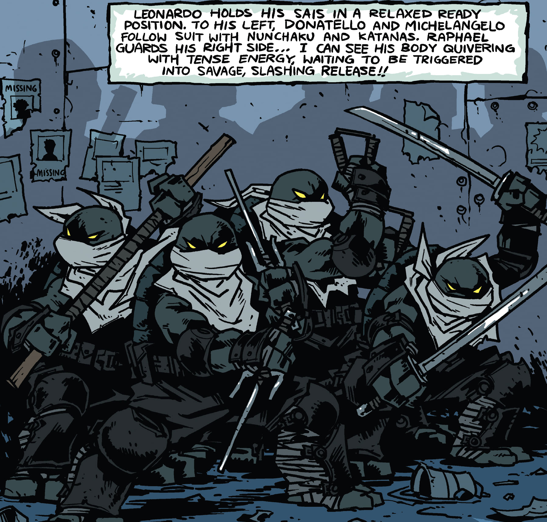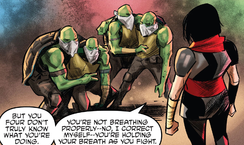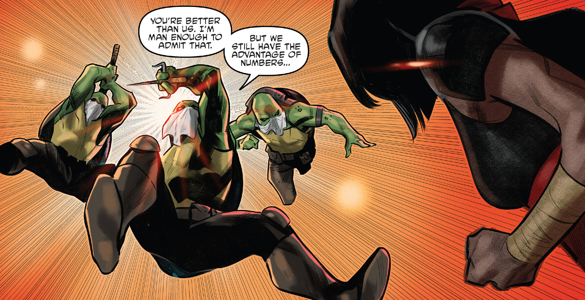 Après avoir semé la panique dans les rues de New York, les quatre imposteurs suivirent Oroku Karai, qui se changeait les idées en sautant de toits en toits. La provoquant, ils firent deux grandes erreurs. Ils n’étaient pas prêts à affronter un tel adversaire. S’ils étaient bons au combat rapproché, leurs lacunes dans les arts martiaux étaient criantes. Trop maladroits pour s’en prendre à elle, ils la sous-estimèrent. La jeune femme parvint à les neutraliser sans pour autant obtenir les réponses à ses questions (The Armageddon Game – The alliance #1).