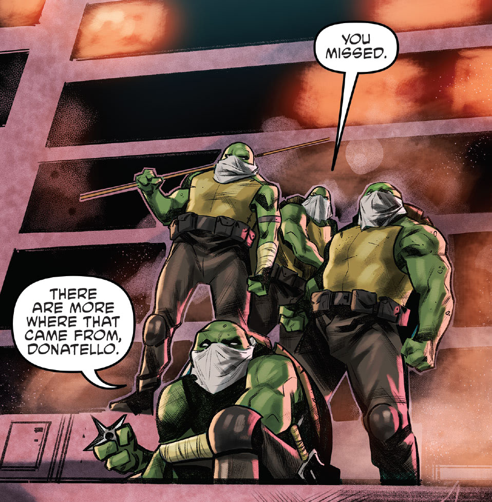 Les fausses tortues ont commencé par s’attaquer aux soldats de l’Earth Protection Force (FCBD 2022) avant de s’en prendre à Baxter Stockman à l’occasion d’une allocution sur le devenir de Mutant Town. Le maire de la ville, faisant partie de l’équipe du Rat King, savait qu’elles interviendraient après qu’il ait annoncé qu’il maintiendrait toujours la ville des mutants en récession. Cette attaque visait à discréditer les tortues auprès de l’opinion, principalement au sein de Mutant Town, lassée d’être retenue dans les murs de la ville (The Armageddon Game #1). Les tortues devaient prendre la fuite à l’arrivée de Dark Water, chargée de protéger le maire (The Armageddon Game #2)