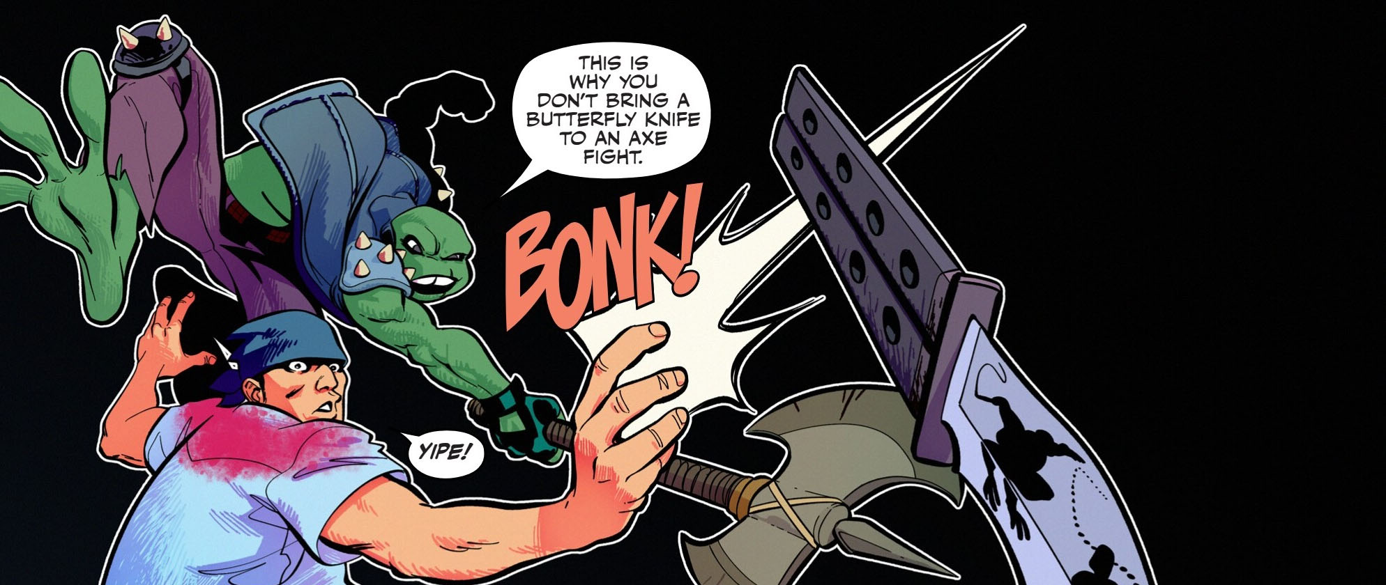 Bien décidées à retrouver leurs traces, les tortues fouillèrent quelques clubs, découvrant leur cachette (TMNT (Vol. 5) #129). Les attaquant une nouvelle fois, les grenouilles prirent la fuite, profitant du bruit de l’effondrement de la clinique de Jasper Barlow. Michelangelo se lança à la poursuite de Genghis par les conduits d’aération. Le rattrapant, il essaya de lui parler, favorisant toujours la discussion au combat. La grenouille était surprise par cette attitude, alors que ses compagnons et lui avaient détruits leur foyer. Regrettant ce qu’il s’était produit et comprenant qu’ils avaient commis une terrible erreur, le batracien s’en alla rejoindre les siens. Par la suite, Clyde apporta le bras de Bonnie. Il leur annonçait qu’elle n’était plus. Craignant les représailles de la part des tortues, les grenouilles décidèrent de quitter New York (TMNT (Vol. 5) #130).