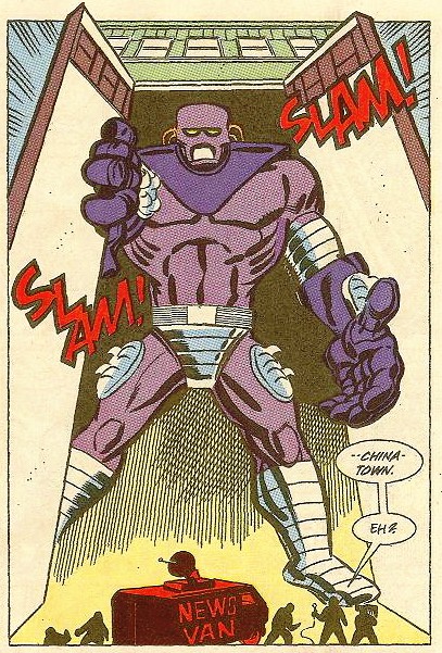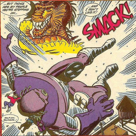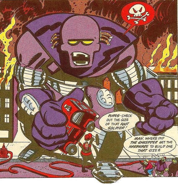 Sans pouvoir faire quoi que ce soit face à un tel monstre, les tortues ont bénéficié de l’aide de l’esprit du Warrior Dragon pour vaincre le robot géant, qui alla s’empaler dans la Statue de la Liberté (TMNT A. #20).