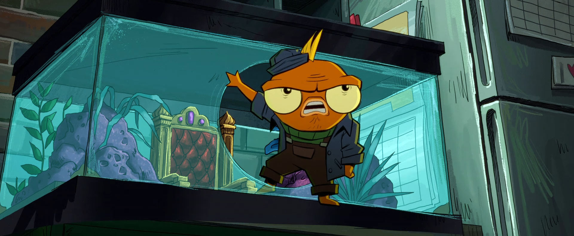 Goldfin était particulièrement intéressé par le repaire des tortues et de Splinter comme nouveau foyer. Il n’avait pas touché un mot de ses nouveaux desseins aux siens et commença à jouer cavalier seul. Le rongeur était bien décidé à garder ses habitudes et livra bataille au poisson rouge pour l’en déloger avec l’aide d’April. Ils réussirent à le mettre en déroute non sans l’aide d’une nuée de rats (Splinter et April affrontent un poisson rouge, S1 E9).