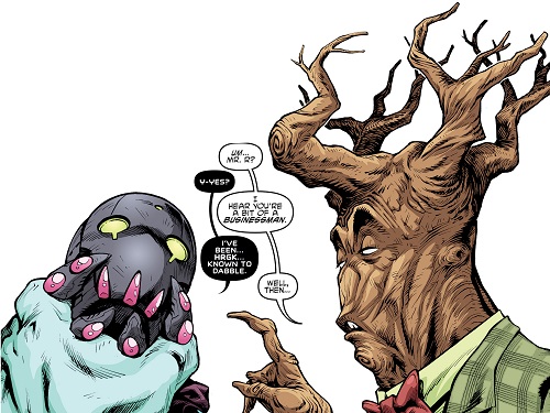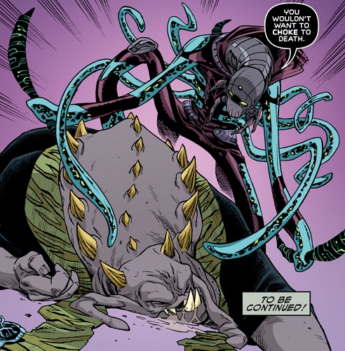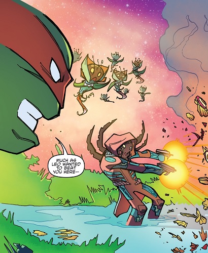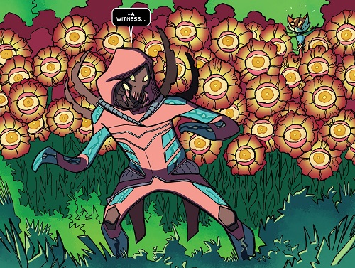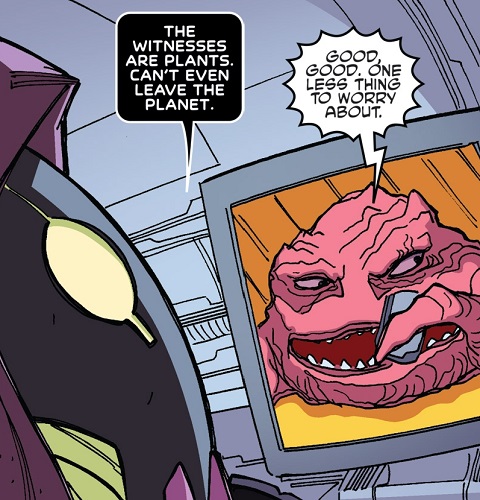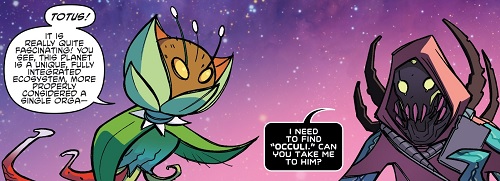 Les plantes étaient en symbiose les unes avec les autres. Il découvrit le cinquième et dernier témoin, Occuli. Il s’agissait en réalité d’une espèce de plante qu’il détruisit afin d’être certain d’éviter tous problèmes, même s’ils ne pouvaient parler. Semant la cohue sur la planète, les tortues arrivèrent pour le chasser. Croyant avoir rempli sa mission, il s’en alla avertissant Krang de son succès. S’il était resté et avait posé les bonnes questions, il aurait compris que c’était toute la planète qui était le témoin, et non uniquement ce groupe de plantes. Les tortues demandèrent alors à Polly de les suivre, étant l’une des seules créatures capables de communiquer verbalement sur cette planète (Dimension X #5).