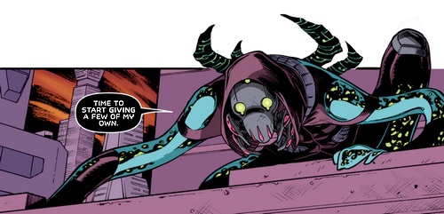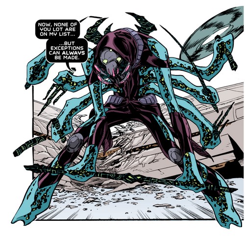 Décrit comme très dangereux et engagé par Krang pour une mission de la plus haute importance, ses résultats sont très décevants. Convainquant dans les premiers numéros où il apparaît, il se révèle finalement très maladroit et prenant de mauvaises décisions. S’il semble aimer étudier les êtres qu’il compte tuer, il prend des décisions hâtives, lui faisant croire qu’il avait tué le cinquième témoin (Dimension X #5).