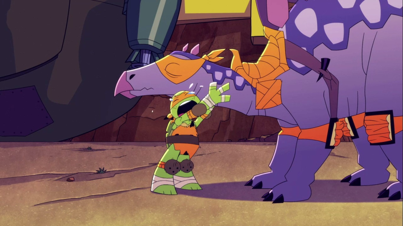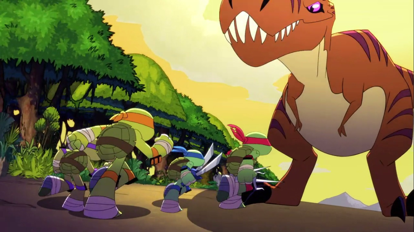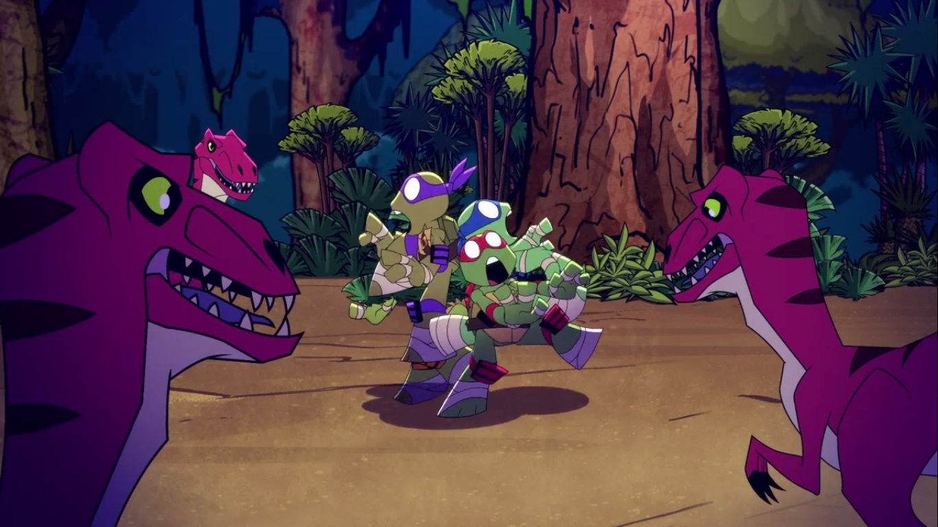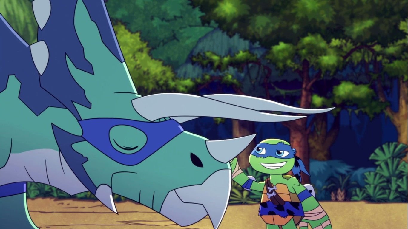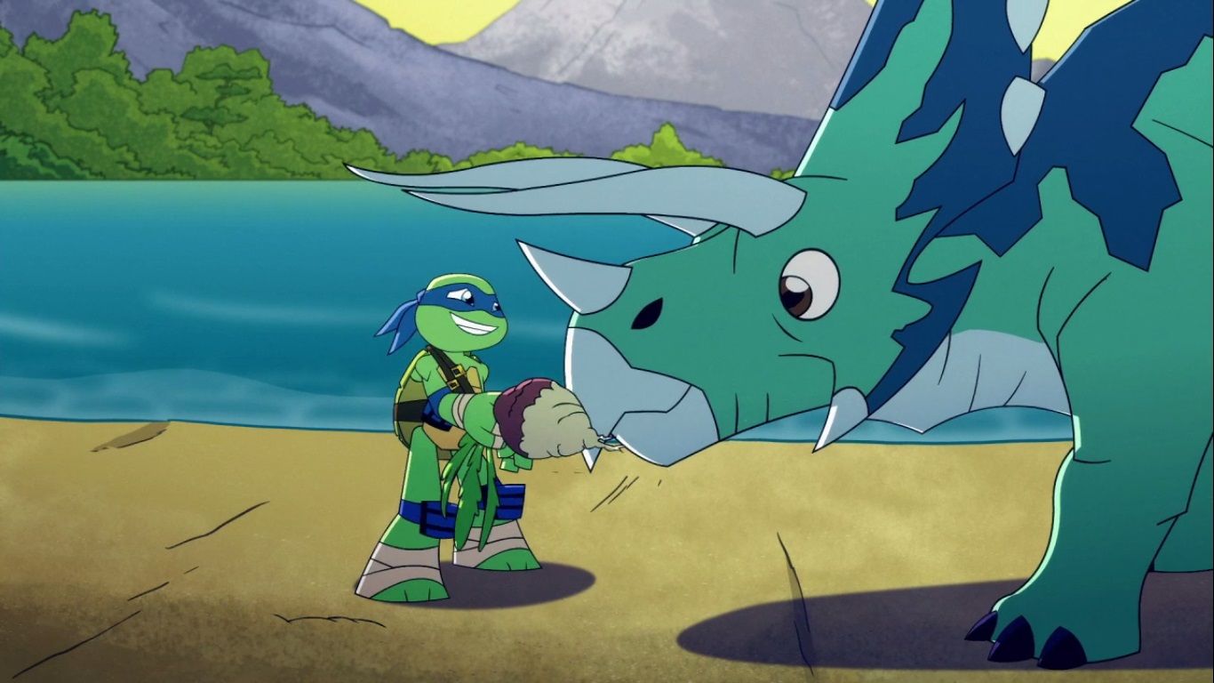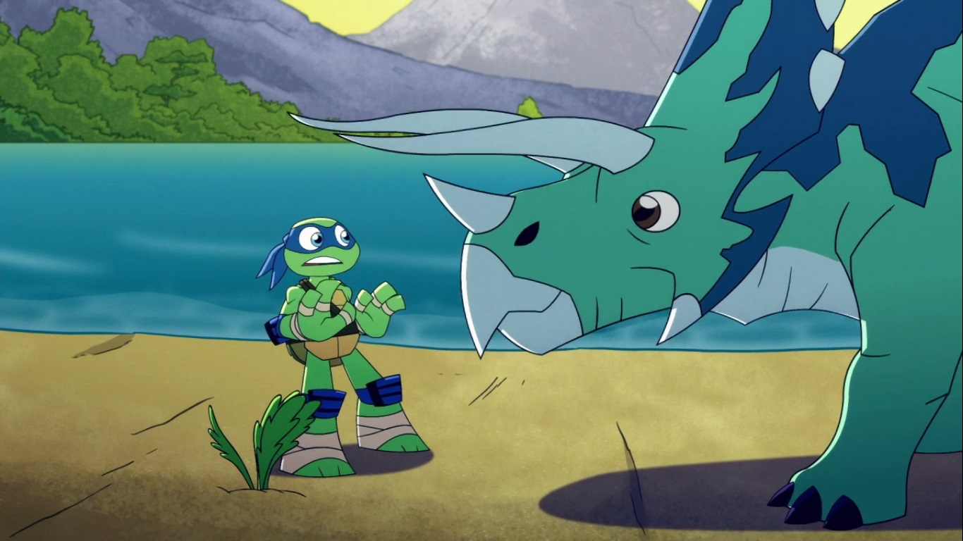 Dans la forêt, les tortues avançaient à dos de dinosaure, sauf Donatello qui n’avait pas le sien. Michelangelo était sur son stégosaure, Leonardo sur le tricératops et Raphael avec le ptérodactyle qu’il avait aidé précédemment. Mais soudain ils furent arrêtés par le tyrannosaure, qui avait retrouvé leurs traces. Ils prirent leurs jambes à leur coup, et Michelangelo les mena vers une grotte. Le cératopsidé les suivit et bloqua l’entrée de son imposant corps. Sans autre issues, les tortues n’avaient guère de solution. Michelangelo proposa alors à Donatello de faire la paix avec la créature lui donnant une part de pizza. Pas très enthousiaste à l’idée de dompter le roi des dinosaures avec une part de pizza, la tortue s’avança méfiante.