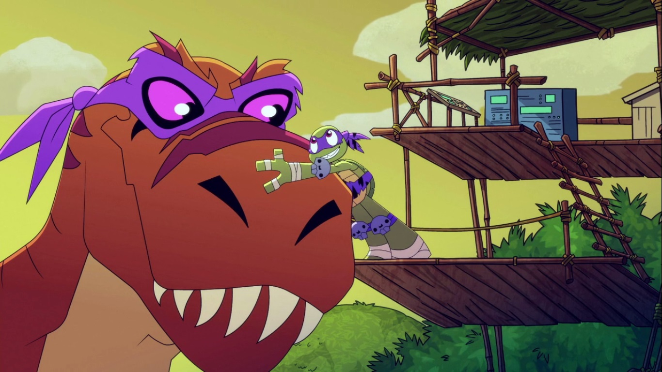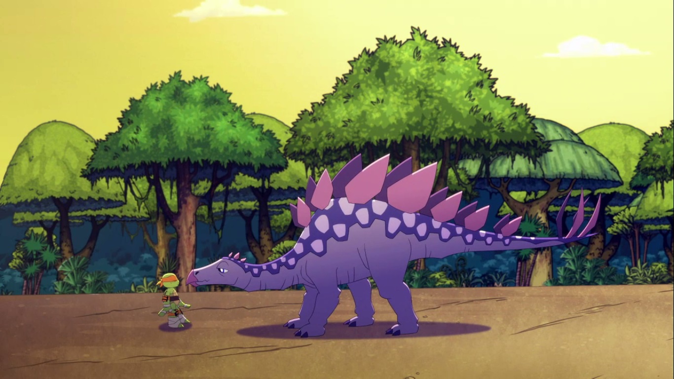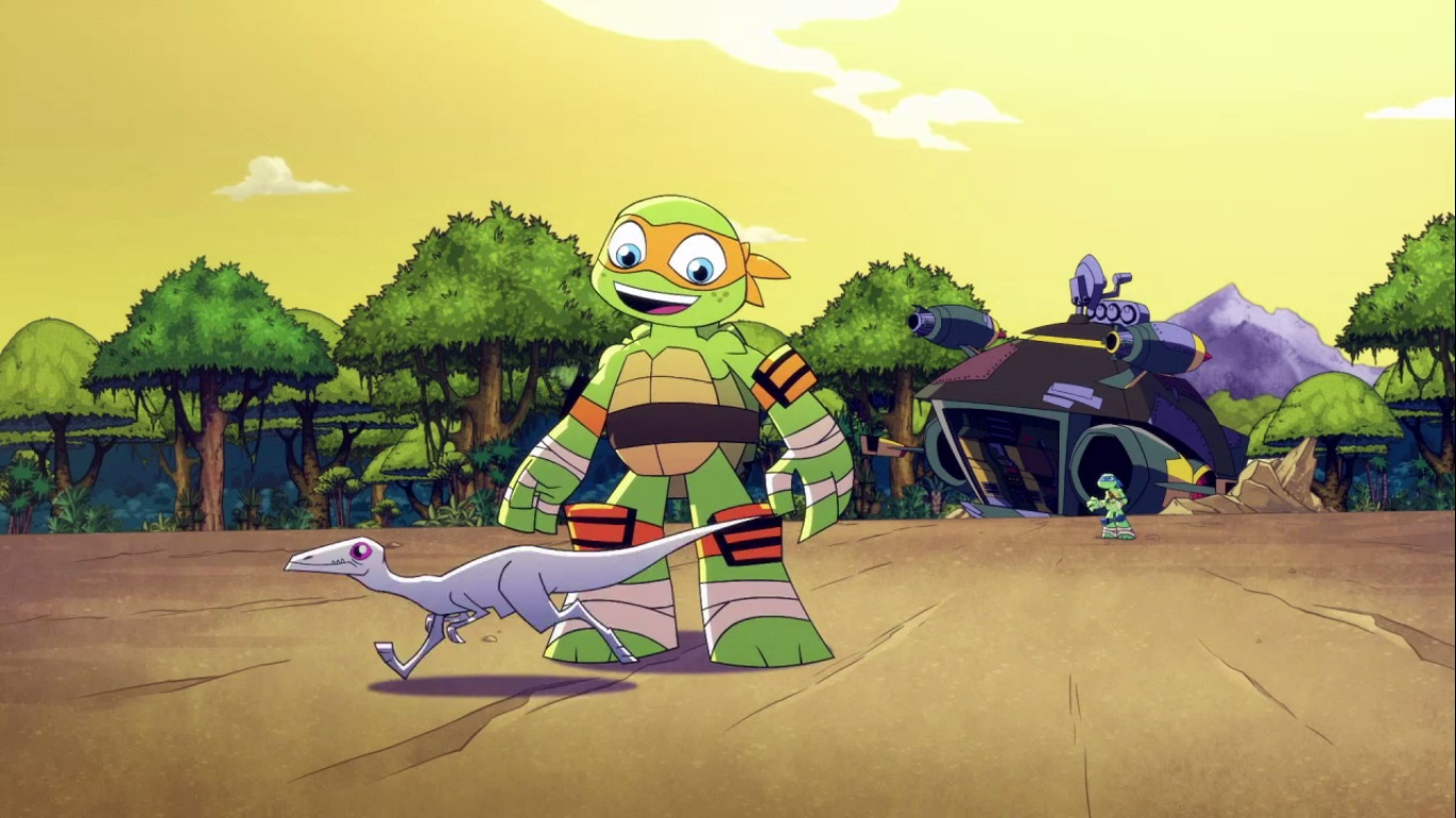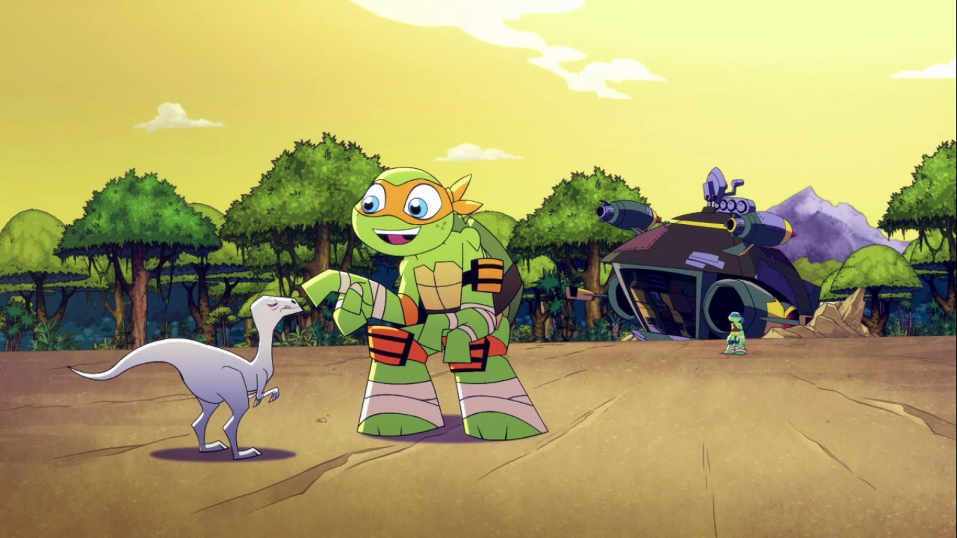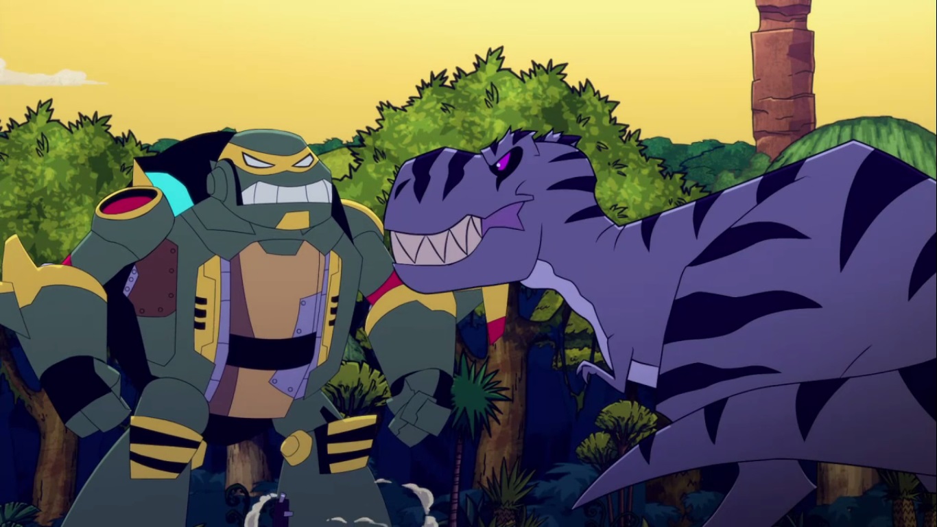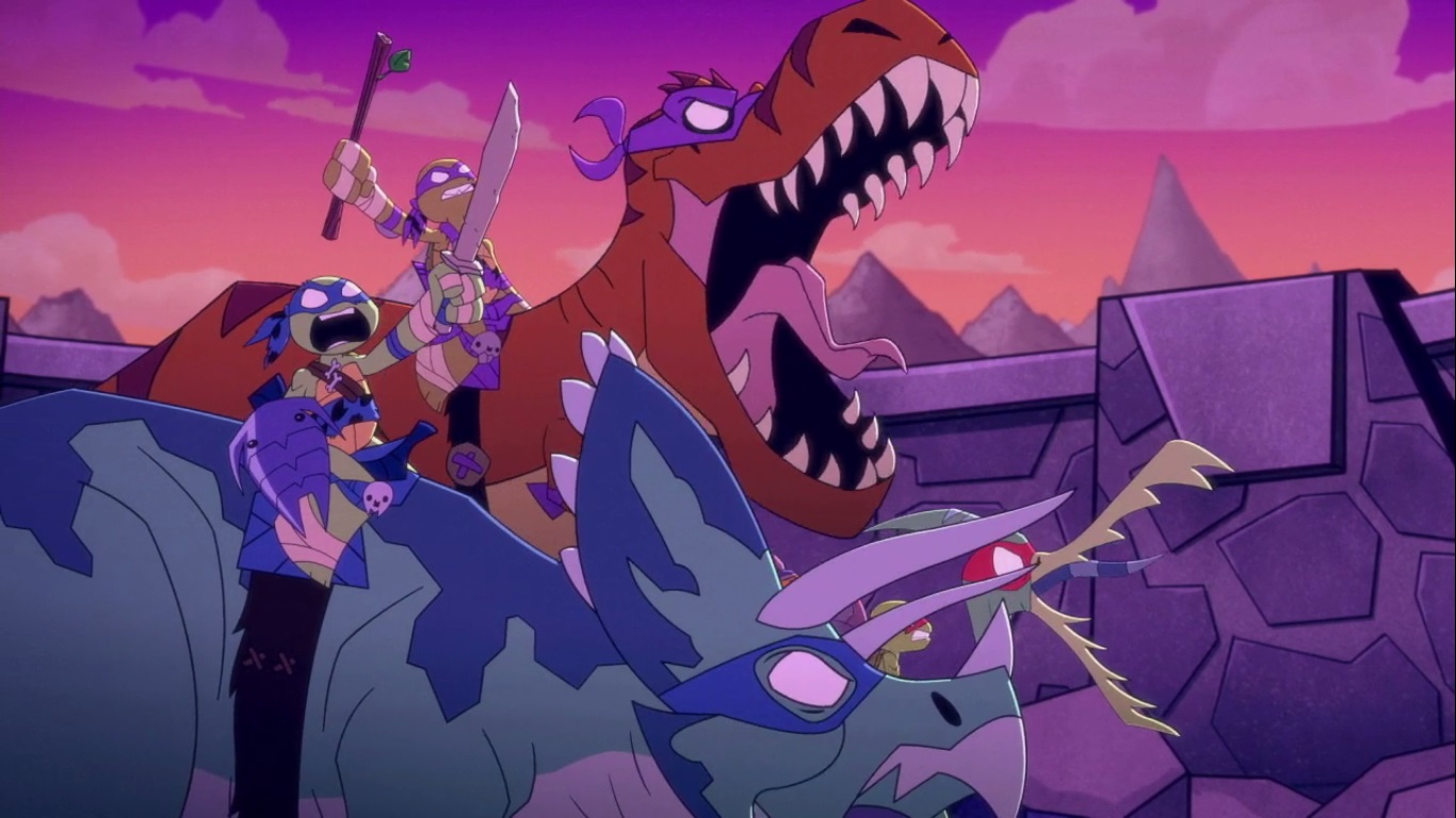 Dans la forêt, les tortues avançaient à dos de dinosaure, sauf Donatello qui n’avait pas le sien. Michelangelo était sur son stégosaure, Leonardo sur le tricératops et Raphael avec le ptérodactyle qu’il avait aidé précédemment. Mais soudain ils furent arrêtés par le tyrannosaure, qui avait retrouvé leurs traces. Ils prirent leurs jambes à leur coup, et Michelangelo les mena vers une grotte. Le cératopsidé les suivit et bloqua l’entrée de son imposant corps. Sans autre issues, les tortues n’avaient guère de solution. Michelangelo proposa alors à Donatello de faire la paix avec la créature lui donnant une part de pizza. Pas très enthousiaste à l’idée de dompter le roi des dinosaures avec une part de pizza, la tortue s’avança méfiante.