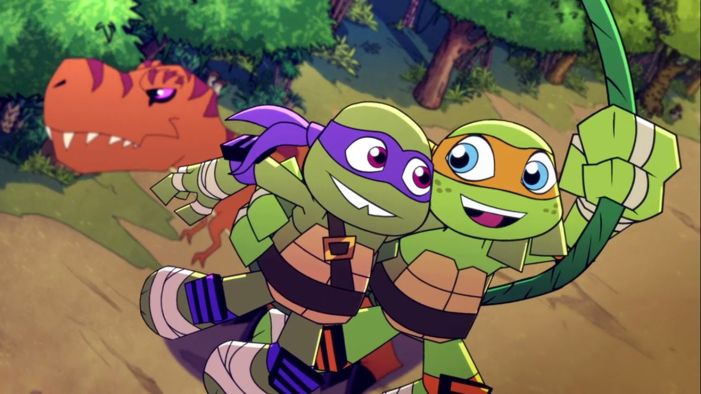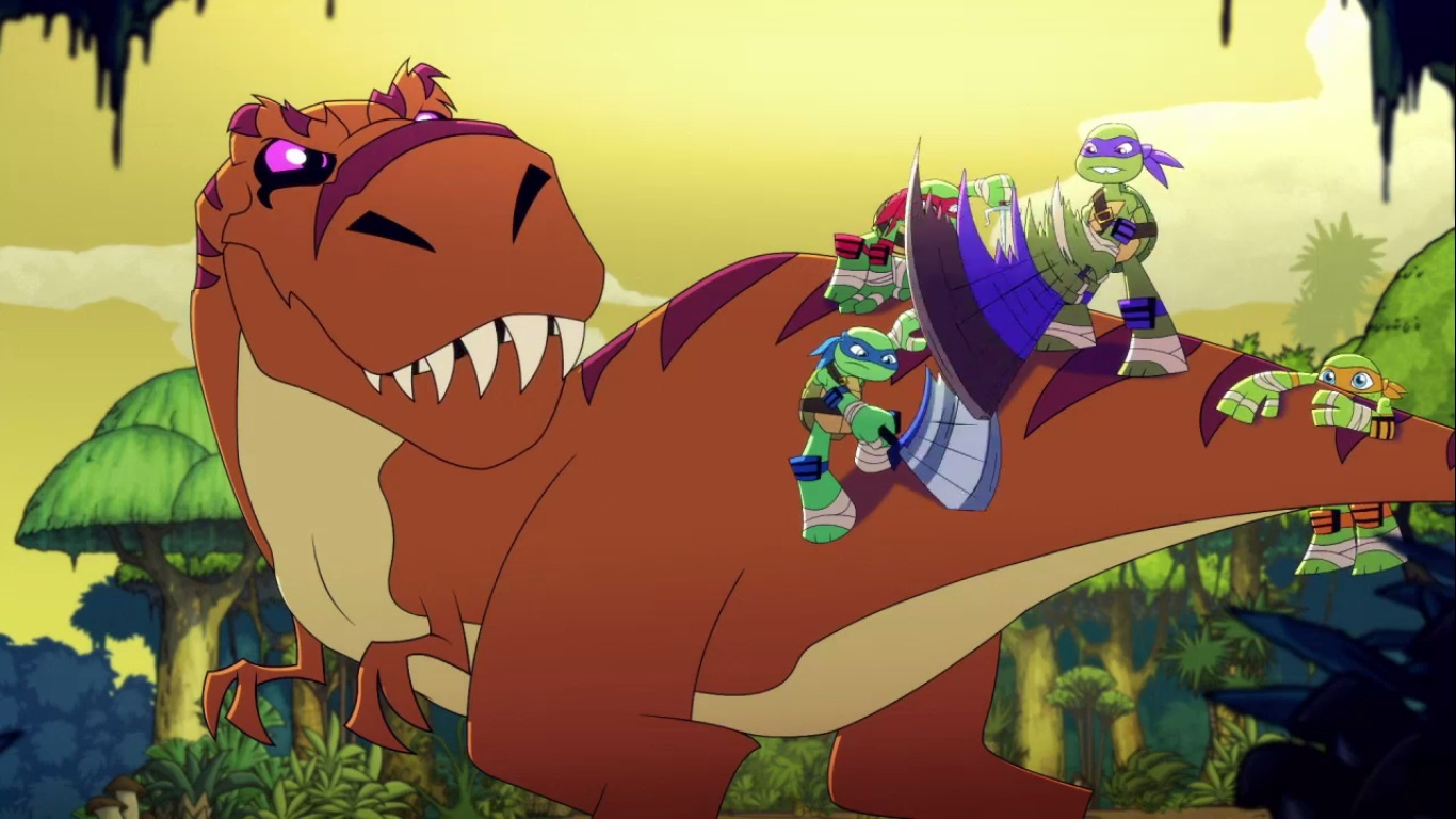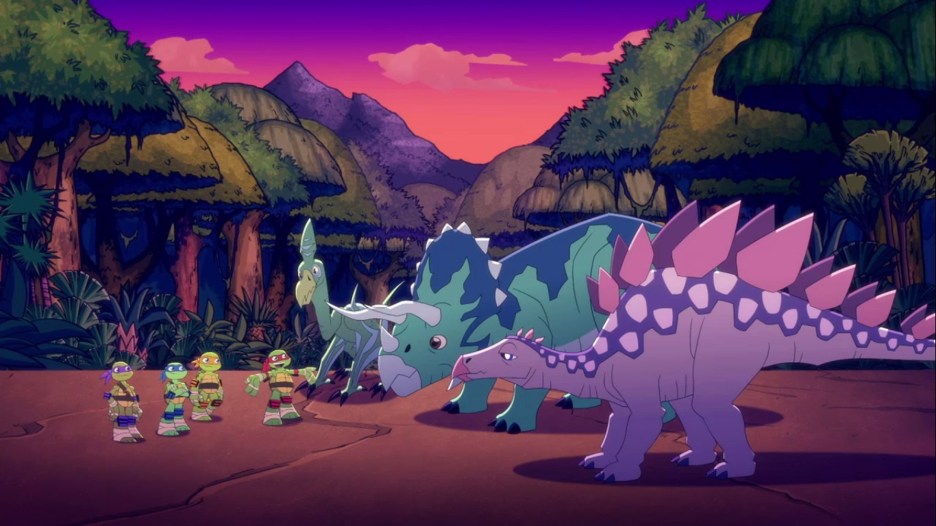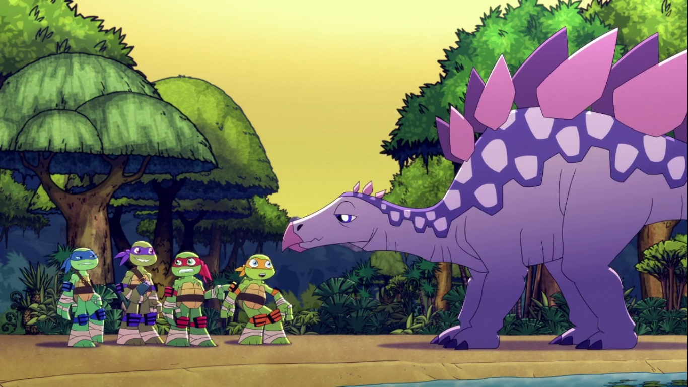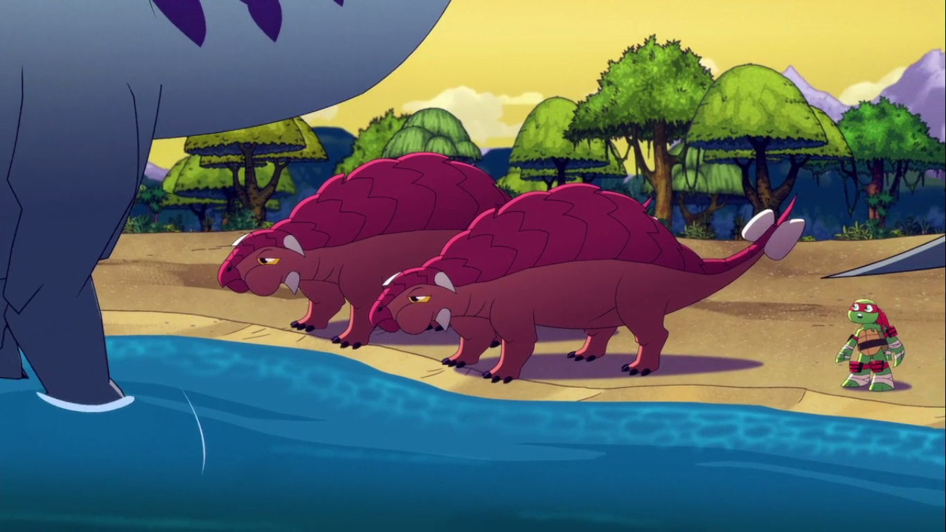 Dans la forêt, les tortues avançaient à dos de dinosaure, sauf Donatello qui n’avait pas le sien. Michelangelo était sur son stégosaure, Leonardo sur le tricératops et Raphael avec le ptérodactyle qu’il avait aidé précédemment. Mais soudain ils furent arrêtés par le tyrannosaure, qui avait retrouvé leurs traces. Ils prirent leurs jambes à leur coup, et Michelangelo les mena vers une grotte. Le cératopsidé les suivit et bloqua l’entrée de son imposant corps. Sans autre issues, les tortues n’avaient guère de solution. Michelangelo proposa alors à Donatello de faire la paix avec la créature lui donnant une part de pizza. Pas très enthousiaste à l’idée de dompter le roi des dinosaures avec une part de pizza, la tortue s’avança méfiante.