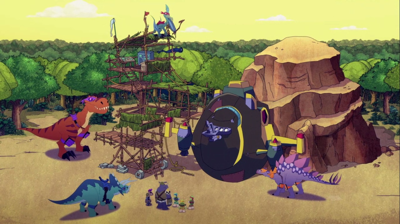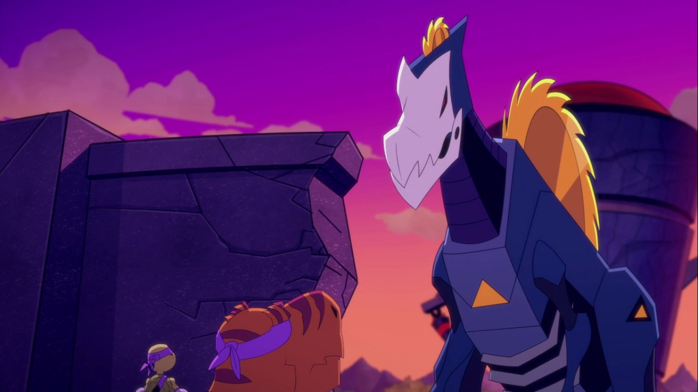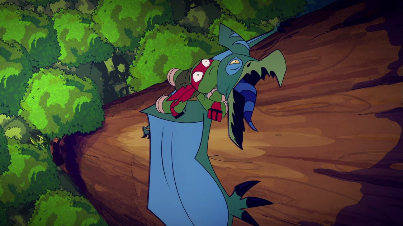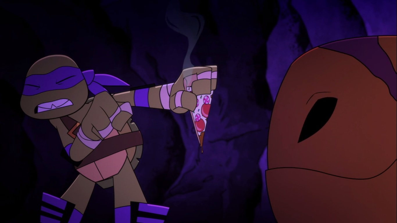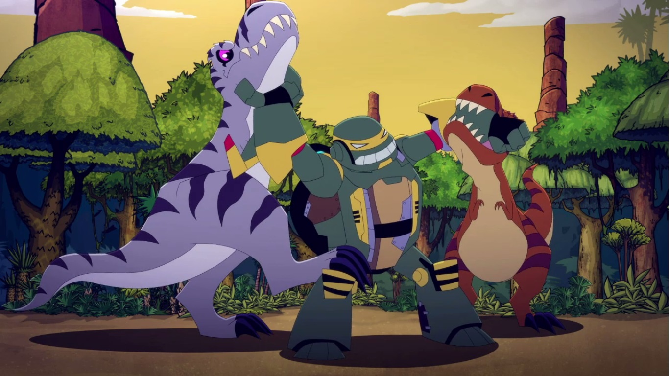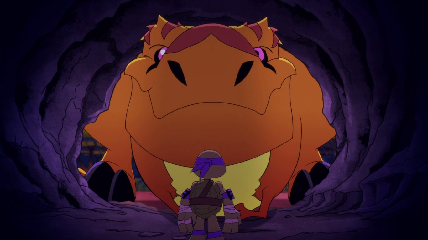 Dans la forêt, les tortues avançaient à dos de dinosaure, sauf Donatello qui n’avait pas le sien. Michelangelo était sur son stégosaure, Leonardo sur le tricératops et Raphael avec le ptérodactyle qu’il avait aidé précédemment. Mais soudain ils furent arrêtés par le tyrannosaure, qui avait retrouvé leurs traces. Ils prirent leurs jambes à leur coup, et Michelangelo les mena vers une grotte. Le cératopsidé les suivit et bloqua l’entrée de son imposant corps. Sans autre issues, les tortues n’avaient guère de solution. Michelangelo proposa alors à Donatello de faire la paix avec la créature lui donnant une part de pizza. Pas très enthousiaste à l’idée de dompter le roi des dinosaures avec une part de pizza, la tortue s’avança méfiante.