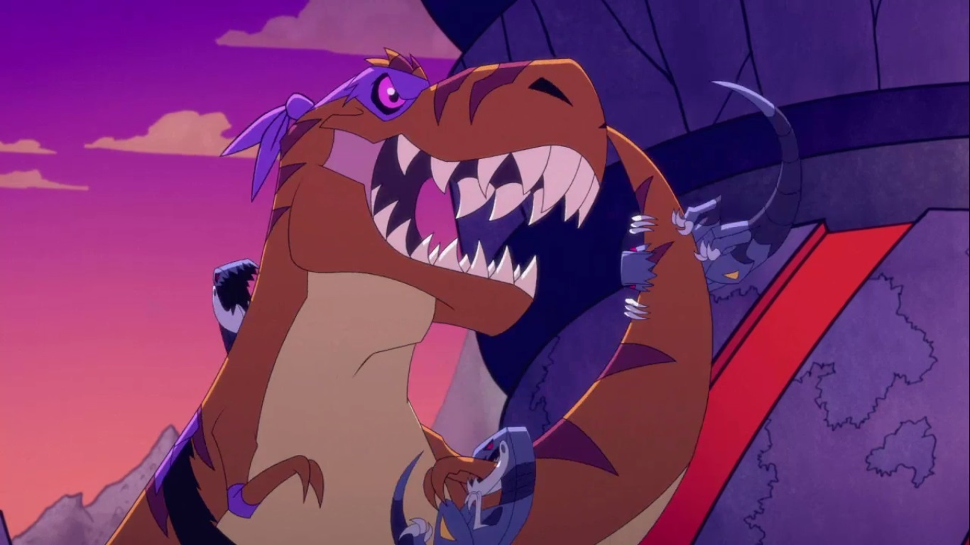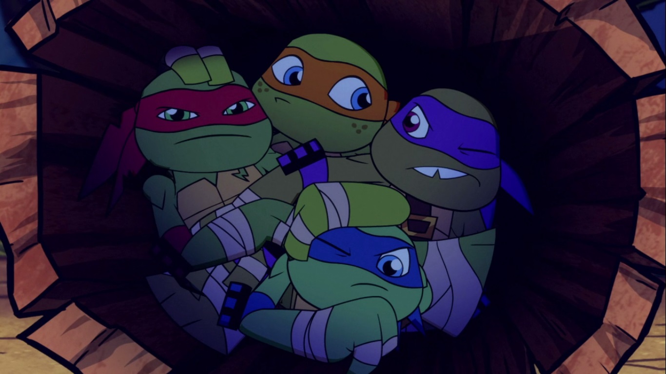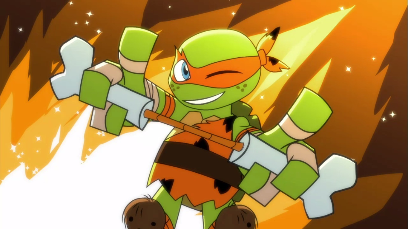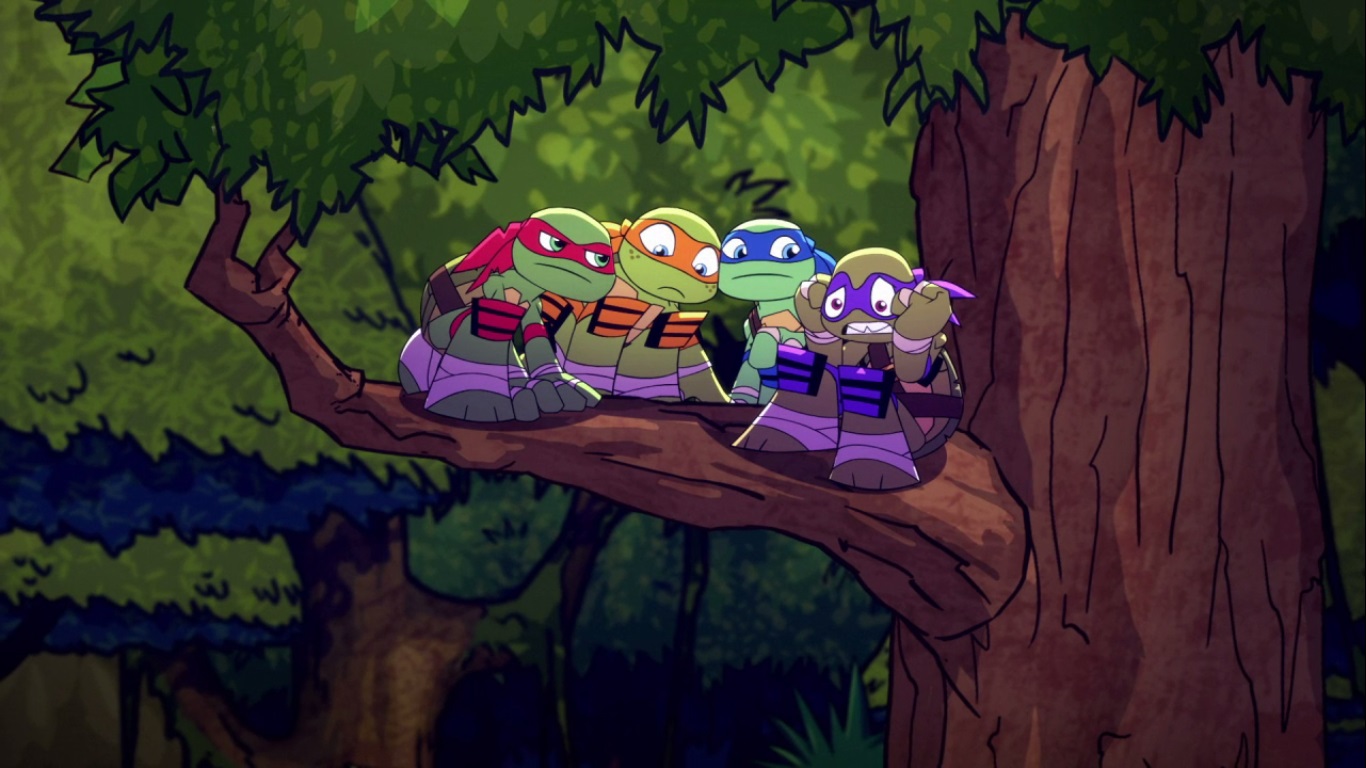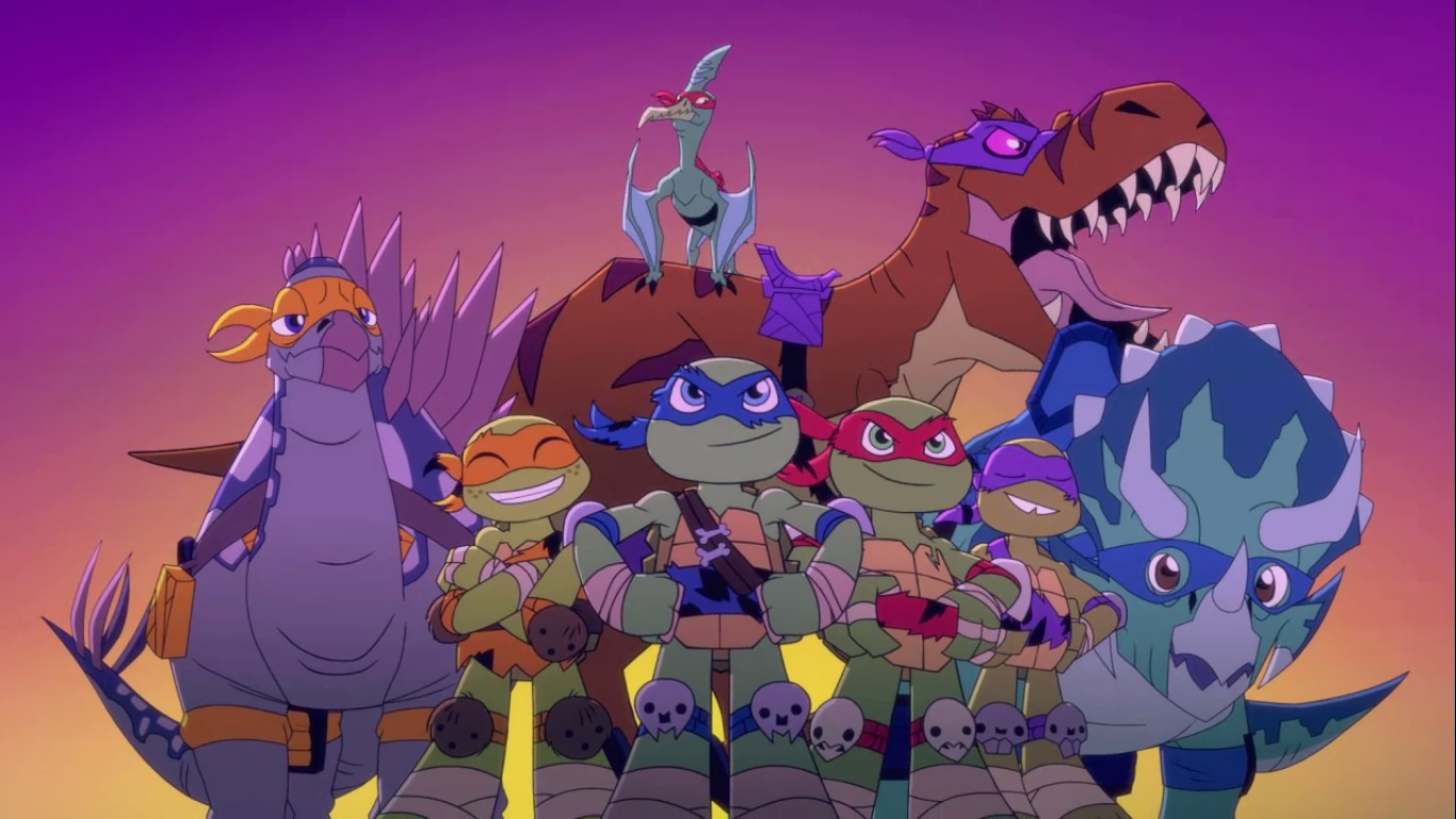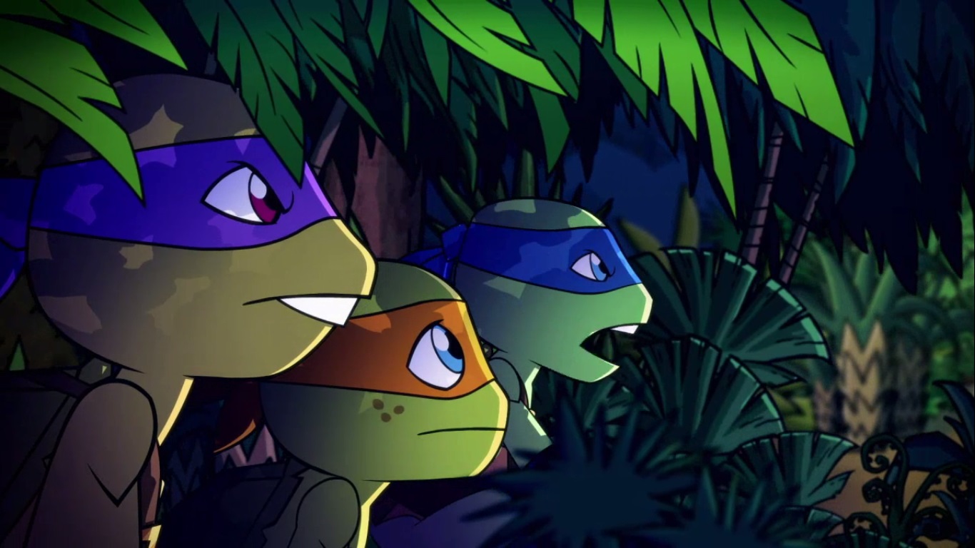 Dans la forêt, les tortues avançaient à dos de dinosaure, sauf Donatello qui n’avait pas le sien. Michelangelo était sur son stégosaure, Leonardo sur le tricératops et Raphael avec le ptérodactyle qu’il avait aidé précédemment. Mais soudain ils furent arrêtés par le tyrannosaure, qui avait retrouvé leurs traces. Ils prirent leurs jambes à leur coup, et Michelangelo les mena vers une grotte. Le cératopsidé les suivit et bloqua l’entrée de son imposant corps. Sans autre issues, les tortues n’avaient guère de solution. Michelangelo proposa alors à Donatello de faire la paix avec la créature lui donnant une part de pizza. Pas très enthousiaste à l’idée de dompter le roi des dinosaures avec une part de pizza, la tortue s’avança méfiante.