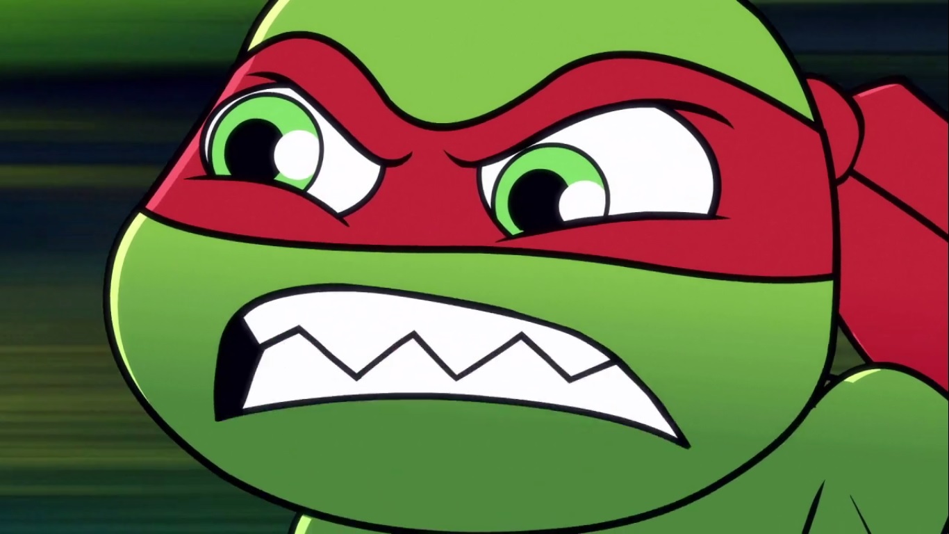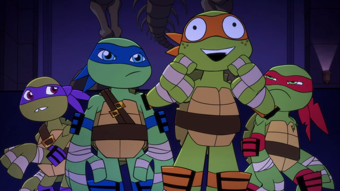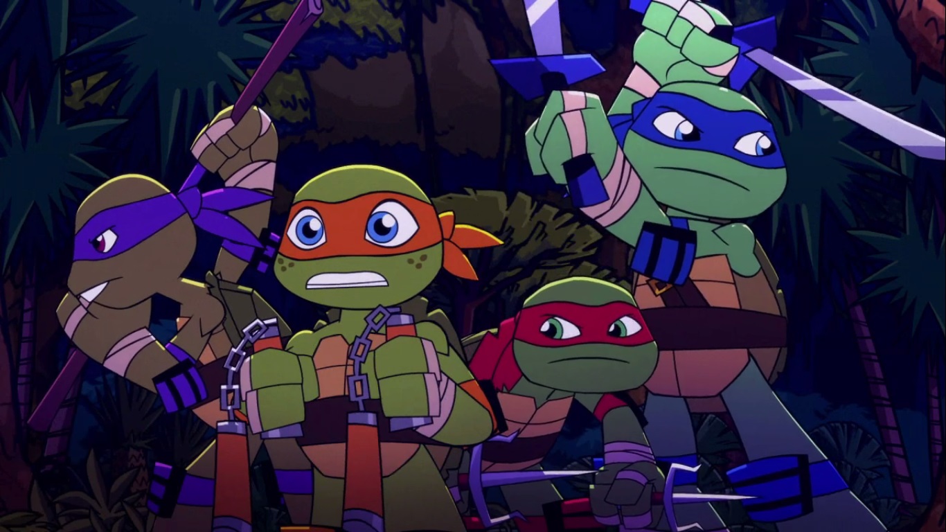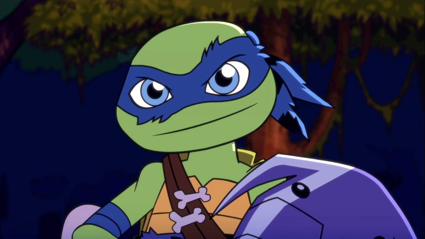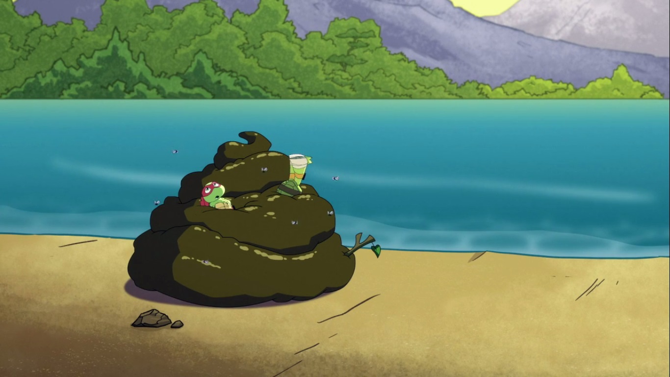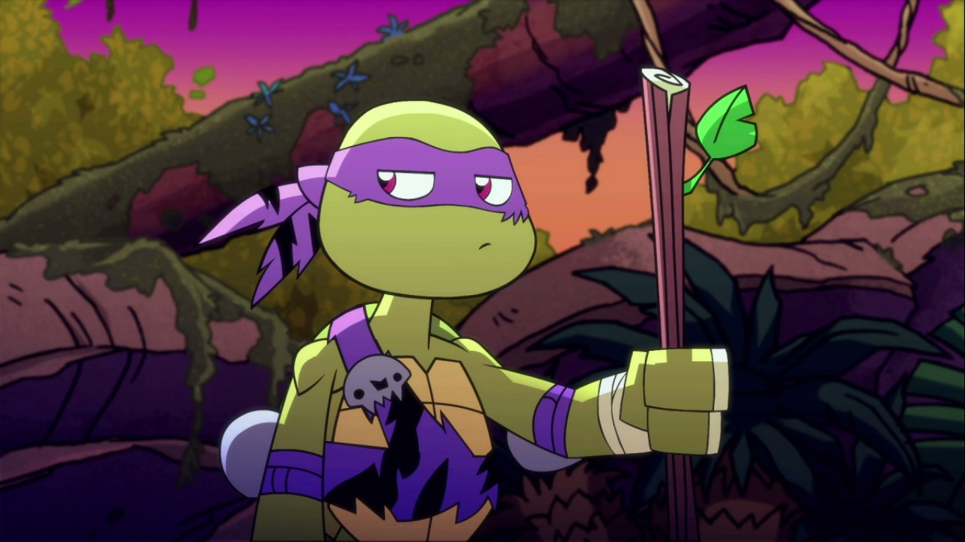 Dans la forêt, les tortues avançaient à dos de dinosaure, sauf Donatello qui n’avait pas le sien. Michelangelo était sur son stégosaure, Leonardo sur le tricératops et Raphael avec le ptérodactyle qu’il avait aidé précédemment. Mais soudain ils furent arrêtés par le tyrannosaure, qui avait retrouvé leurs traces. Ils prirent leurs jambes à leur coup, et Michelangelo les mena vers une grotte. Le cératopsidé les suivit et bloqua l’entrée de son imposant corps. Sans autre issues, les tortues n’avaient guère de solution. Michelangelo proposa alors à Donatello de faire la paix avec la créature lui donnant une part de pizza. Pas très enthousiaste à l’idée de dompter le roi des dinosaures avec une part de pizza, la tortue s’avança méfiante.