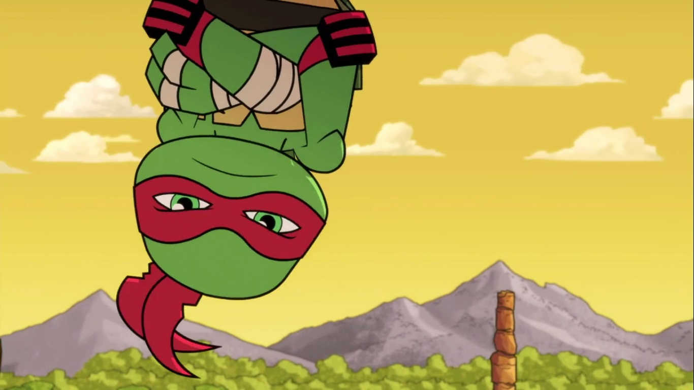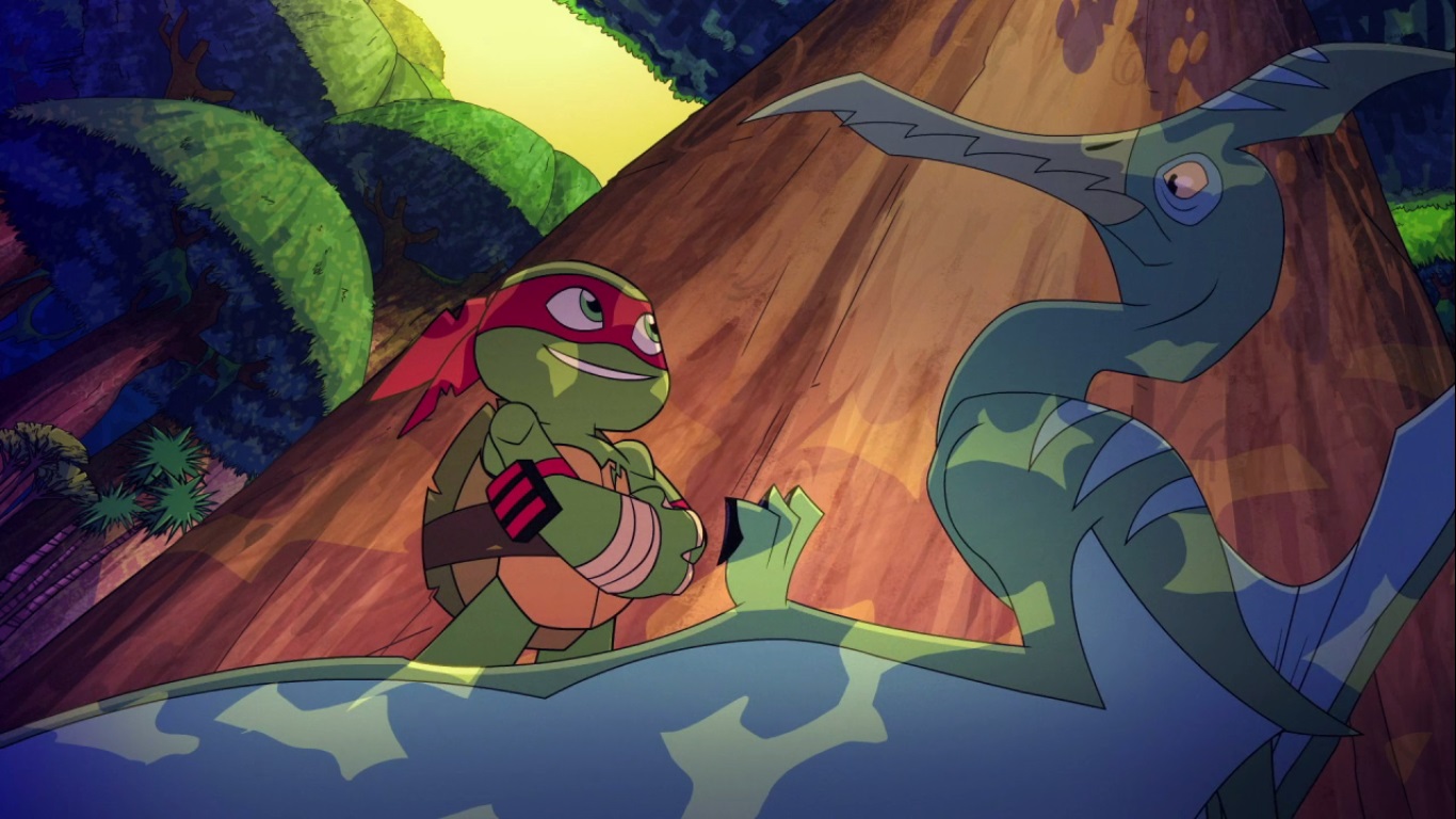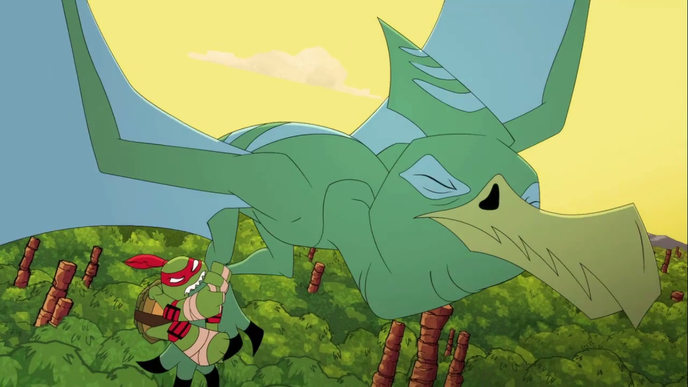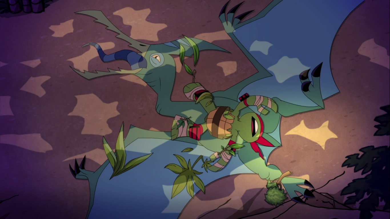 La tortue en question en avait assez de cette époque, de ces dinosaures. Il décida de s’attaquer au ptérodactyle, agacé d’être balloté dans les airs. Ils s’écrasèrent tous deux contre une falaise. Raphael se releva immédiatement, armes en mains. Mais le dinosaure était blessé, et ne parvenait plus à s’envoler. Raphael eut pitié de lui et essaya de le rassurer avant de lui soigner son aile abîmée avec les moyens du bord. Après cela le dinosaure put reprendre son envol.