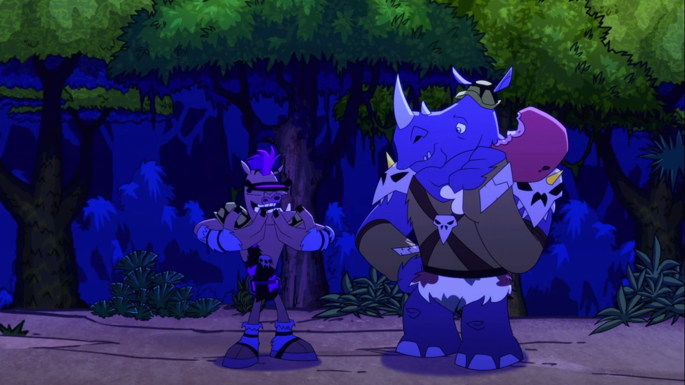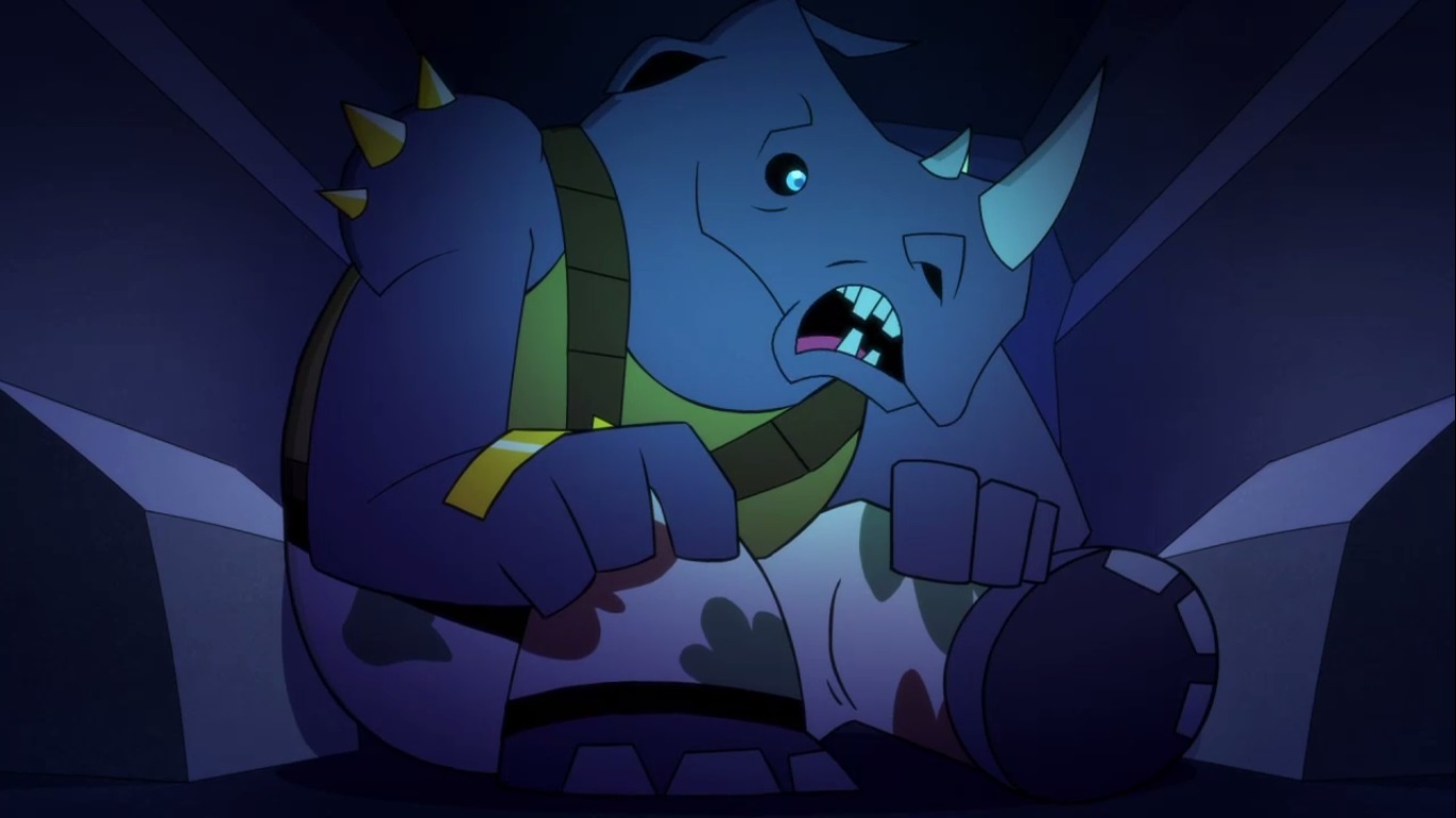 Du côté de Bebop et Rocksteady, les choses ne semblaient pas aller si mal aux premiers abords. Ils s’étaient confectionnés de nouveaux vêtements avec des peaux et des végétaux2et avaient même réussit à chasser un animal pour le manger. Mais leur chance ne dura pas longtemps, des créatures étaient derrière eux. C’étaient des Triceratons. Ils furent capturés.