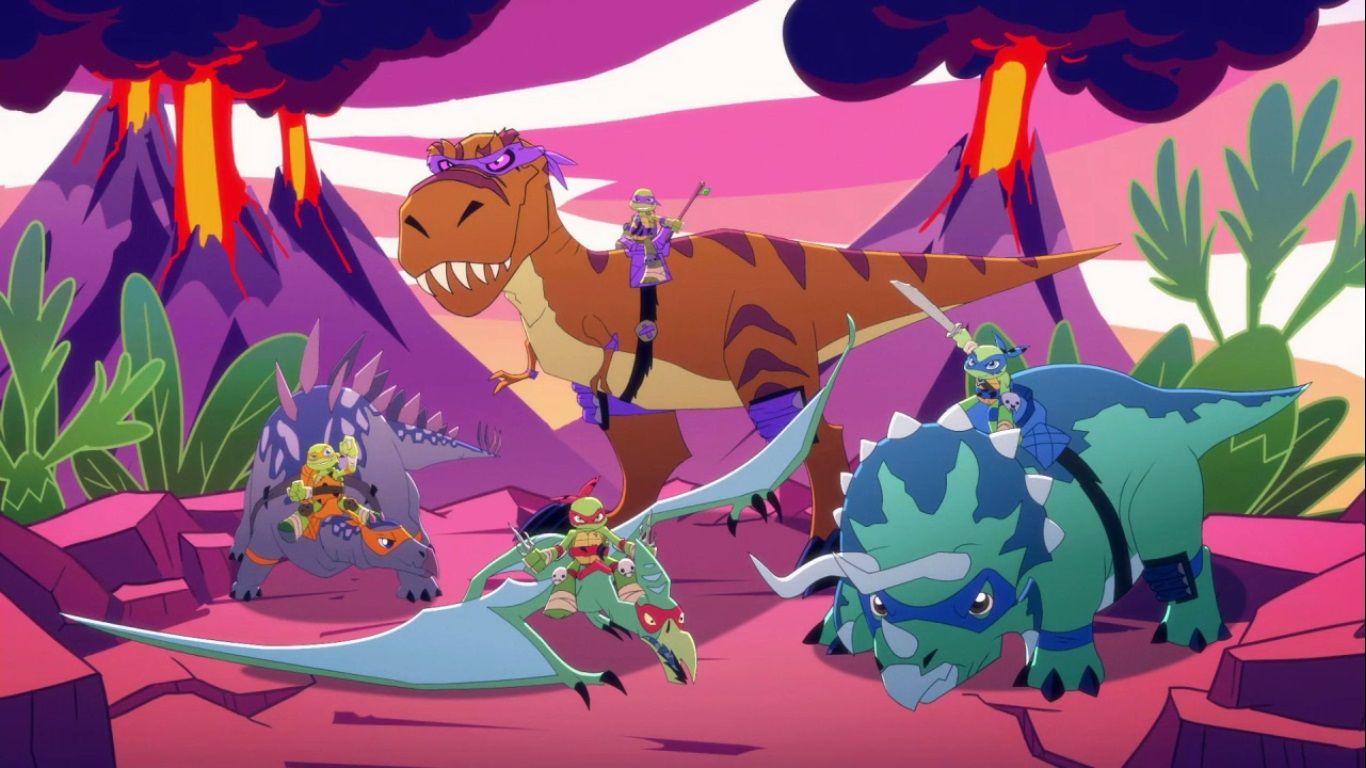 Soudain, le vaisseau réapparu en plein jour. Les tortues virent face à elle des volcans et eurent à peine le temps de les éviter, éjectant avec la force centrifuge Bebop et Rocksteady, avant de s’écraser. Sortant du Shell Former, elles n’en croyaient pas leurs yeux : des dinosaures partout ! D’après