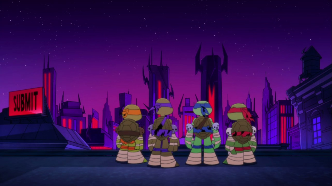 Mais un futur étrange, sombre. New York était lugubre, remplie de panneaux ordonnant l’obéissance. La statue de la Liberté était remplacée par une d’un Shredder conquérant, les armes des tortues à ses pieds. Il fallait passer à l’action !