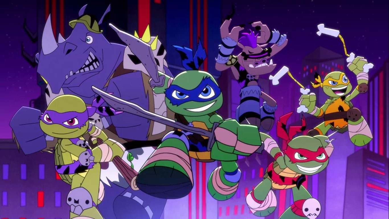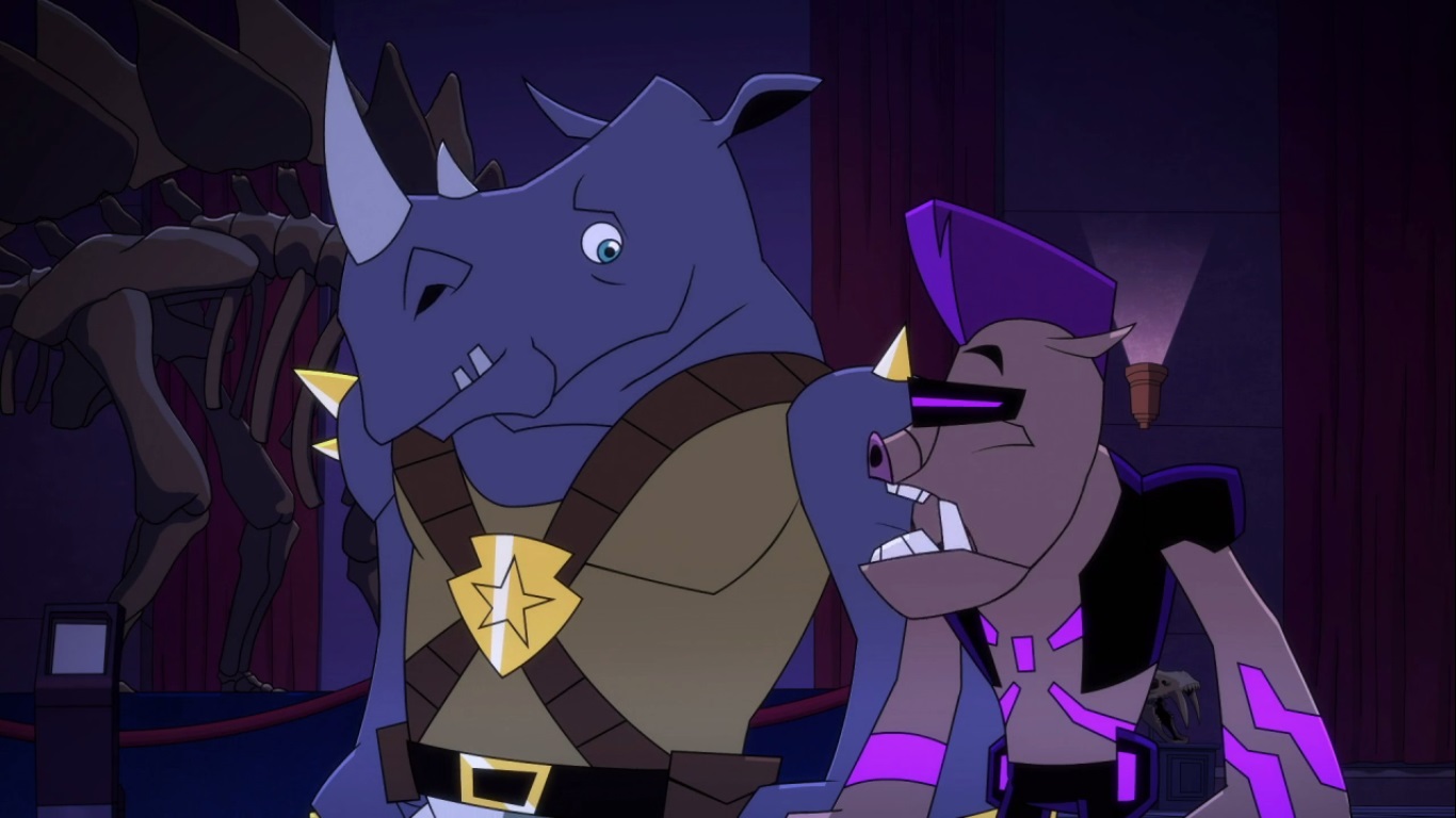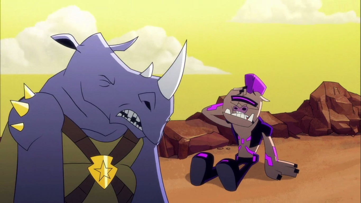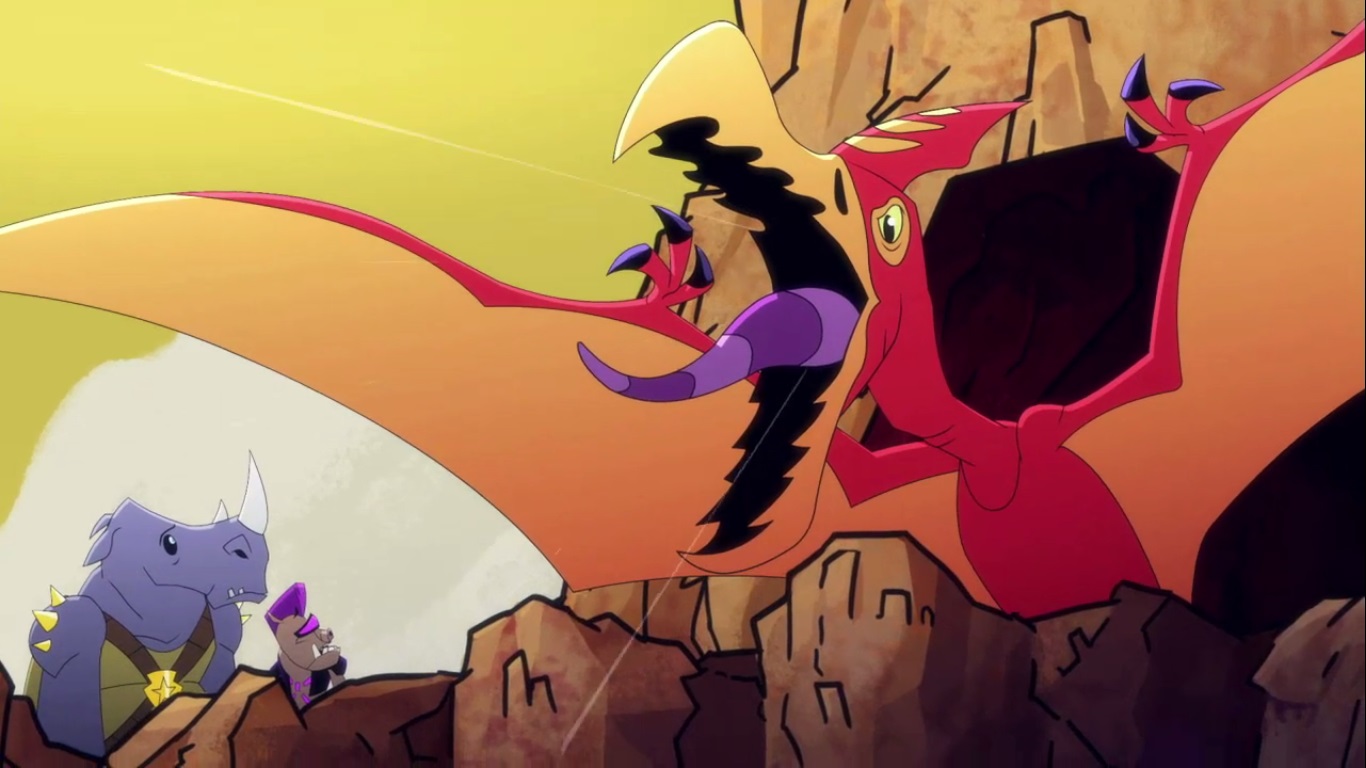 Au sommet d’une falaise, Bebop et Rocksteady se remettaient péniblement de leur chute depuis le Turtlebot. Leur réveil fut des plus brutal, car ils ne savaient absolument pas où ils étaient. Mais soudain, ils virent quelque chose sortir d’une caverne à côté d’eux : un ptérodactyle.