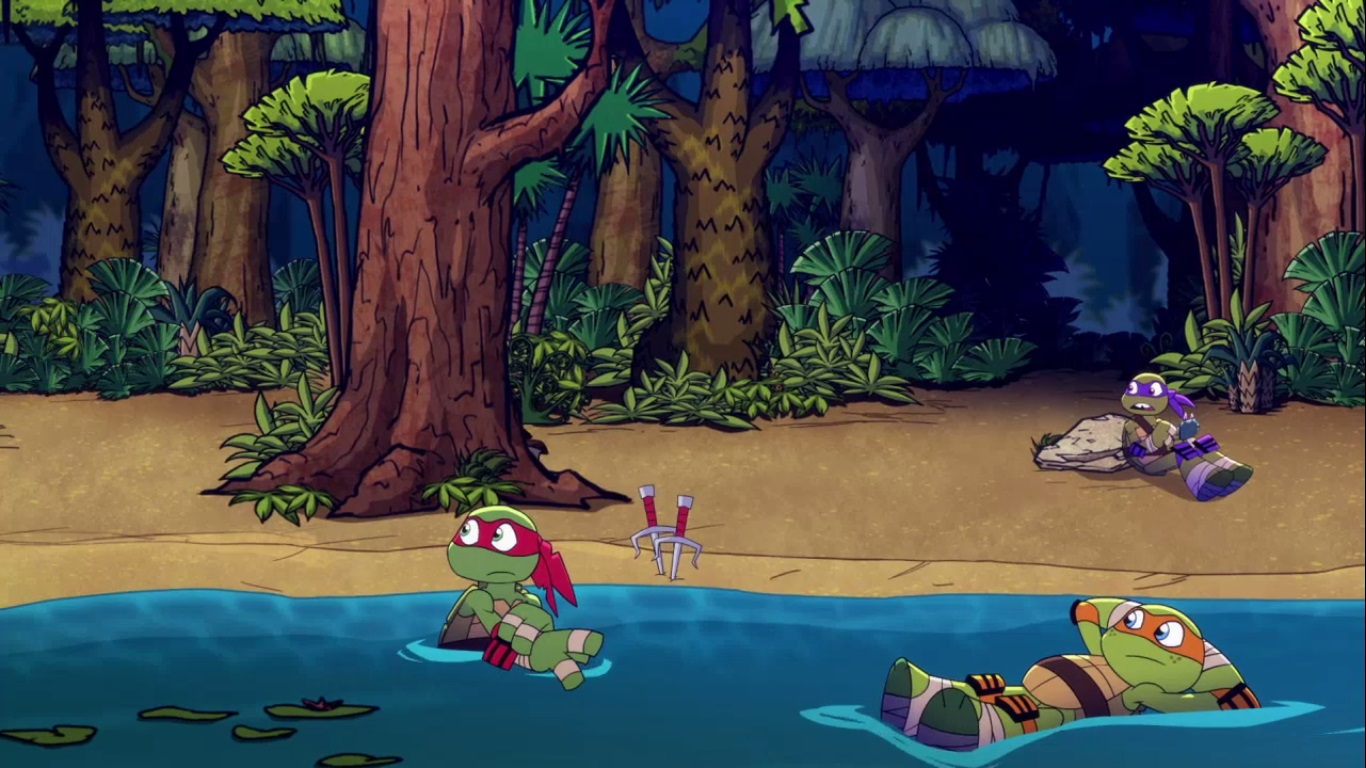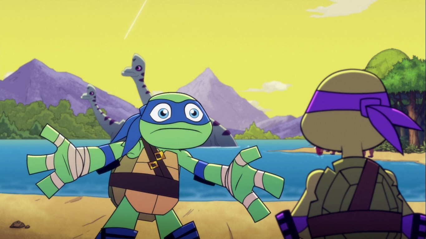 Leonardo tentait d’apprivoiser un tricératops à sa manière, avec un radis géant. Cela marchait ! Un peu trop même, le dinosaure en demandait encore plus. Il lança la tortue sur son dos, et commença un rodéo dans le secteur, jusqu’à précipiter Leonardo dans un marais. Ce fut ensuite au tour de Raphael de connaître une mésaventure, lorsqu’un compsognathus lui vola un de ses saïs.