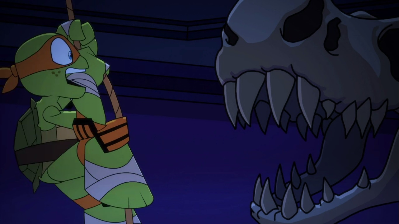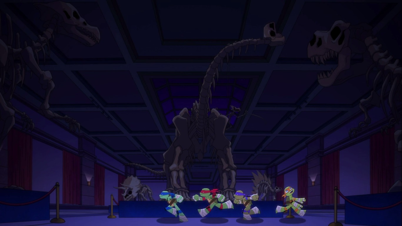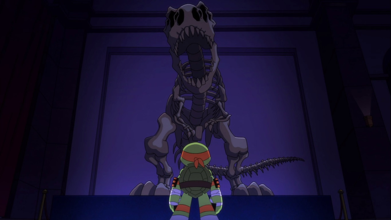 Une fois arrivées au musée, les tortues passèrent par le toit pour rejoindre la pièce principale. Michelangelo se retrouva nez à nez avec le crâne d’un tyrannosaure alors qu’il descendait avec une corde et tomba, ce qui risquait de briser l’effet de surprise des tortues avec le bruit. Leonardo lui rappela de ne toucher à rien, ce qui allait être très dur pour Michelangelo. Malheureusement la tentation était trop forte, et la tortue toucha juste un petit orteil du tyrannosaure.