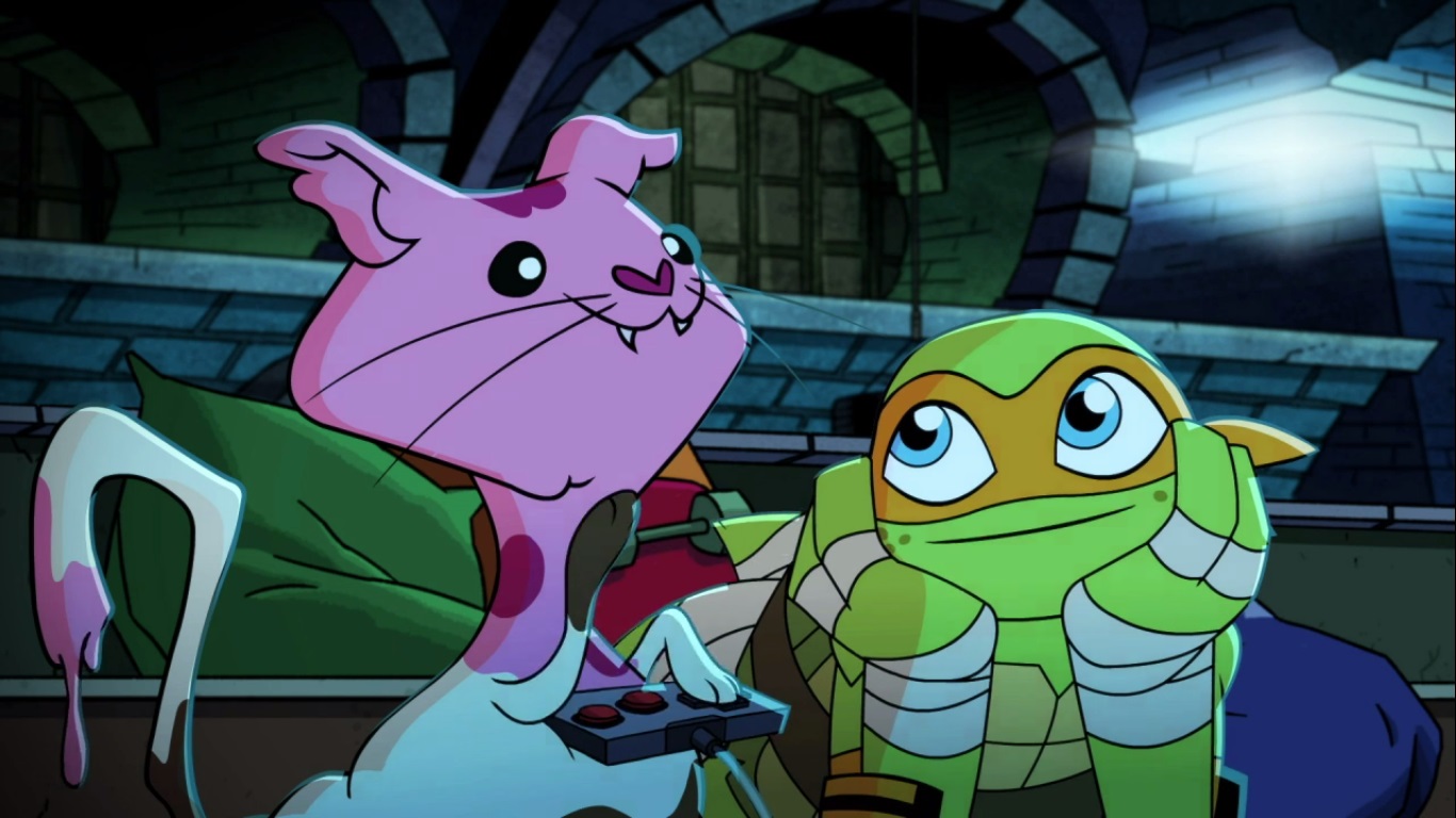 - Michelangelo, voyant un stégosaure, demande à ses frères s’il pouvait le garder. « Est-ce qu’on peut le garder ? » est un running gag de la tortue dans les différents univers quand il découvre quelqu’un ou quelque chose auquel il s’est attaché, comme Klunk ou encore April O’Neil.