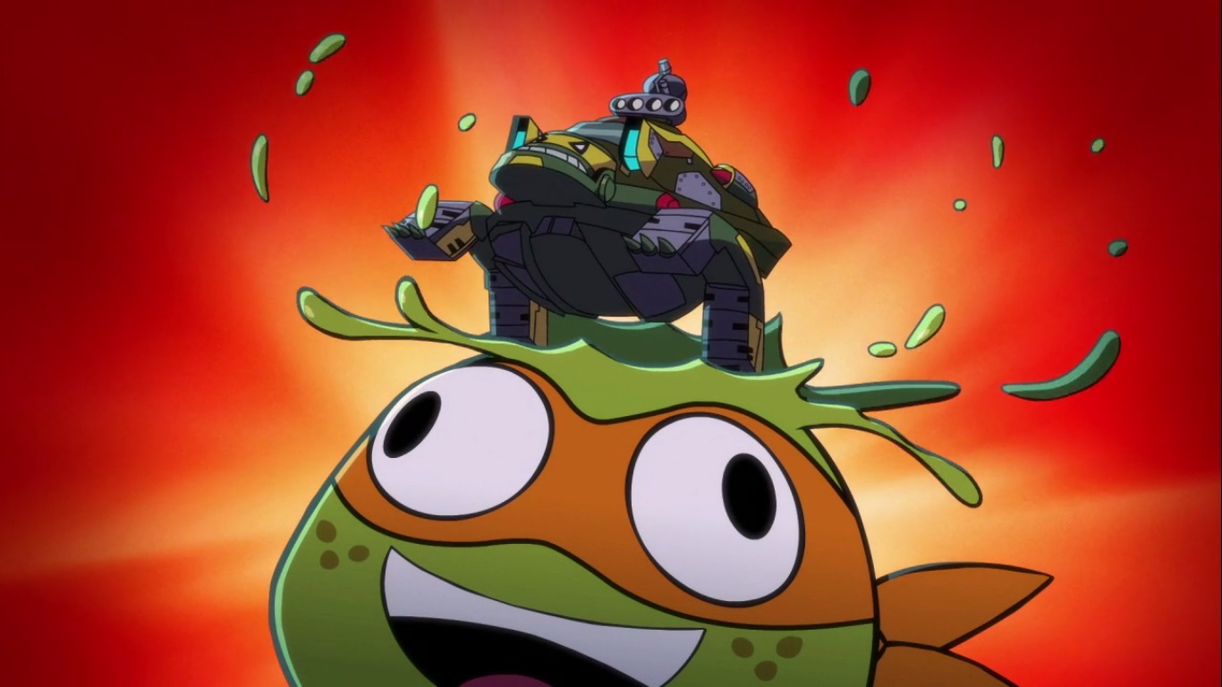 Les sous-vêtements des soldats Triceratons, après que leurs uniformes aient été soufflés par l’explosion du robot spinosaure affichent des têtes de tortues ninja⇑
