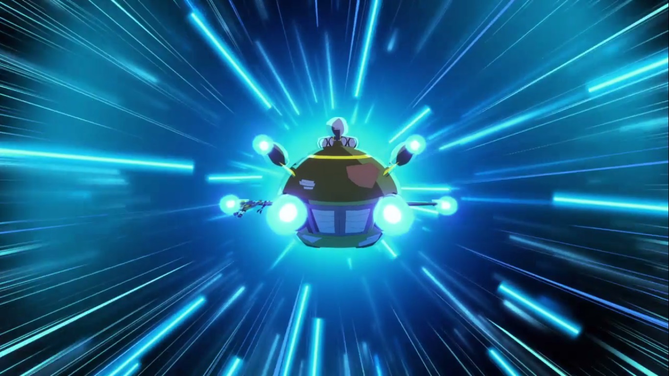 Mais ils eurent à peine le temps de se cramponner à une aile du véhicule que Donatello enclencha l’hyper vitesse de son vaisseau. Ils manquèrent de heurter la tour du T.C.R.I. mais au moment de rentrer en contact avec le bâtiment, ils disparurent.