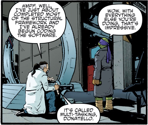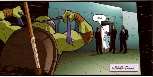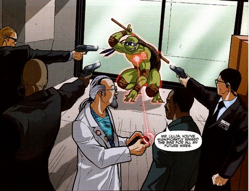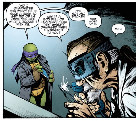 Donatello s’était également rendu à l’exposition après avoir reçu une invitation lorsqu’il se trouvait sur le chat. Il put assister à la démonstration infructueuse du gantelet anti-gravité de Harold, admiratif, et ignorant qu’il s’agissait de son rival virtuel. Il décida de le suivre quand il vit les hommes de Stockman lui demander de les accompagner. Il fut immédiatement découvert quand le scientifique proposa à Harold Lillja de lui livrer une tortue. Harold était entre deux chaises. On lui tendait la main pour pouvoir poursuivre ses recherches, mais travailler pour des personnes louches, avec des armes ne lui plaisait pas.