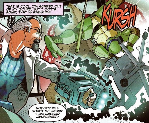 Quand il découvrit l’identité de Donatello, qu’il connaissait en tant que DUZ_MACHINES_84, il n’hésita pas à l’attaquer avec son invention. Il ne voulait plus se faire écraser par personne. Il voyait son moment de gloire revenir. Donatello dut redoubler d’arguments pour convaincre le scientifique de ne pas faire confiance à Stockman. Alors que les gros bras armés firent irruption dans la pièce, Harold accepta de s’allier à Donatello, qu’il trouvait plus intelligent en vrai que sur les réseaux sociaux. La tortue lui conseilla de revoir certains détails sur l’alimentation de son appareil, qui drainait son énergie directement sur son porteur. Harold était épuisé. Donatello eut l’idée de prendre le gantelet pour les faire s’échapper de la pièce (TMNT Micro-series #3 : Donatello).