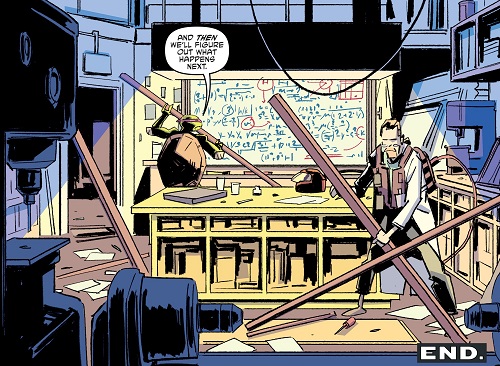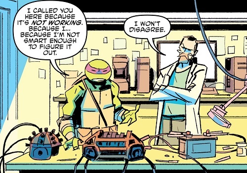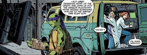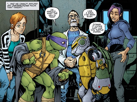 L’équipe scientifique fut appelée par April après la disparition mystérieuse de Donatello et de Venus (TMNT #145). Elle espérait obtenir les avis de personnes qui s’y connaissaient réellement en sciences, pour savoir ce qu’elle devait faire avec le portail qu’ils avaient ouverts à l’aide du QNA. Mais les nouvelles étaient loin d’être réjouissantes (TMNT #147).