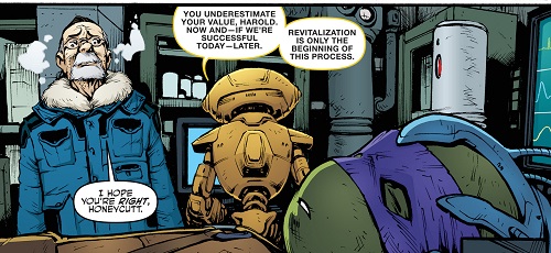Après presque une année de rupture, Harold accepta de voir Donatello dans son laboratoire. La tortue voulait lui demander de l’aide dans la conception d’un appareil pouvant venir à bout de Metalhead, Mais le vieil homme grincheux s’énerva très rapidement, voyant que la tortue se montrait avare et lui demandait à présent de l’aide pour vaincre tous leurs ennemis. Lillja n’accepta qu’une seule chose, laisser quelques-uns de ses appareils à la tortue pour qu’elle les étudie. Hors de question d’en faire plus après tous les dégâts causés, à ses appareils comme ses proches.