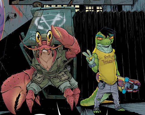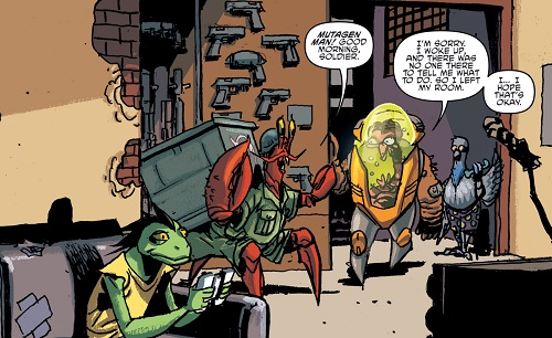 - Sur le forum anglophone The Technodrome, nous apprenons que l’idée l’un crabe dans une poubelle vient de Bobby Curnow. Toutefois, il a entièrement été façonné par Mateus Santolouco. En effet, l’idée originelle était de le faire se cacher dans une poubelle classique, cylindrique. Santolouco a proposé de le mettre dans une poubelle plus grosse avec son matériel de guerre pouvant sortir sur les côtés (IDW’s TMNT – An oral history, TMNT #95, p. 28).