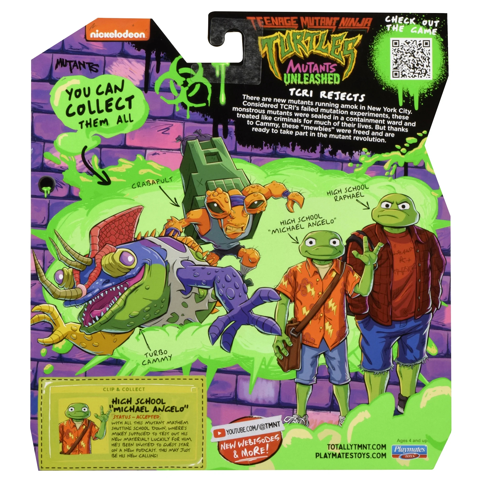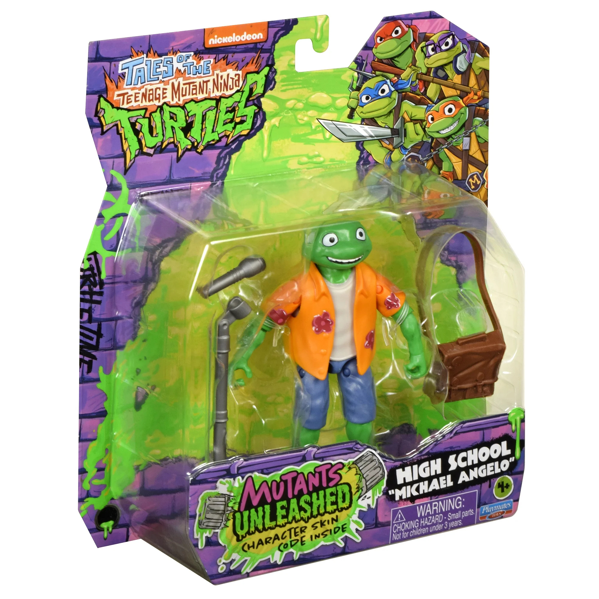 Parallèlement à la sortie des figurines Mix & match en août 2024, Playmates Toys a également proposé quatre figurines de base inspirées du jeu Mutant unleashed et exclusives à l’enseigne Walmart. Parmi elles, Michelangelo en habit d’écolier. Dans le blister se trouvait un code pour obtenir le skin du personnage dans le jeu Mutants Unleashed.