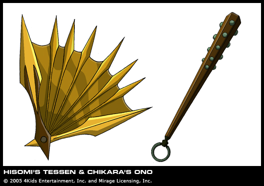 - Son arme de prédilection est un tessen qu’il peut replier pour former une dague.
