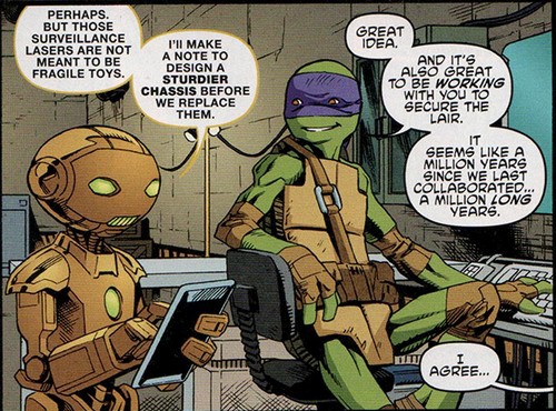 idw-tmnt-micro-series-8-fugitoid-6-tortues-ninja-turtles-tmntDurant quatre mois, Honeycutt chercha à mettre au point un portail interdimensionnel avec son collègue Felix afin de prendre un tournant décisif dans la guerre. Il travailla également sur l’End Missile, une arme capable de désactiver les armes des soldats de Krang, se basant sur leur fréquence.
