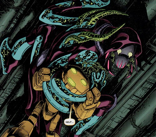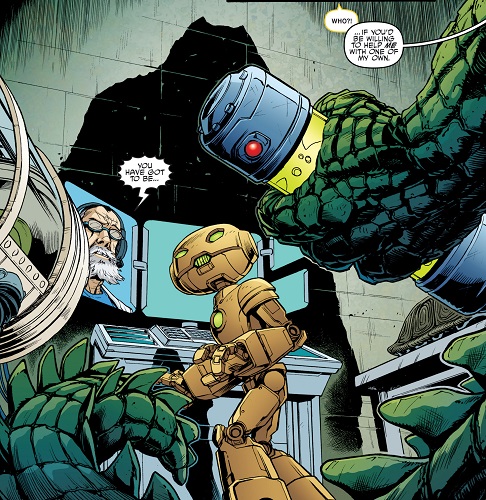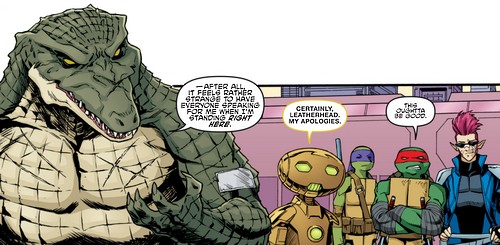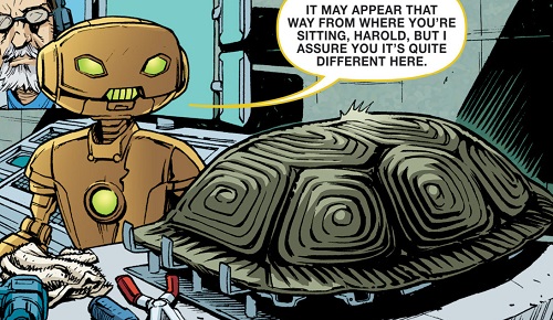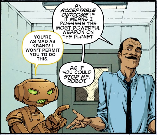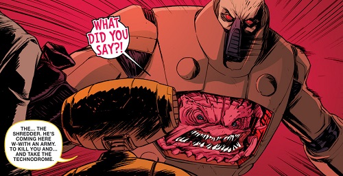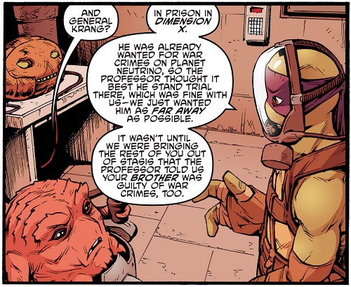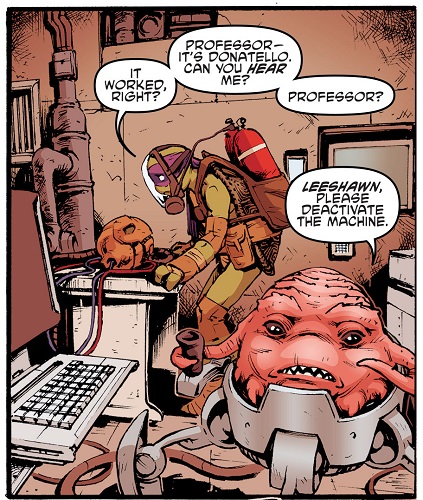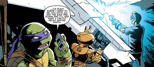 Après ses investigations sur StockGen, April voulut s’entretenir avec lui un soir, à Central Park afin d’en savoir plus sur le laboratoire où elle travaillait. Il resta très distant et méfiant. Soudain, Dask et son commando de neutrino arrivèrent et enlevèrent le professeur, malgré l’intervention des tortues, qui furent également téléportées à Smada lors du départ des soldats (TMNT #17). C’était le roi Zenter qui avait demandé son rapatriement au plus vite pour qu’il puisse aider Felix, survivant des bombardements, à achever l’End Missile pour arrêter Krang (TMNT#19). C’est ainsi qu’Honeycutt révéla son visage actuel, celui d’un robot à l’armure dorée, à la grande surprise des tortues. Mais Krang avait fait prisonnier la reine et le roi et demandait le professeur idw-tmnt-20-13-fugitoid-krang-tragg-tortues-ninja-turtles-tmntHoneycutt en échange. Cela lui aurait permis non seulement de l’empêcher de lui nuire en aidant les neutrinos, mais en plus de pouvoir achever plus rapidement son Technodrome.