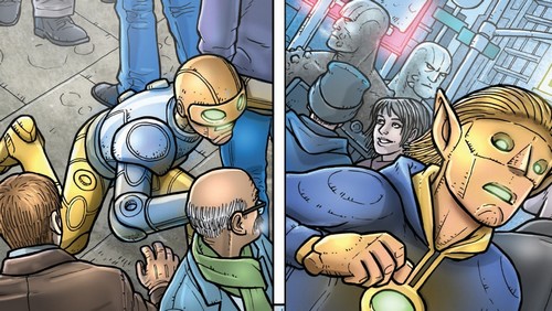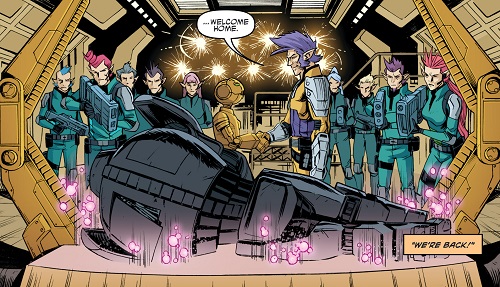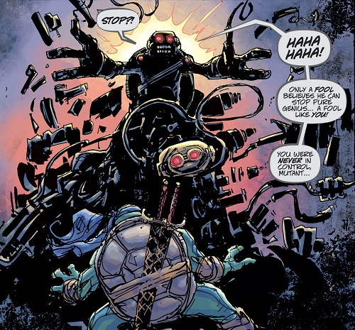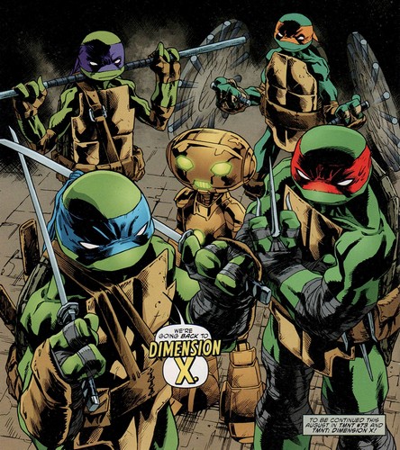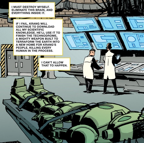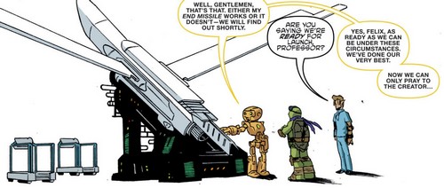Ils se mirent alors au travail avec l’aide de Donatello qui était aux anges face à tant de technologies nouvelles et réussirent à arrêter à temps les armées de Krang. Les soldats mis en déroute et arrêtés, Krang n’eut d’autres choix que de prendre la fuite. Il captura malgré tout le Fugitoid, qui dû se rendre en échange de la vie de Michelangelo. Il était fatigué de voir tant de vies perdues à cause de lui. Il préféra se livrer (TMNT #20).