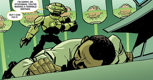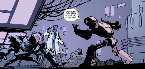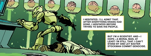 utrom-empire-2-comic-idw-1-fugitoid-baxter-utrom-tortues-ninja-turtles-tmntTravaillant dur pour achever le Technodrome, le professeur Honeycutt cherchait par tous les moyens une solution d’en finir avec sa vie et surtout qu’aucun scientifique de Krang ne parvienne à mettre la main sur les données conservées dans son disque dur. Même en se jetant d’une falaise de Burnow Island et terminant en pièces dans la mer, ils réussirent à le retrouver et le réparer correctement. Alors qu’un ouragan sévissait sur l’île, il dut prêter main forte au général Krang qui était bien décidé à remettre le courant dans ses locaux, constatant que quelqu’un avait vidé les cuves de stase des utroms (Utrom Empire, part. 2). Il savait qu’il s’agissait du travail de Baxter mais préféra ne rien dire à son sujet. Il ne craignait pas pour lui, mais bien pour les terriens si Krang l’apprenait. Dissimulant les preuves, il lui fit croire que Stockman l’avait aidé à stabiliser les cuves. Cela lui permettait également de garder la main mise sur Stockman qui voulait le tuer (Utrom Empire, part. 3).