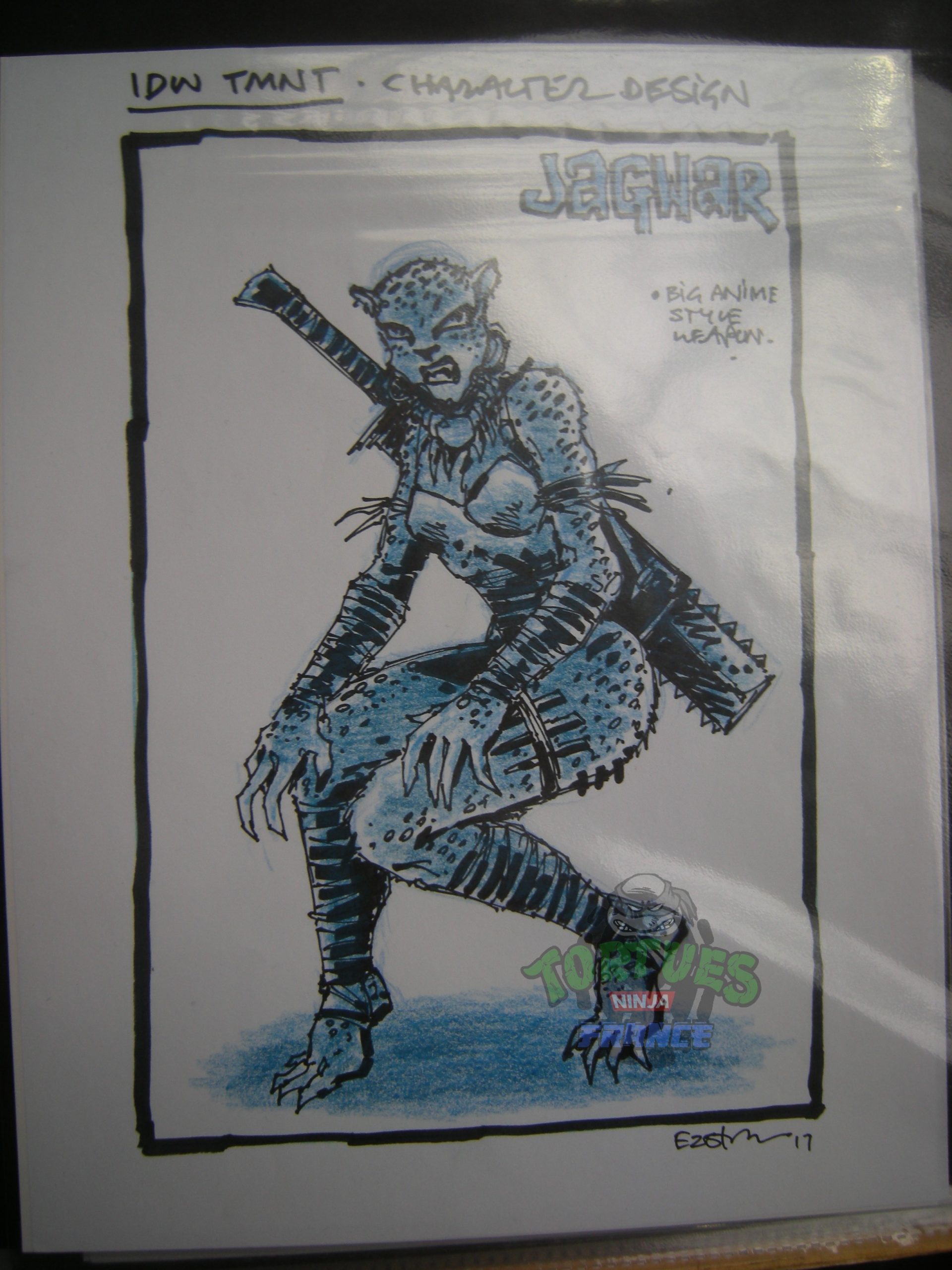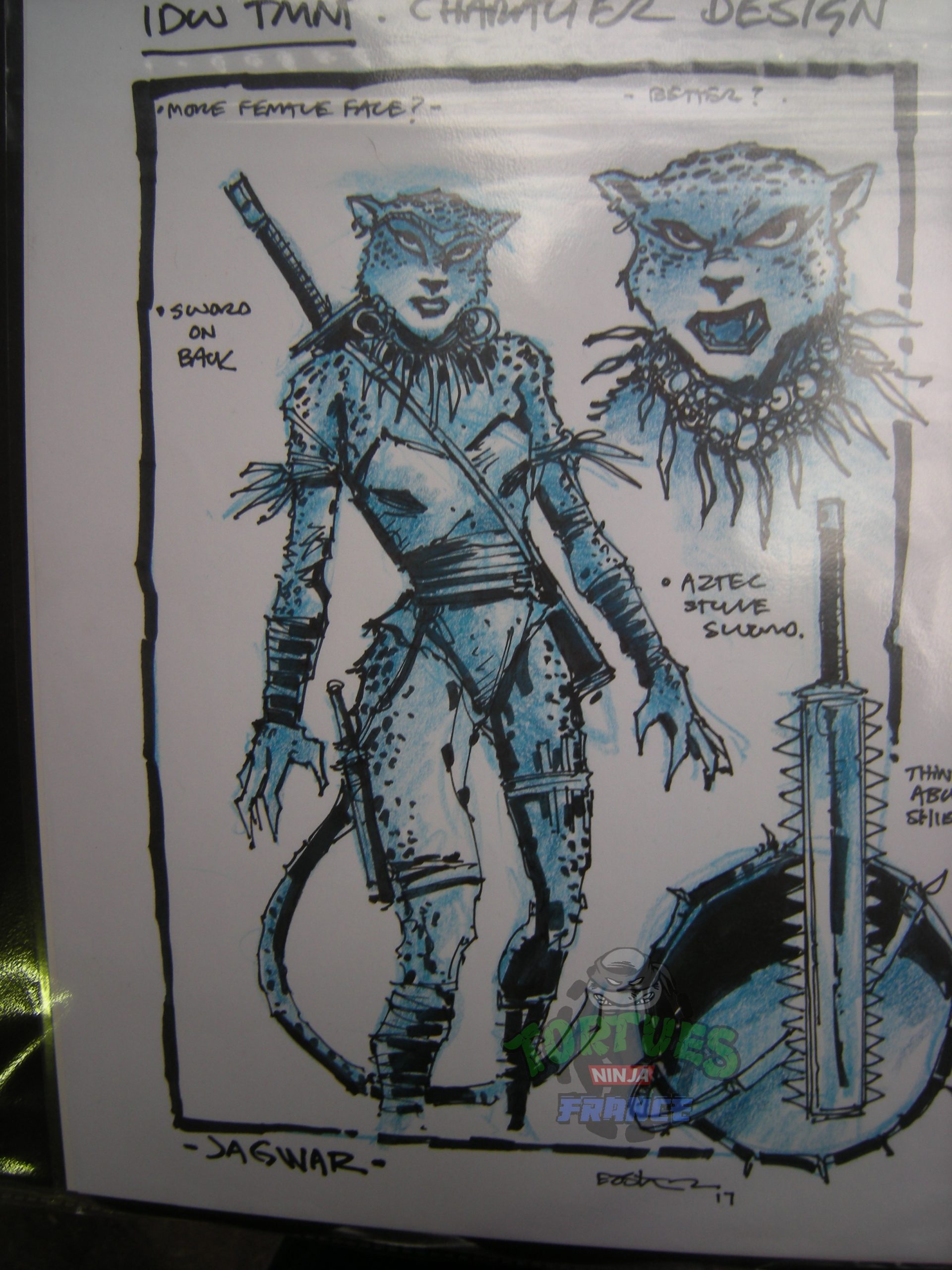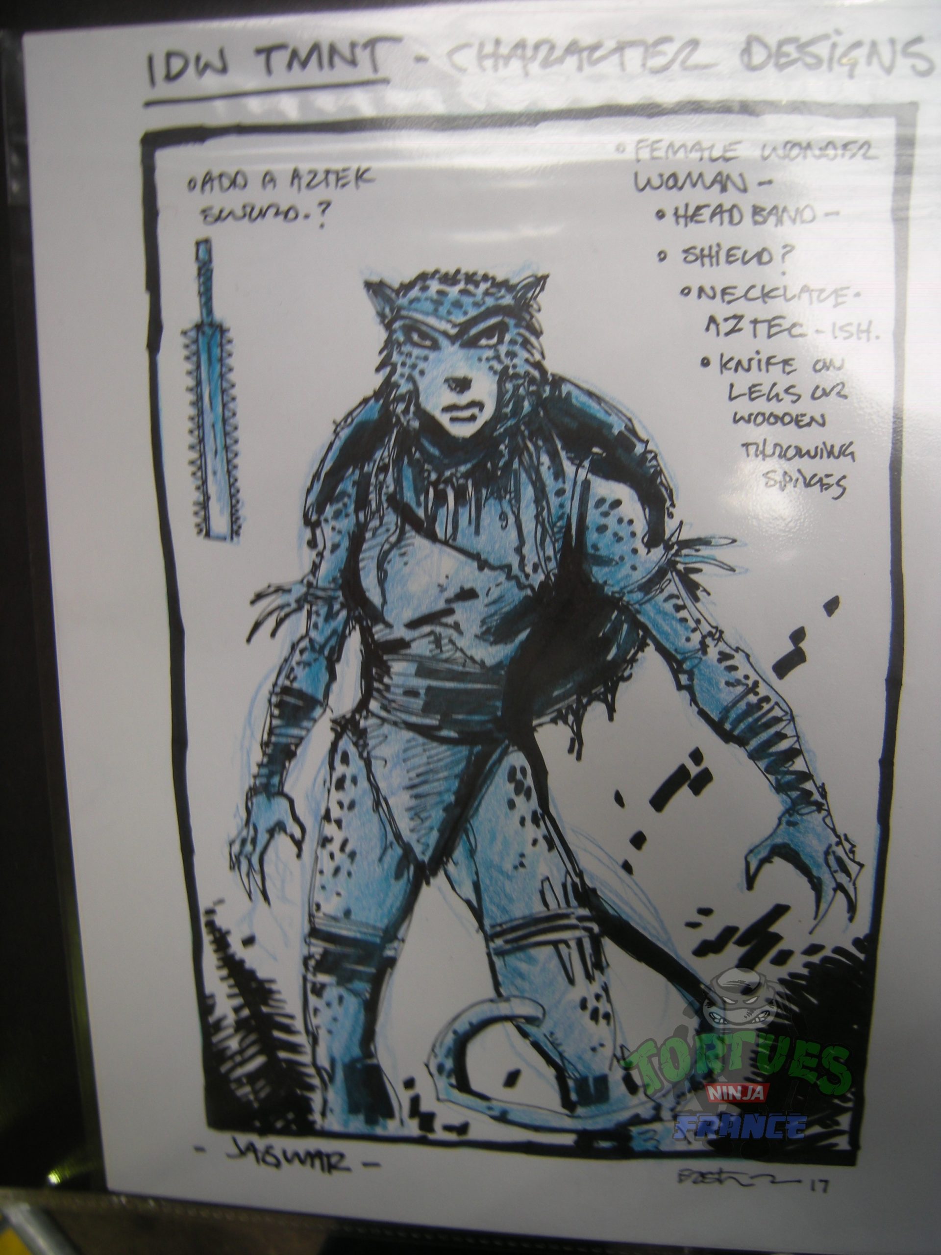 - Le personnage de Jagwar a été vu à la Comic Con de Bruxelles parmi les nombreux dessins en vente de Kevin Eastman et révélé sur le Tortuepédia le 26 février 2017. D’après l’interview exclusive concédée par Eastman à notre site, elle était un membre du Pantheon. D’origine aztèque, elle est peut-être à l’origine de Tezcatlipoca.
